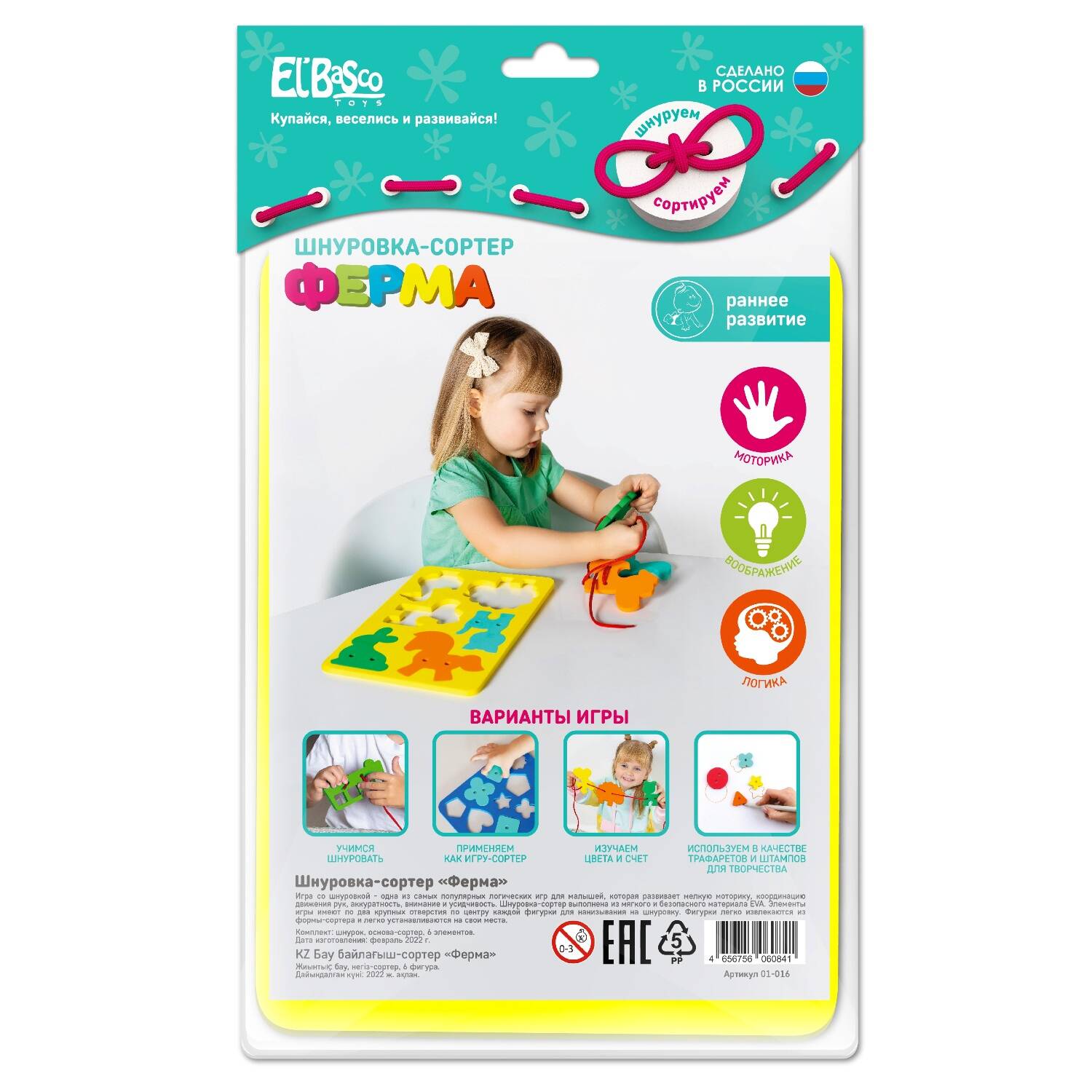 Игра со шнуровкой для детей - одна из популярных логических игрушек. Развивает мелкую моторику, координацию движения рук, внимание и усидчивость, навыки конструирования, ориентацию на плоскости, аккуратность. Игра яркая и занимательная, поэтому всегда будет привлекать интерес дошкольника. Шнуровки выполнены из мягкого, прочного, нетоксичного и абсолютно безопасного материала. В наборе Шнуровка-сортер "Ферма" собраны различные виды транспорта разных цветов и размеров. Детали имеют по два крупных отверстия по центру каждой фигурки. Фигурки легко извлекаются из формы сортера и легко устанавливаются на свои места.| Издательство | Я РАСТУ ТОЙЗ ООО |