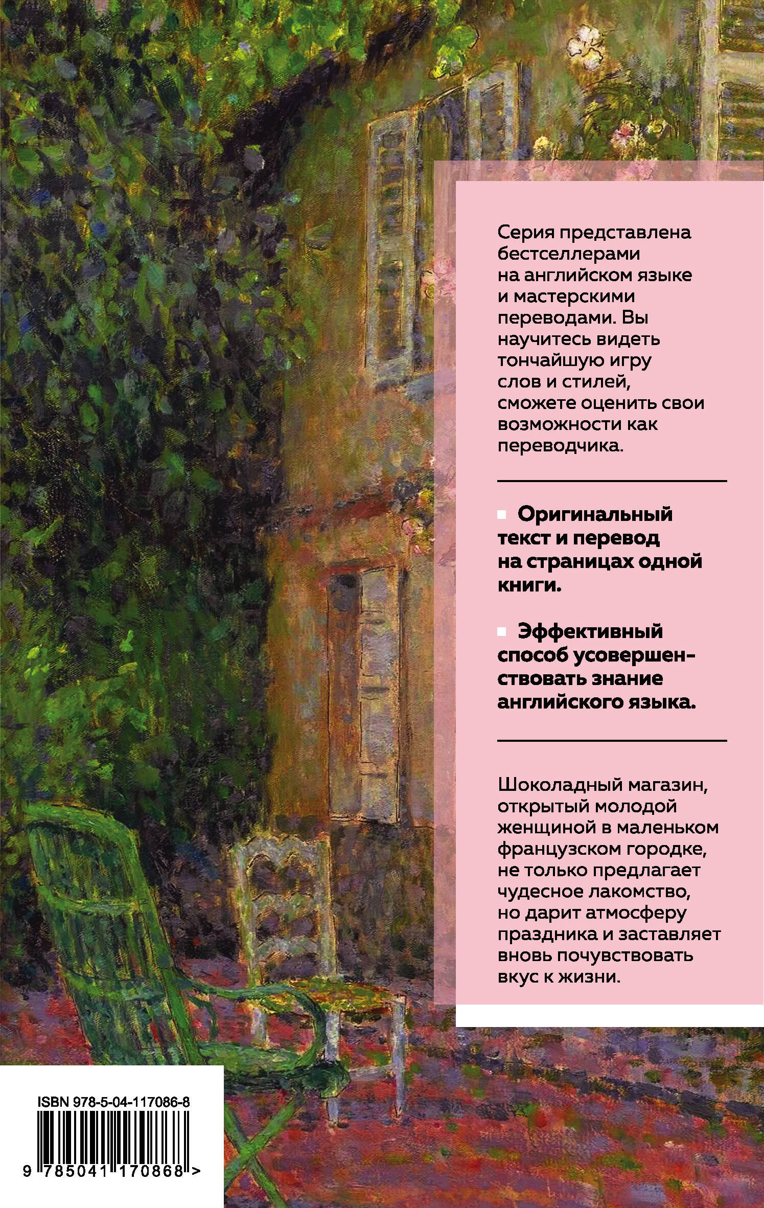 Читайте на двух языках. Серия представлена бестселлерами на английском языке и мастерскими переводами на русский, вы научитесь видеть тончайшую игру слов и стилей, сможете оценить свои возможности как переводчика. Шоколадный магазин, открытый молодой женщиной в маленьком французском городке, не только предлагает чудесное лакомство, но дарит атмосферу праздника и заставляет вновь почувствовать вкус к жизни. «Я верю, что самое главное на свете - это быть счастливым! Счастье. Невзыскательное, как бокал шоколада, или непростое, как сердце. Горькое. Сладкое. Настоящее».| Издательство | ООО "Издательство "Эксмо" |