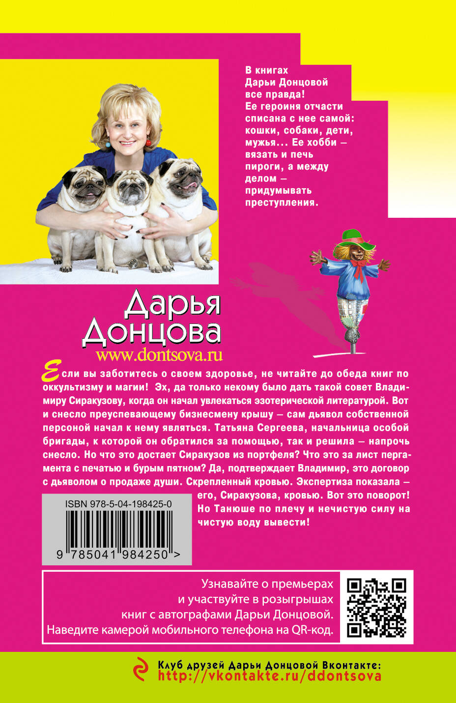 Если вы заботитесь о своем здоровье, не читайте до обеда книг по оккультизму и магии! Эх, да только некому было дать такой совет Владимиру Сиракузову, когда он начал увлекаться эзотерической литературой. Вот и снесло преуспевающему бизнесмену крышу - сам дьявол собственной персоной начал к нему являться. Татьяна Сергеева, начальница особой бригады, к которой он обратился за помощью, так и решила - напрочь снесло. Но что это достает Сиракузов из портфеля? Что это за лист пергамента с печатью и бурым пятном! Да, подтверждает Владимир, это договор с дьяволом о продаже души. Скрепленный кровью. Экспертиза показала - его, Сиракузова, кровью. Вот это поворот! Но Танюше по плечу и нечистую силу на чистую воду вывести! Дарья Донцова - самый популярный и востребованный автор в нашей стране, любимица миллионов читателей. В России продано более 200 миллионов экземпляров ее книг. Детективы Дарьи Донцовой написаны в особой манере: помимо интереснейшего сюжета, в них всегда присутствует тонкий юмор, здравый оптимизм и безусловная вера в торжество добра над злом. Это всё, что нужно для отдыха, релаксации и душевного успокоения. Прочтите книги Дарьи, и ваши сердца и души наполнятся светом, оптимизмом, радостью, уверенностью в завтрашнем дне! Они заразят вас желанием жить, радоваться каждому дню и верить в лучшее. -------------------------------------------------- «Донцова невероятная работяга! Я не знаю ни одного другого писателя, который столько работал бы. Я отношусь к ней с уважением, как к образцу писательского трудолюбия. Женщины нуждаются в психологической поддержке и получают ее от Донцовой. Я и сама в свое время прочла несколько романов Донцовой. Ее читают очень разные люди. И очень занятые бизнес-леди, чтобы на время выключить голову, и домохозяйки, у которых есть перерыв 15-20 минут между отвести-забрать детей». - Галина Юзефович, литературный критик «У Дарьи вся детективная закваска всего лишь фон для раскрытия характеров, взаимоотношений между людьми. Всегда есть интрига, и до последнего эпизода непонятно, что, как и почему. В этом смысле условия жанра абсолютно выполняются. Дарья Донцова, конечно, одна из лучших». - Дмитрий Харатьян «Давно начала читать, и так втянулась! И сейчас читаю романы Дарьи. Я отдыхаю за ними. Сама Донцова интеллигентная женщина, у нее мягкий юмор и нестрашный сюжет, все с позитивом и надеждой на хороший конец. Это прекрасно». - Лариса Удовиченко| Издательство | ООО "Издательство "Эксмо" |