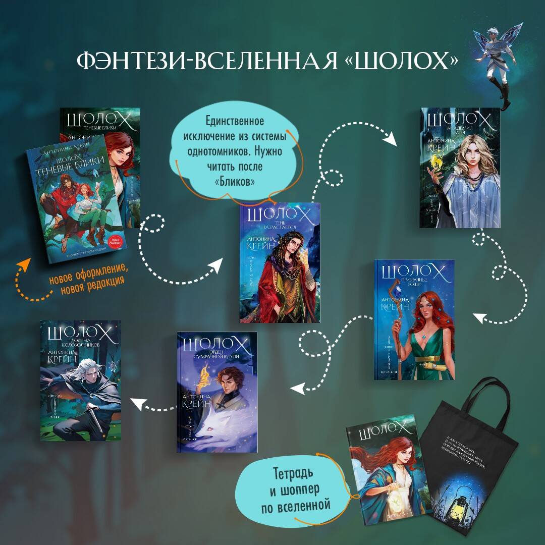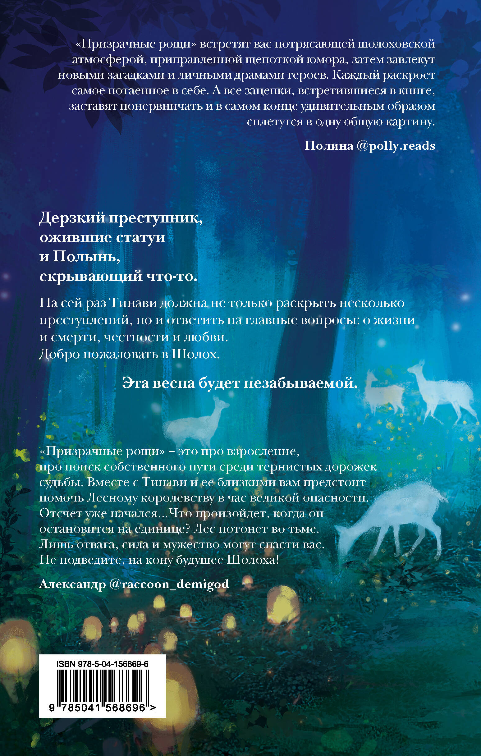 Странные дела творятся в Шолохе, столице Лесного королевства. Дерзкий преступник ведет обратный отсчет, совершая скандальные нападения и оставляя зашифрованные письма. Дети исчезают из Тернового замка - сумрачного приюта, затерянного среди болот. Полынь - лучший детектив Иноземного ведомства - что-то скрывает, а в лесу по ночам танцует призрачный культ… Ловчей по имени Тинави предстоит не только разобраться с этими загадками, но и найти ответы на главные вопросы: о жизни и смерти, честности и любви. Ведь именно от них иногда может зависеть судьба целого королевства. Долгожданная новинка популярного цикла Антонины Крейн «Шолох». Совокупный тираж первых трех книг превысил 80 000 экземпляров. Возвращаемся к любимым героям Тинави и Полыни и вновь отправляемся с ними в опасные, но захватывающие приключения. «Призрачные рощи» - часть огромной вселенной Шолоха, но роман можно читать отдельно. Чтобы погрузиться в атмосферу магического мира полностью, следует начинать знакомство с циклом с книги «Шолох. Теневые блики». Тайны, магия, новые герои и старые друзья, расследование дерзких преступлений и неповторимая шолоховская атмосфера, легкая ирония и неиссякаемая любовь к жизни - все это вы найдете в книгах Антонины Крейн.| Издательство | Эксмо |