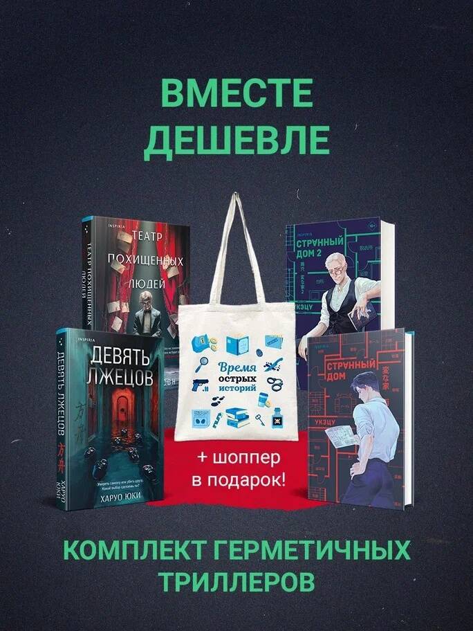 Аннотация: Шоппер + комплект из 4-х книг. Герметичные триллеры (Странный дом, Странный дом 2, Девять лжецов, Театр похищенных людей)