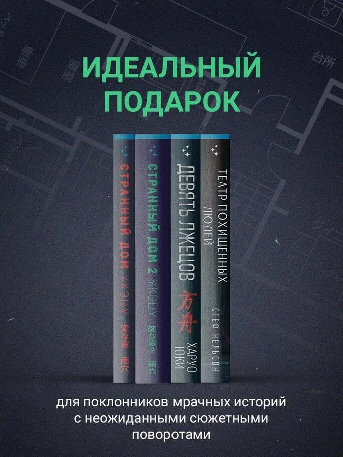 Странный дом По работе я часто сталкиваюсь с разного рода загадочными происшествиями, связанными с домами. Но эта история не похожа ни на одну другую… Когда ко мне обратился старый приятель с просьбой взглянуть на необычный план дома, который он собирался купить, мое внимание привлекло загадочное пустое пространство на первом этаже. Поэтому я написал знакомому архитектору Курихаре. Он сразу заинтересовался нестандартной планировкой, отметив несколько странностей: детскую без окон, подозрительное расположение комнат и тайный проход… Курихара выдвинул безумную теорию, которая ею бы и осталась, если бы позднее рядом с домом не нашли расчлененный труп без кисти левой руки. Ниже я привожу всю историю в хронологическом порядке. Некоторые детали скрыты с целью сохранения конфиденциальности. Странный дом 2 Два года назад я написал книгу "Странный дом" о документальном расследовании, которое мы провели с моим другом-архитектором Курихарой. К моей большой радости, эта история стала настоящей сенсацией, и одновременно с этим мне начали приходить сообщения о других домах… Оказалось, по всей Японии раскидано множество самых разных странных домов: коридоры, ведущие в никуда, потайные пространства, скрытые механизмы и комнаты без окон. Мне удалось собрать одиннадцать материалов, посвященных загадочным историям. И именно с ними я направился с Курихаре. На первый взгляд может показаться, что между этими материалами нет ничего общего. Однако при внимательном прочтении можно заметить ужасающую связь. Сумеете ли вы обнаружить эту связь? Девять лжецов Во время встречи выпускников на отдаленной вилле бывшие одногруппники отправляются в загадочный бункер. Не успевая вернуться назад засветло, они ночуют прямо в подземелье. Там их уединение нарушает странная семья, заблудившаяся в лесу. На рассвете происходит землетрясение, и выход оказывается заблокирован огромным валуном. В суматохе, пока все обыскивают этажи в поисках инструментов, случается еще одно жуткое событие - убийство… Единственный шанс спастись - освободить проход с помощью цепи и лебедки. Но тогда один из них навсегда останется в бункере. И лучший для этого кандидат - убийца. У них есть неделя, чтобы вычислить преступника и принести его в жертву. А тем временем вода с нижнего этажа прибывает все быстрее, отрезая шансы на спасение… Театр похищенных людей Когда Брук похитили по дороге домой, она считала, что ее жизнь кончена. Это было десять лет назад. Именно столько времени она вынуждена выполнять безумные правила театрального спектакля, выдуманного одним из похитителей. Здесь только два варианта: либо ты выполняешь правила игры и живешь (пока), либо умираешь. Но с появлением новой жертвы, Дерека, у Брук загорается небольшой огонек надежды на спасение. Спустя десять долгих лет наконец выйти за пределы хижины на побережье Орегона и воссоединиться с единственной дочерью. Но единственный способ выжить - нарушить все правила. Сбросить маски и вместе побороться за свободу. И на это у них есть всего одна попытка, пока не будет сыграна финальная сцена.| Издательство | ООО "Издательство "Эксмо" |