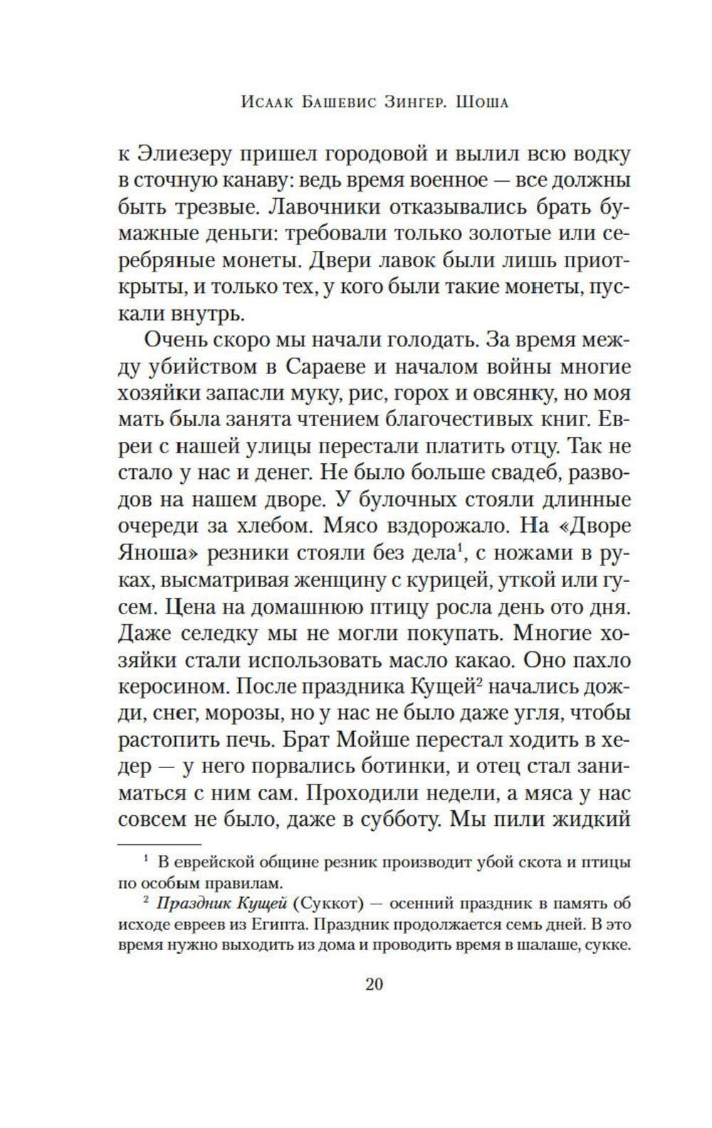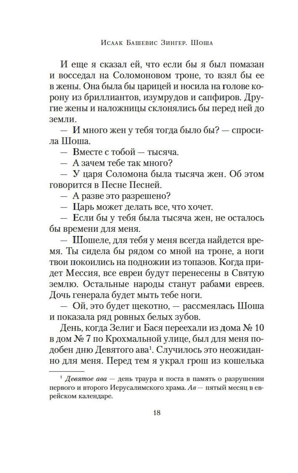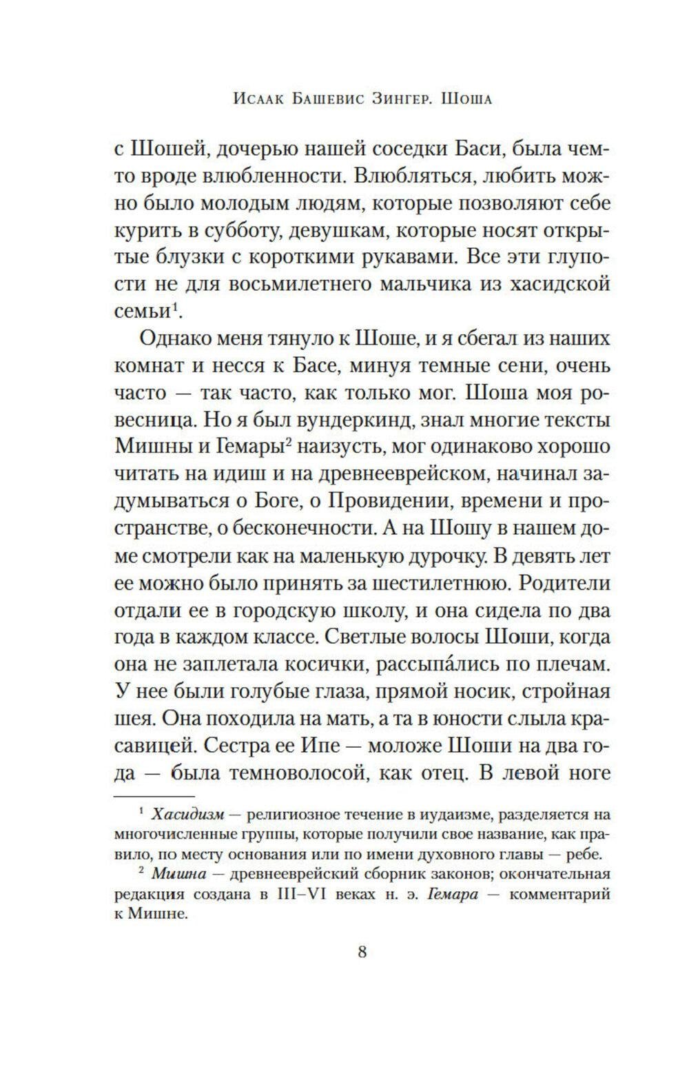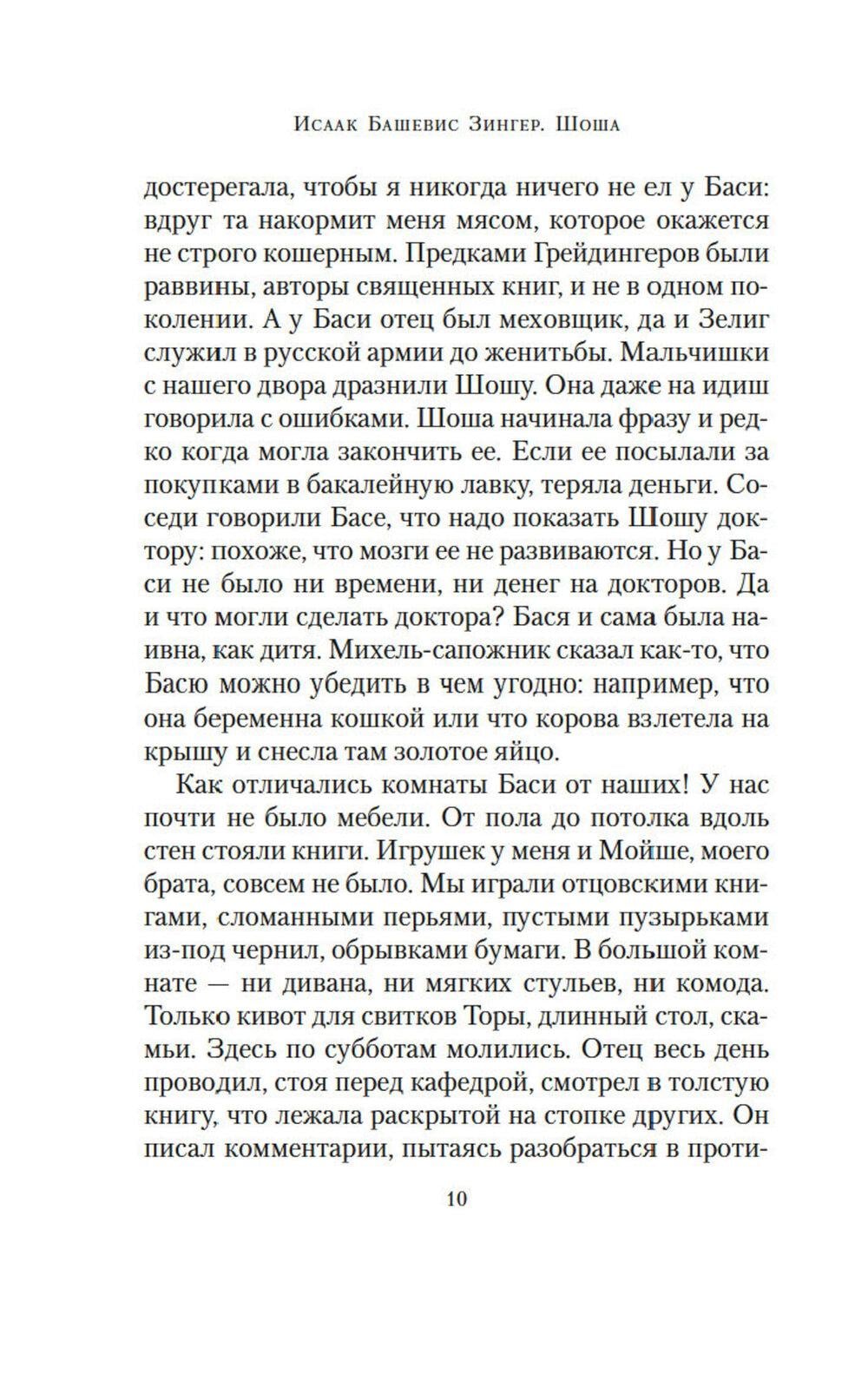 Польша, Варшава, 1930-е годы. Воздух пронизан тревожными предчувствиями мировой катастрофы. Аарон Грейдингер - молодой писатель, сын раввина, ведущий богемный образ жизни. Запутавшись в любовных связях и творческих неудачах, он пытается написать мистическую пьесу и вместе с остальными варшавскими евреями ждет неминуемого конца света. Одним весенним днем, гуляя по нищим еврейским кварталам своего детства, он решает заглянуть в дом, где жила его первая возлюбленная, которую он не видел целых двадцать лет. Оказалось, что Шоша ждала его все эти годы и, словно по волшебству, сохранила прежний облик простодушной девочки... Роман «Шоша» - самое известное произведение Исаака Башевиса Зингера (1902-1991), удивительная история любви и яркое свидетельство жизни довоенной Варшавы, стертой фашистами с лица земли. После публикации английской версии романа в 1978 году И. Б. Зингеру была присвоена Нобелевская премия за «эмоциональное искусство повествования». Первоначально текст выходил на идиш под названием «Экспедиции души», однако в процессе перевода на английский был значительно изменен и переработан автором, который в дальнейшем настаивал, чтобы именно по английской версии совершались переводы на другие языки. В настоящем издании роман «Шоша» представлен в классическом переводе с английского Нины Брумберг.| Издательство | Азбука |