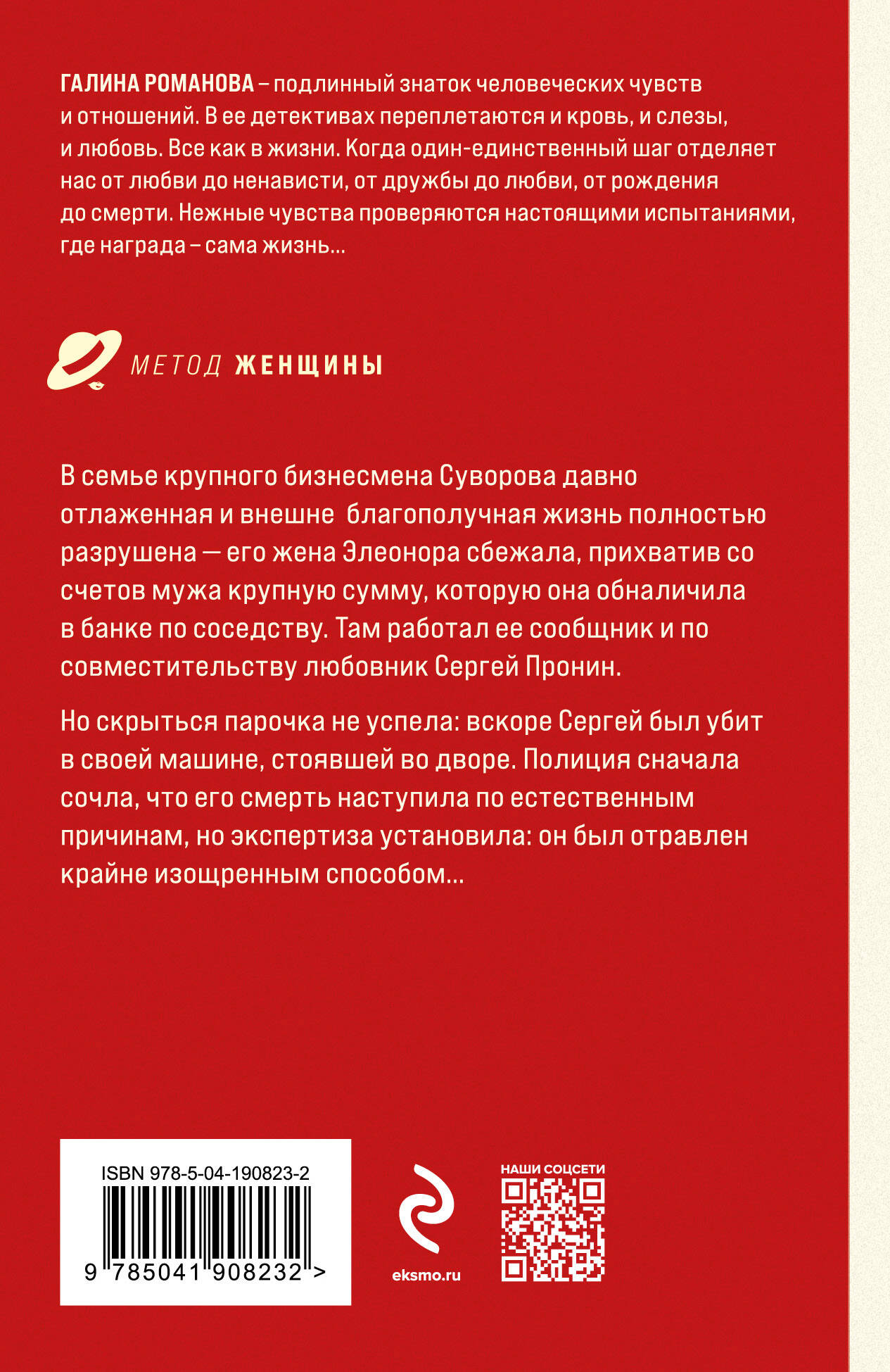 В семье крупного бизнесмена Суворова давно отлаженная и внешне благополучная жизнь полностью разрушена - его жена Элеонора сбежала, прихватив со счетов мужа крупную сумму, которую она обналичила в банке по соседству. Там работал ее сообщник и по совместительству любовник Сергей Пронин. Но скрыться парочка не успела: вскоре Сергей был убит в своей машине, стоявшей во дворе. Полиция сначала сочла, что его смерть наступила по естественным причинам, но экспертиза установила: он был отравлен крайне изощренным способом… Галина Романова - подлинный знаток человеческих чувств и отношений. В ее детективных мелодрамах из серии «Метод женщины» переплетаются и кровь, и слезы, и любовь. Все, как в реальности, когда один-единственный шаг отделяет нас от любви до ненависти, от дружбы до любви, от рождения до смерти. Нежные чувства проверяются настоящими испытаниями, где награда - сама жизнь.| Издательство | ООО "Издательство "Эксмо" |