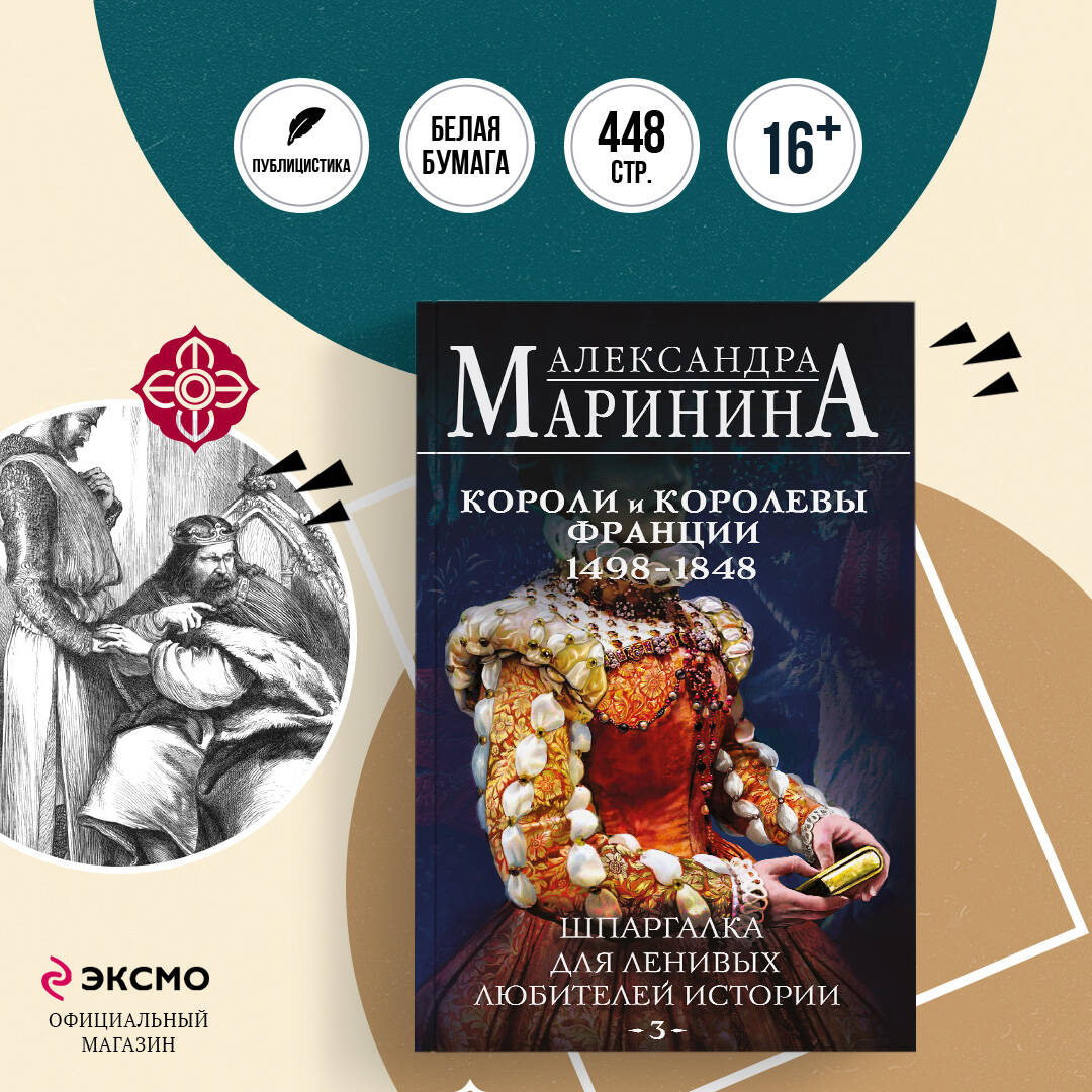 Короли и королевы Франции. Книга 2 (1498-1848 гг.). Новая историческая «шпаргалка» от Александры Марининой. На этот раз - французская. Париж, Версаль, блистательные короли, дерзкие королевы, изящные фрейлины и смелые мушкетёры… Ну кто из нас с детства не был очарован Францией и её историей! C особым «марининским» юмором в книге рассказывается история французских королей от Отца народа Людовика Двенадцатого до Луи-Филиппа Первого. Вы узнаете, что это были за люди, с какими талантами и недостатками, какими надеждами и мечтами они жили. • Как провести 25 лет в тени мужа, терпя его открытое пренебрежение, и вдруг стать Екатериной Медичи - незаурядным политиком, жестокой отравительницей и матерью трёх правящих королей, жившей все эти годы под девизом «ненавидеть и ждать». • Был ли Ришельё серым кардиналом при Людовике Тринадцатом или всё-таки сам король являлся зачинщиком казней, за которые народ ненавидел Ришельё? • Какие «пятна» скрывал от широкой публики невеликий росточком и рано облысевший Король-Солнце, при котором в моду вошли огромные парики и туфли на каблуках? • Кто из правящих французских монархов, пустившись во все тяжкие, имел 56 любовниц? И это только что-то вроде доказанного минимума, на самом деле женщин у Генриха Четвёртого было гораздо больше. «Этот текст - не учебник, не истина в последней инстанции, в нем наверняка можно найти ошибки и неточности. Но если вы, перепроверяя написанное, обнаружите мои «косяки», я буду только рада, ведь это означает, что вам стало интересно и вы захотели узнать чуть больше. Ну, заодно и порадуетесь, что оказались умнее автора, а любые положительные эмоции всегда идут на пользу!» - АЛЕКСАНДРА МАРИНИНА Книга содержит цитаты из работ профессиональных историков и известных писателей, однако автор сознательно избегает использования сносок с указанием года издания и номера страницы, чтобы текст не выглядел «наукообразным».| Издательство | ООО "Издательство "Эксмо" |