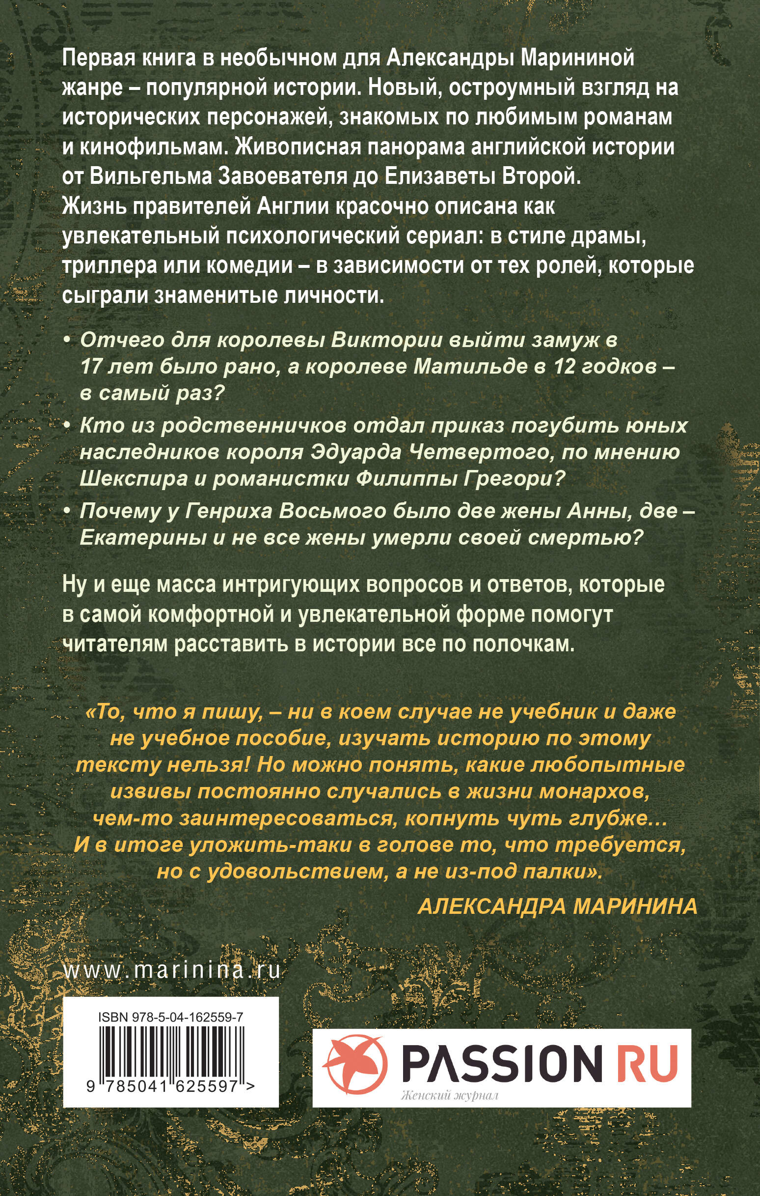 Первая книга в необычном для Александры Марининой жанре - популярной истории. Новый остроумный взгляд на исторических персонажей, знакомых по любимым романам и кинофильмам. Живописная панорама английской истории от Вильгельма Завоевателя до Елизаветы Второй. Жизнь правителей Англии красочно описана как увлекательный психологический сериал: в стиле драмы, триллера или комедии, в зависимости от тех ролей, которые сыграли знаменитые личности. • Отчего для королевы Виктории выйти замуж в 17 лет было рано, а королеве Матильде в 12 годков - в самый раз? • Кто отдал приказ погубить юных наследников короля Эдуарда Четвертого: их собственный вероломный дядя Ричард (будущий король Ричард Третий), как уверен был Шекспир, или залётный французский принц Джаспер Тюдор (дядя будущего короля Генриха Седьмого и победителя Ричарда), как считает романистка Филиппа Грегори? • Почему блудливый Генрих Восьмой одну Анну, жену свою - жизни лишил, такой негодяй, а другую Анну, девицу, увидев ее портрет кисти великого Гольбейна, решил взять четвертой женой, но как встретил вживую - поскорее развелся и… нет, не в монастырь ушел, а женился в пятый раз - на Екатерине, но и ту - по привычке тоже казнил? • Как смог король Георг Пятый родиться «немцем-полукровкой» Саксен-Кобургом, а умереть «чистокровным англичанином» Виндзором? Ну, и еще масса интригующих вопросов и ответов, которые в самой комфортной и увлекательной форме помогут читателям расставить в истории всё по полочкам. И наслаждаться любимыми историческими сериалами и сочинениями, всё понимая и не путаясь: кто за кем правил, кто кому кем приходится, кто кого до смерти обидел, а кто просто чижика съел. «То, что я пишу - ни в коем случае не учебник и даже не учебное пособие, изучать историю по этому тексту нельзя! Но можно понять, какие любопытные извивы постоянно случались в жизни монархов, чем-то заинтересоваться, копнуть чуть глубже… И в итоге уложить-таки в голове то, что требуется, но с удовольствием, а не из-под палки». - АЛЕКСАНДРА МАРИНИНА| Издательство | Эксмо |