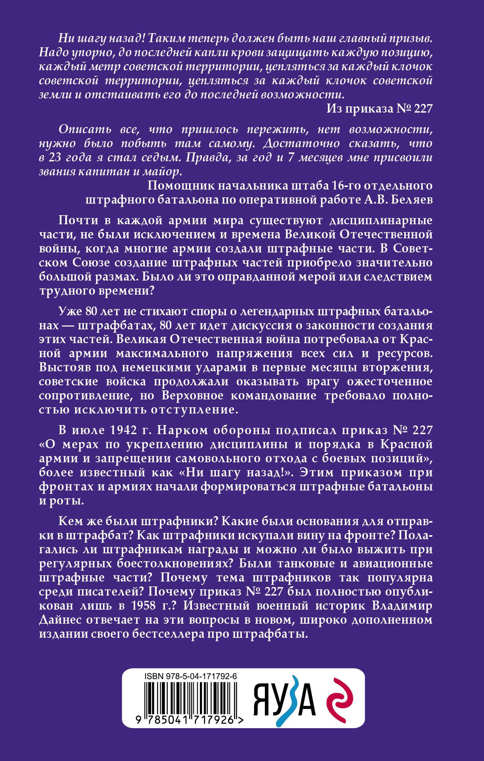 Почти в каждой армии мира существуют дисциплинарные части, не были исключением и времена Великой Отечественной войны, когда многие армии создали штрафные части. В Советском Союзе создание штрафных частей приобрело значительно больший размах. Было ли это оправданной мерой или следствием трудного времени? Уже 80 лет не стихают споры о легендарных штрафных батальонах - штрафбатах, 80 лет идет дискуссия о законности создания этих частей. Великая Отечественная война потребовала от Красной Армии максимального напряжения всех сил и ресурсов. Выстояв под немецкими ударами в первые месяцы вторжения, советские войска продолжали оказывать врагу ожесточенное сопротивление, но Верховное командование требовало полностью исключить отступление. В июле 1942 г. Нарком обороны подписал приказ № 227 «О мерах по укреплению дисциплины и порядка в Красной Армии и запрещении самовольного отхода с боевых позиций», более известный как «Ни шагу назад!». Этим приказом при фронтах и армиях начали формироваться штрафные батальоны и роты. Кем же были штрафники? Какие были основания для отправки в штрафбат? Как штрафники искупали вину на фронте? Полагались ли штрафникам награды и можно ли было выжить при регулярных боестолкновениях? Были танковые и авиационные штрафные части? Почему тема штрафников так популярна среди писателей? Почему приказ № 227 был открыто опубликован лишь в 1958 г.? Известный военный историк Владимир Дайнес отвечает на эти вопросы в новом широко дополненном издании своего бестселлера про штрафбаты. «Описать все, что пришлось пережить, нет возможности, нужно было побыть там самому. Достаточно сказать, что в 23 года я стал седым. Правда, за год и 7 месяцев мне присвоили звания "капитан" и "майор"». - Помощник начальника штаба 16-го отдельного штрафного батальона по оперативной работе А.В. Беляев| Издательство | ООО "Издательство "Эксмо" |
