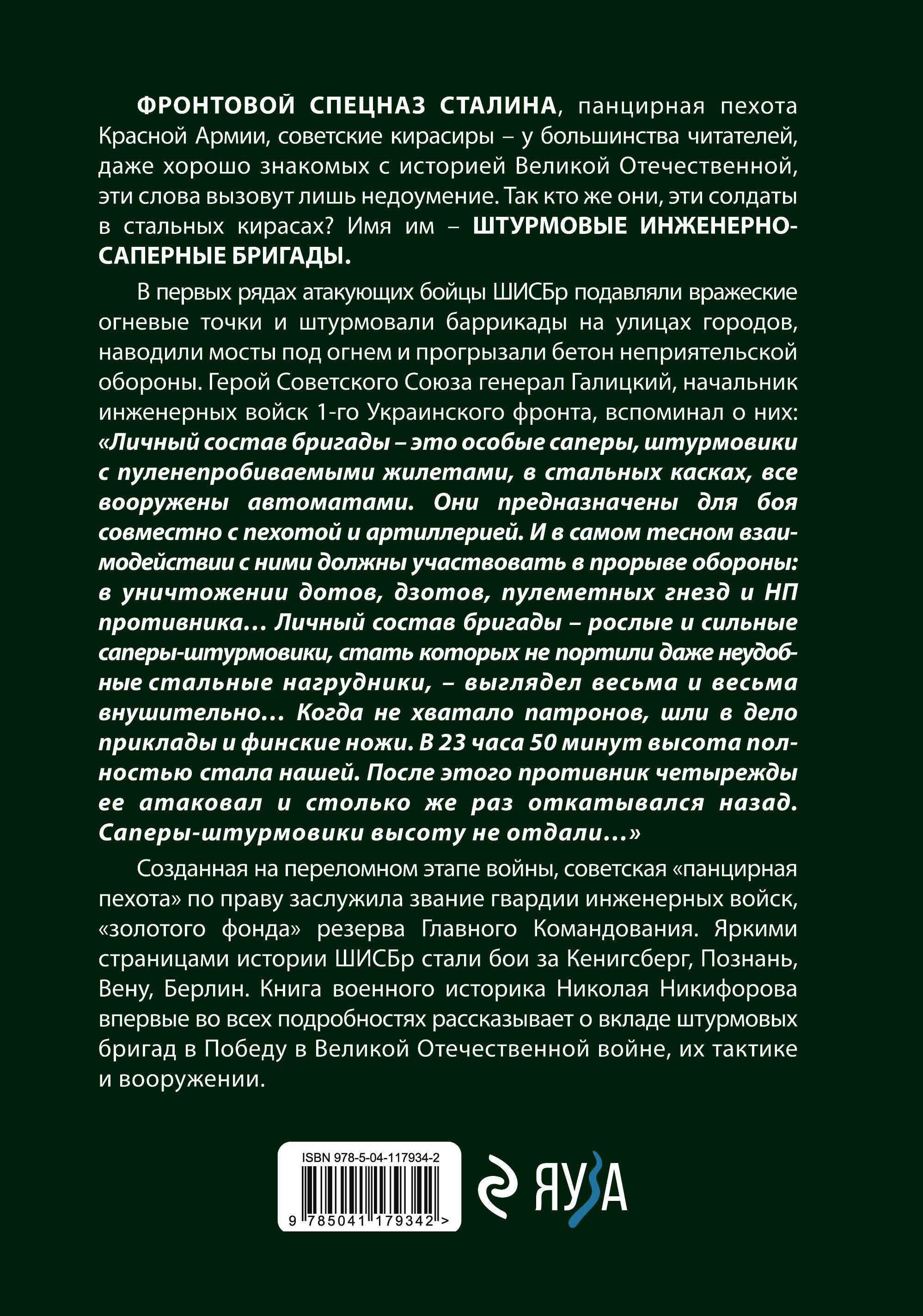 ФРОНТОВОЙ СПЕЦНАЗ СТАЛИНА, панцирная пехота Красной Армии, советские кирасиры - у большинства читателей, даже хорошо знакомых с историей Великой Отечественной, эти слова вызовут лишь недоумение. Так кто же они, эти солдаты в стальных кирасах? Имя им - ШТУРМОВЫЕ ИНЖЕНЕРНО-САПЕРНЫЕ БРИГАДЫ. В первых рядах атакующих бойцы ШИСБр подавляли вражеские огневые точки и штурмовали баррикады на улицах городов, наводили мосты под огнем и прогрызали бетон неприятельской обороны. Герой Советского Союза генерал Галицкий, начальник инженерных войск 1-го Украинского фронта, вспоминал о них: «Личный состав бригады - это особые саперы, штурмовики с пуленепробиваемыми жилетами, в стальных касках, все вооружены автоматами. Они предназначены для боя совместно с пехотой и артиллерией. И в самом тесном взаимодействии с ними должны участвовать в прорыве обороны: в уничтожении дотов, дзотов, пулеметных гнезд и НП противника… Личный состав бригады - рослые и сильные саперы-штурмовики, стать которых не портили даже неудобные стальные нагрудники, - выглядел весьма и весьма внушительно… Когда не хватало патронов, шли в дело приклады и финские ножи. В 23 часа 50 минут высота полностью стала нашей. После этого противник четырежды ее атаковал и столько же раз откатывался назад. Саперы-штурмовики высоту не отдали…» Созданная на переломном этапе войны, советская «панцирная пехота» по праву заслужила звание гвардии инженерных войск, «золотого фонда» резерва Главного командования. Яркими страницами истории ШИСБр стали бои за Кенигсберг, Познань, Вену, Берлин. Книга военного историка Николая Никифорова впервые во всех подробностях рассказывает о вкладе штурмовых бригад в Победу в Великой Отечественной войне, их тактике и вооружении.| Издательство | ООО "Издательство "Эксмо" |