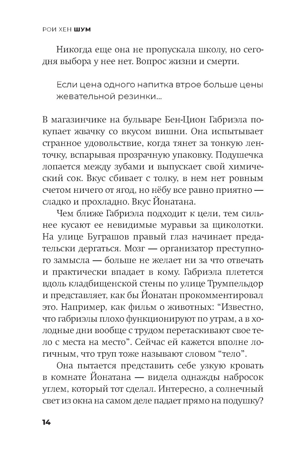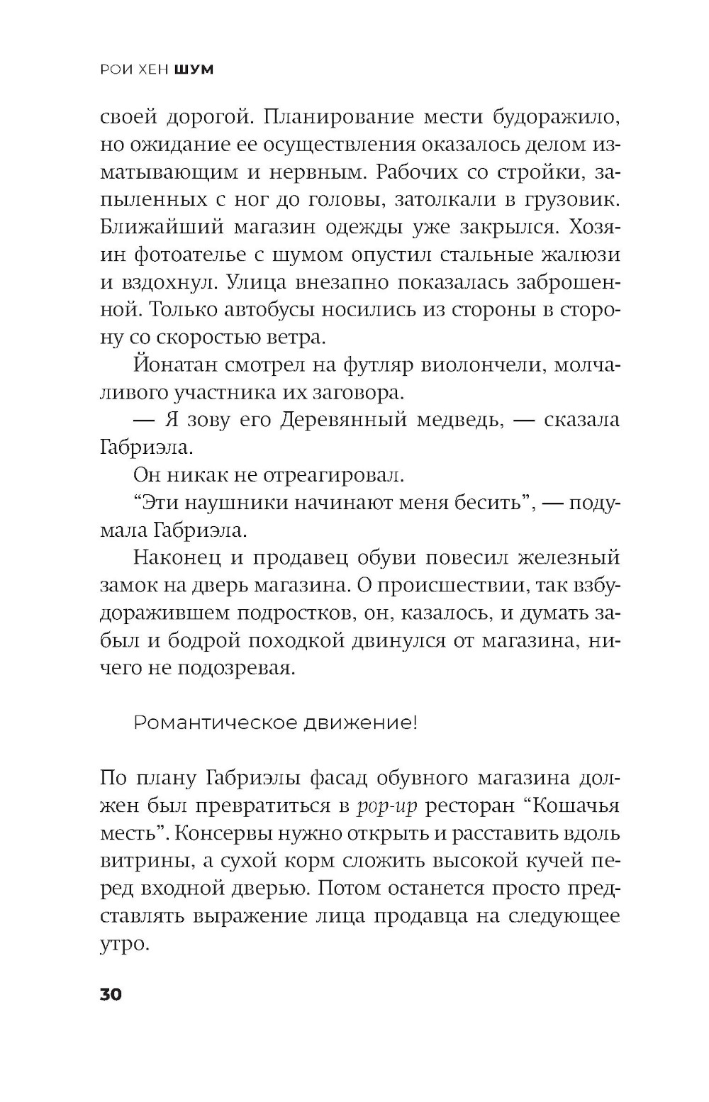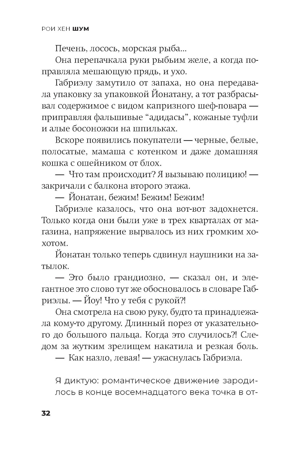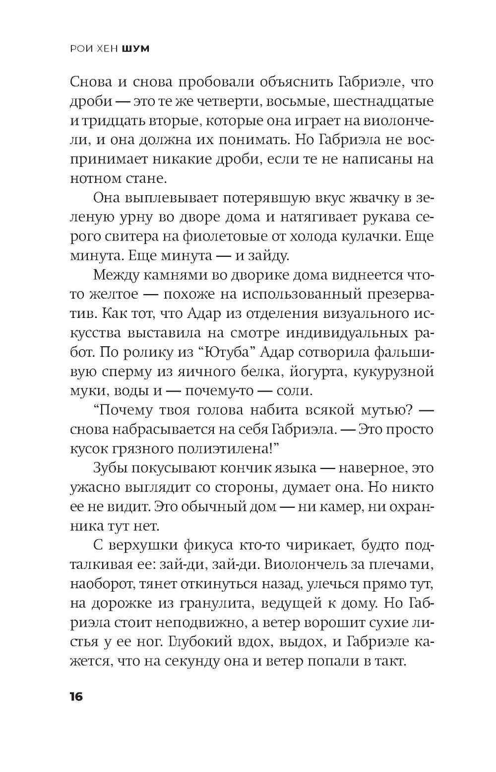 Три женщины. Два города. Один Бог (возможно). Габриэла учится в выпускном классе, в школе она незаметная мышка и общается с миром посредством музыки. Габриэла - виолончелистка. Однажды с виолончелью за спиной она вместо школы отправляется бродить по улицам ТельАвива. Так начинается ее путешествие, в котором она обретет собственный голос. Ноа всегда в центре внимания, она говорит, говорит и говорит, не умолкая ни на миг. И получает в подарок на свое сорокалетие «ретрит молчания». Но тишина вокруг слишком уж диссонирует с гомоном внутри, и Ноа сбегает из обители молчания. Она и не предполагала, что день рождения станет для нее путешествием в запутанные переулки старого Иерусалима - путешествием к самой себе. Ципора всю жизнь говорила с чужого голоса - она переводчица с английского. Когда-то она переводила Джойса, а сейчас перекладывает на иврит непритязательные романтические комедии и бестолковые триллеры. Неудивительно, что именно ей однажды является Голос, который поведет ее за собой - прочь от привычного одиночества и привычной обиды на весь мир. Три женщины, три голоса сойдутся в одной точке. Что вполне закономерно, ведь Габриэла - дочь Ноа, а Ноа - дочь Ципоры. За одну неделю они преодолеют путь, который не могли пройти всю предыдущую жизнь - путь друг к другу. И путешествие это будет развиваться на фоне Шума нашего времени. Новый роман Рои Хена - удивительная музыкальная пьеса из трех частей, каждая из которых исполняется в своем ритме и тональности. Ирония и романтика, юмор и погружение в философские глубины, гомон улиц и звуки виолончели - все это шум, в котором живут герои книги, в котором живем мы.| Издательство | Фантом Пресс |