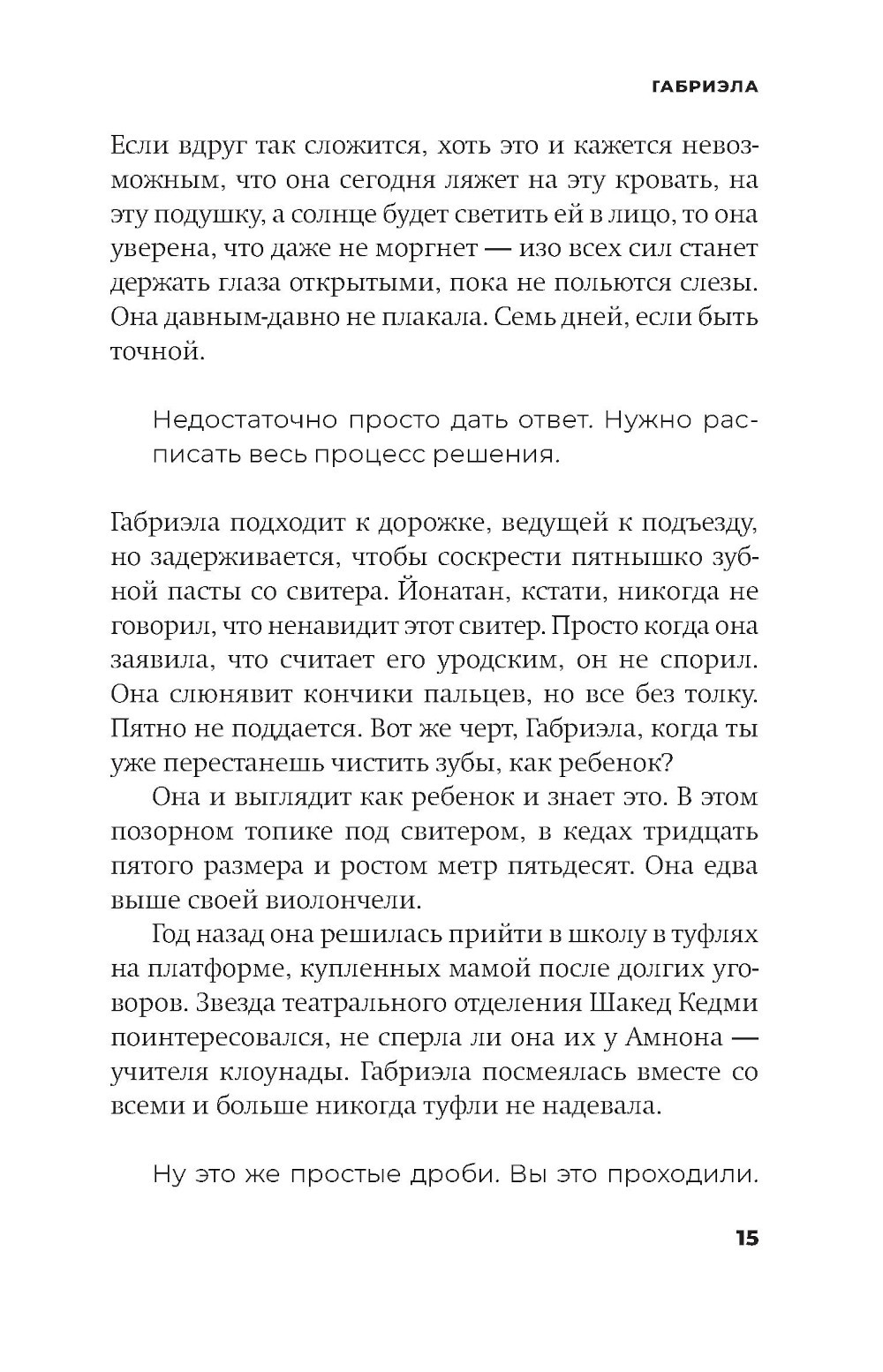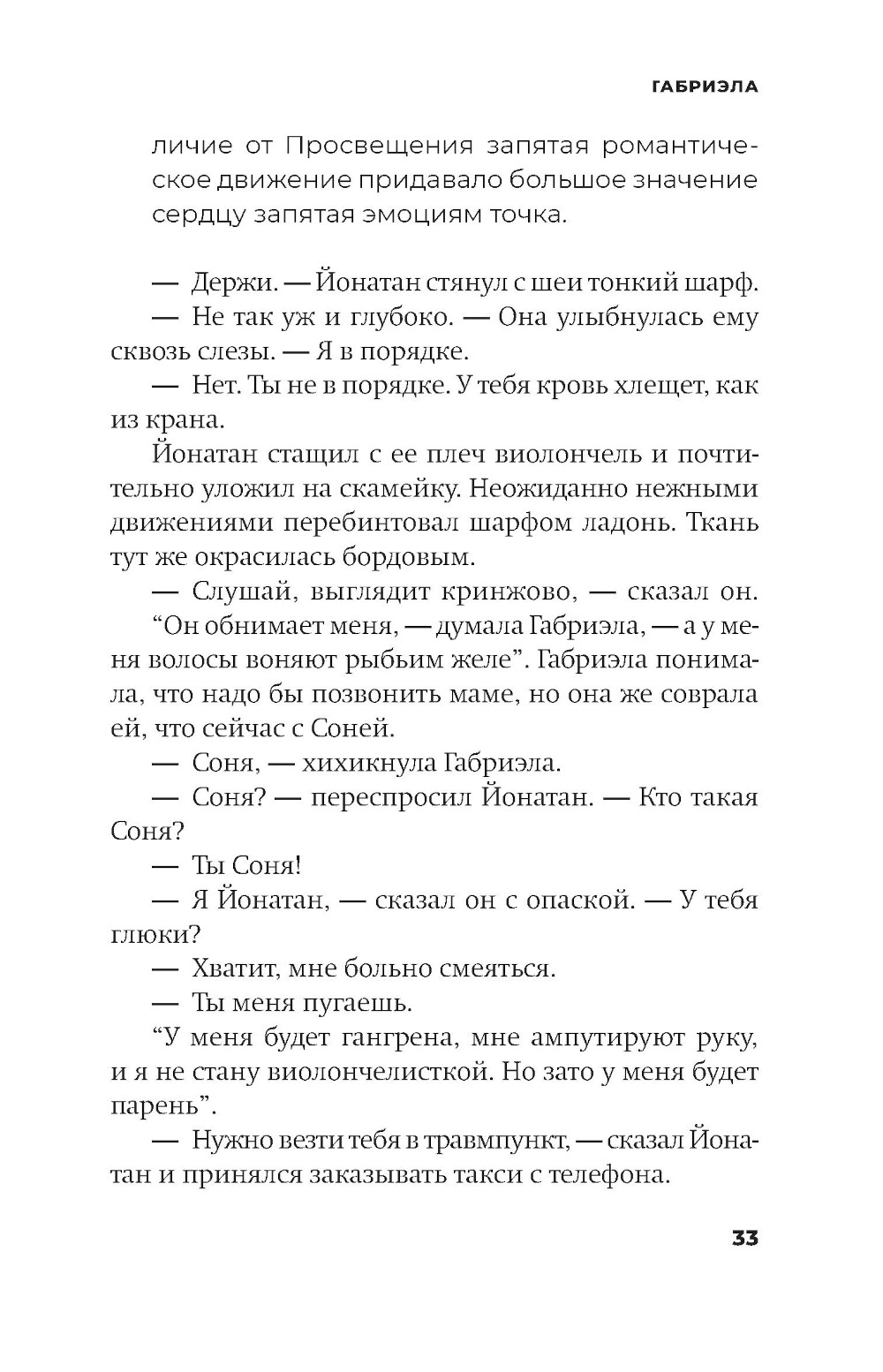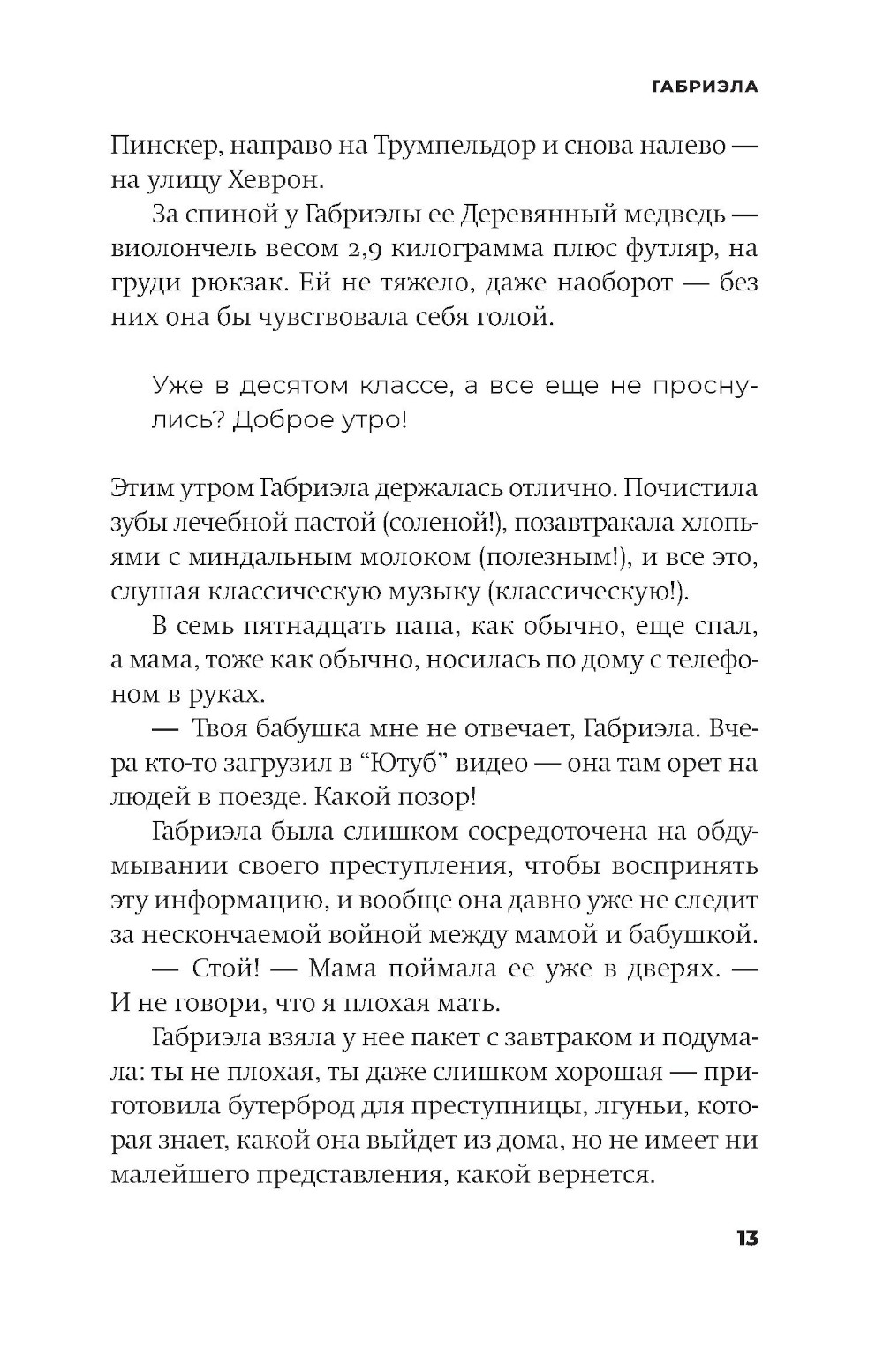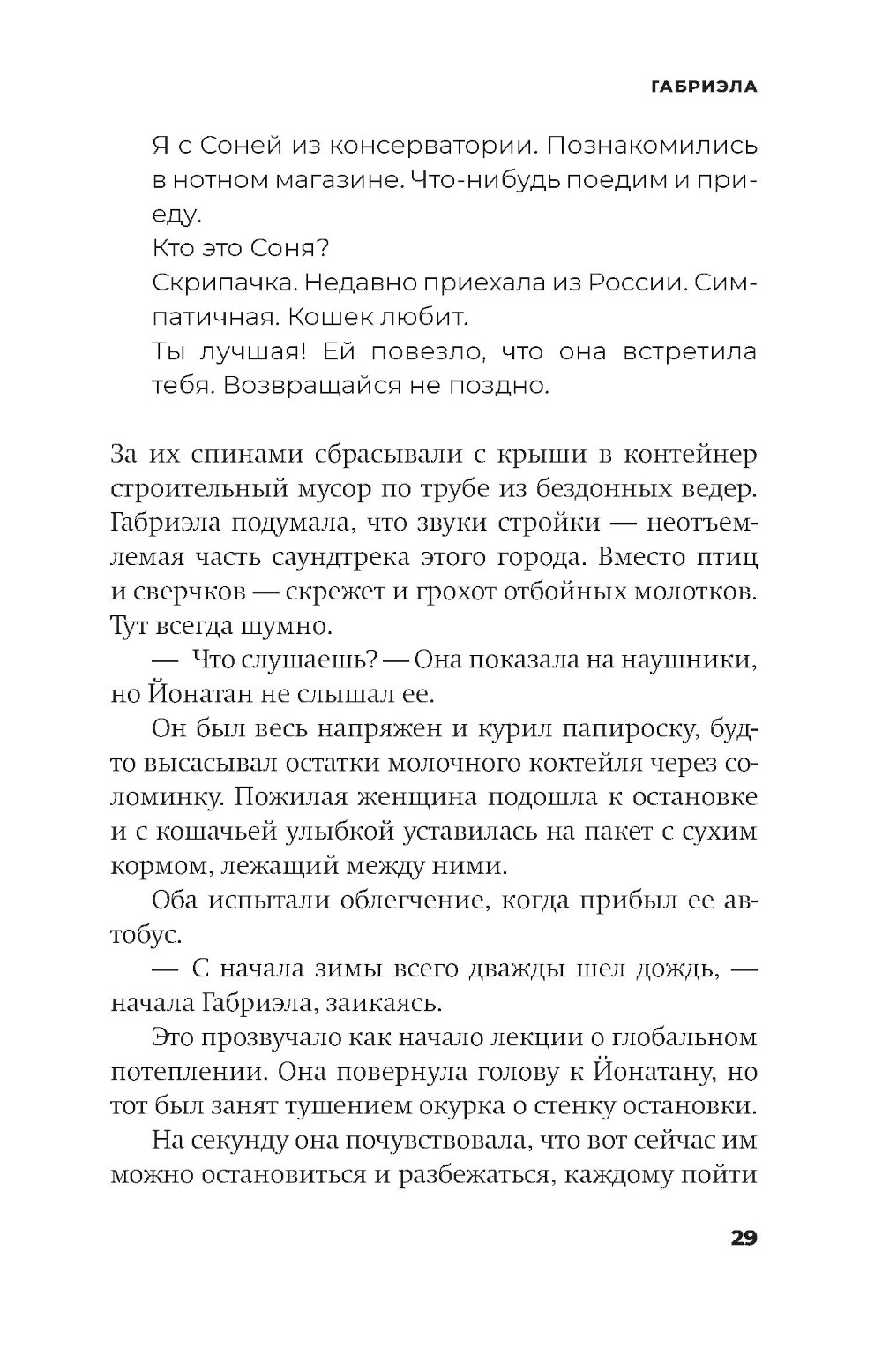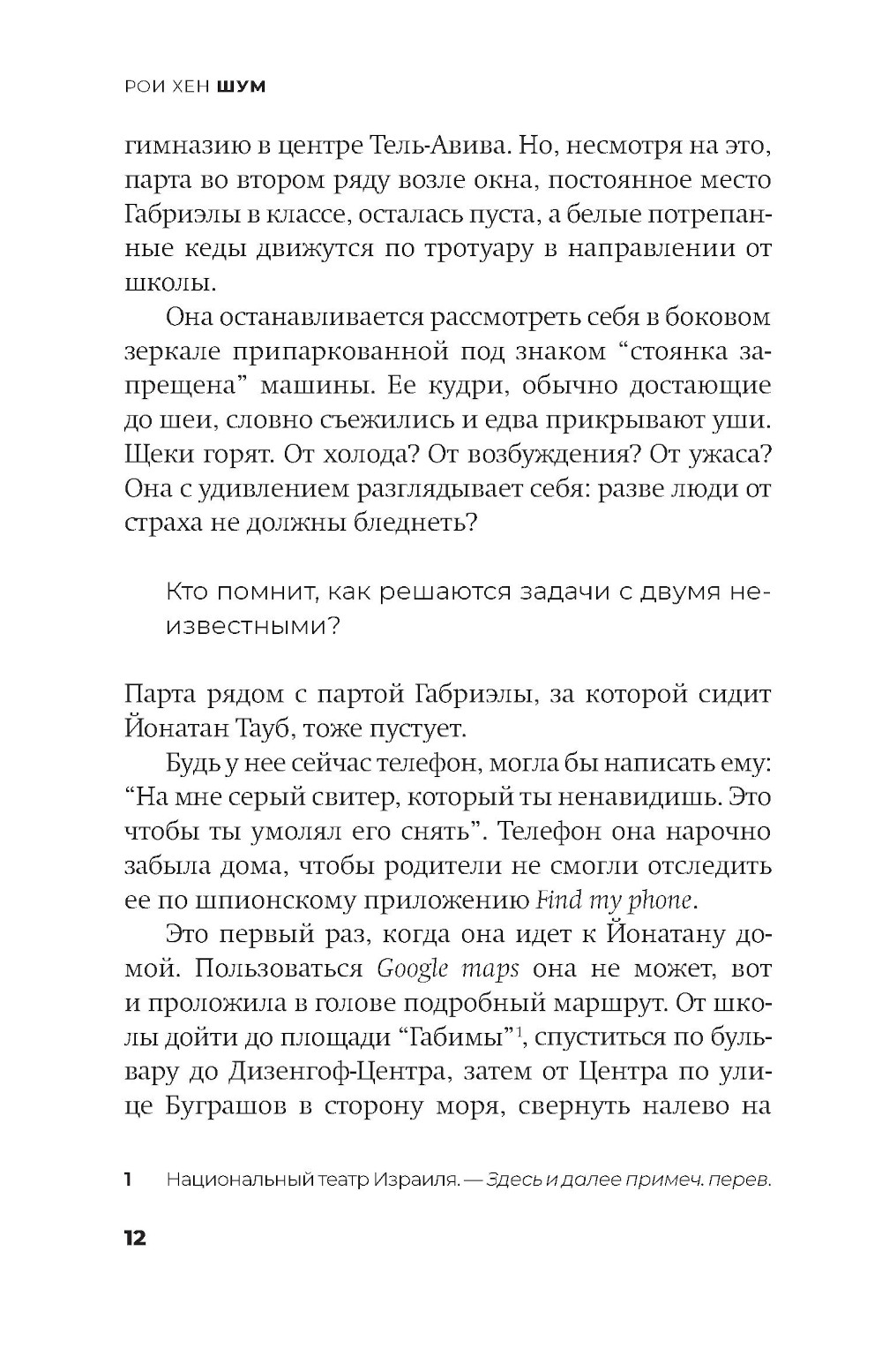Три женщины. Два города. Один Бог (возможно). Габриэла учится в выпускном классе, в школе она незаметная мышка и общается с миром посредством музыки. Габриэла - виолончелистка. Однажды с виолончелью за спиной она вместо школы отправляется бродить по улицам ТельАвива. Так начинается ее путешествие, в котором она обретет собственный голос. Ноа всегда в центре внимания, она говорит, говорит и говорит, не умолкая ни на миг. И получает в подарок на свое сорокалетие «ретрит молчания». Но тишина вокруг слишком уж диссонирует с гомоном внутри, и Ноа сбегает из обители молчания. Она и не предполагала, что день рождения станет для нее путешествием в запутанные переулки старого Иерусалима - путешествием к самой себе. Ципора всю жизнь говорила с чужого голоса - она переводчица с английского. Когда-то она переводила Джойса, а сейчас перекладывает на иврит непритязательные романтические комедии и бестолковые триллеры. Неудивительно, что именно ей однажды является Голос, который поведет ее за собой - прочь от привычного одиночества и привычной обиды на весь мир. Три женщины, три голоса сойдутся в одной точке. Что вполне закономерно, ведь Габриэла - дочь Ноа, а Ноа - дочь Ципоры. За одну неделю они преодолеют путь, который не могли пройти всю предыдущую жизнь - путь друг к другу. И путешествие это будет развиваться на фоне Шума нашего времени. Новый роман Рои Хена - удивительная музыкальная пьеса из трех частей, каждая из которых исполняется в своем ритме и тональности. Ирония и романтика, юмор и погружение в философские глубины, гомон улиц и звуки виолончели - все это шум, в котором живут герои книги, в котором живем мы.| Издательство | Фантом Пресс |