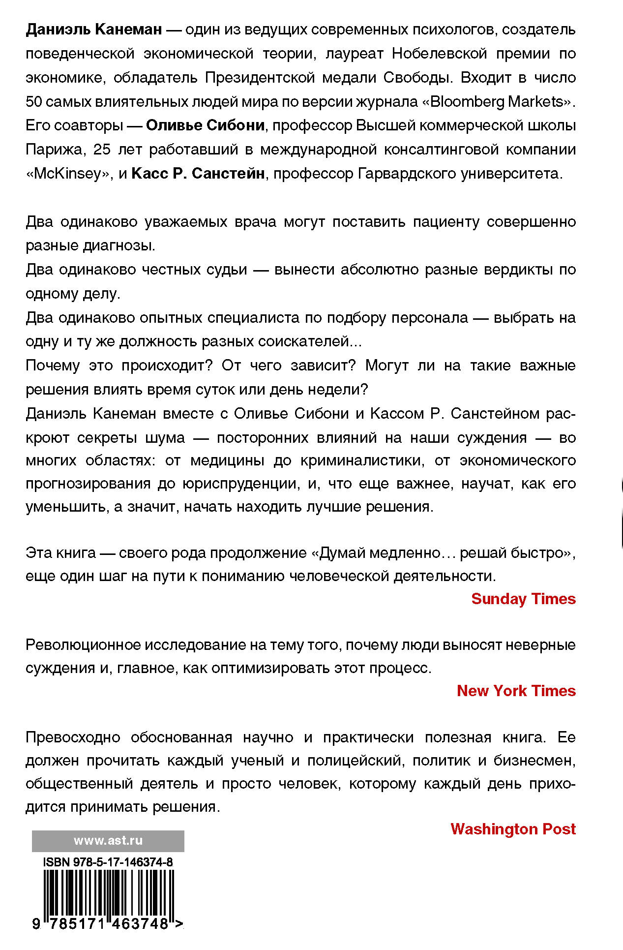 «Шум» - новое революционное исследование, в котором приняли участие автор нашумевшего делового бестселлера «Думай медленно... решай быстро» Даниэль Канеман, профессор стратегии высшей коммерческой школы Парижа Оливье Сибони и бывший сотрудник администрации Белого дома Касс Р. Санстейн. Книга ответит на вопросы, почему люди ошибаются, делают неверные суждения или в зависимости от окружающей обстановки принимают совершенно разные решения при одинаковых исходных данных. Соавторы изучат влияние шума - посторонних влияний на наши суждения - во многих областях от криминалистики и экономического прогнозирования до медицины и юриспруденции и научат, как снижать его уровень, а значит - находить лучшие решения.| Издательство | ИЗДАТЕЛЬСТВО "АСТ" |
