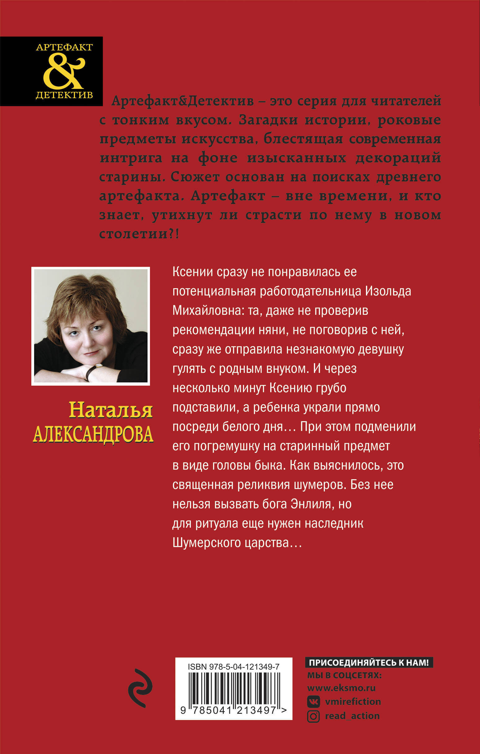 Ксении сразу не понравилась ее потенциальная работодательница Изольда Михайловна: та, даже не проверив рекомендации няни, не поговорив с ней, сразу же отправила незнакомую девушку гулять с родным внуком. И через несколько минут Ксению грубо подставили, а ребенка украли прямо посреди белого дня… При этом подменили его погремушку на старинный предмет в виде головы быка. Как выяснилось, это священная реликвия шумеров. Без нее нельзя вызвать бога Энлиля, но для ритуала еще нужен наследник Шумерского царства… Детектив «Шумерская погремушка» - захватывающая новинка автора серии «Артефакт&Детектив» Натальи Александровой. Священная реликвия шумеров способна творить чудеса, даже возродить былое величие древнего народа, но для этого нужен настоящий наследник шумеров…| Издательство | Эксмо |