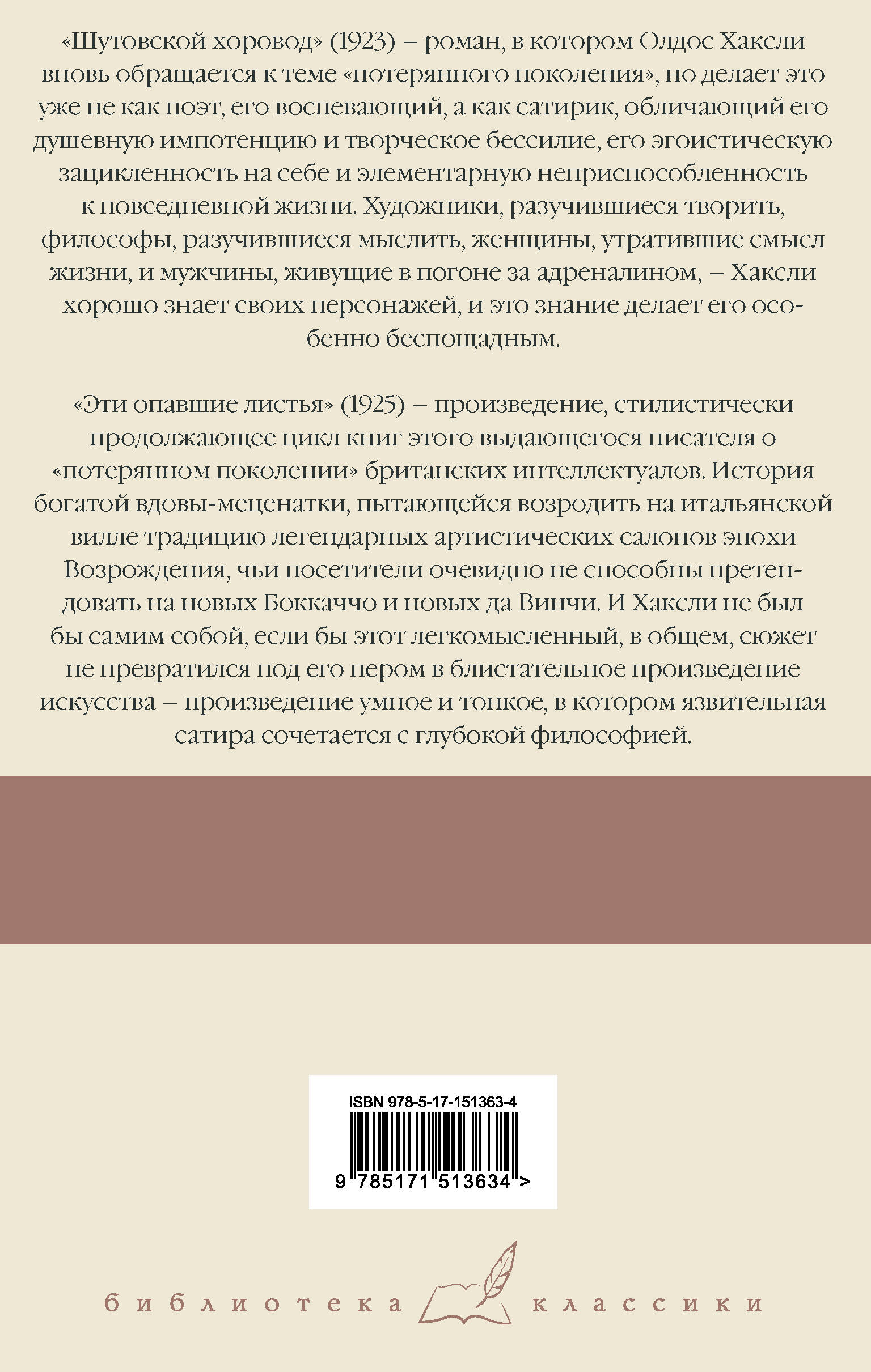 "Шутовской хоровод" (1923) - роман, в котором Олдос Хаксли вновь обращается к теме "потерянного поколения", но делает это уже не как поэт, его воспевающий, а как сатирик, обличающий его душевную импотенцию и творческое бессилие, его эгоистическую зацикленность на себе и элементарную неприспособленность к повседневной жизни. Художники, разучившиеся творить, философы, разучившиеся мыслить, женщины, утратившие смысл жизни, и мужчины, живущие в погоне за адреналином, - Хаксли хорошо знает своих персонажей, и это знание делает его особенно беспощадным. "Эти опавшие листья" (1925) - произведение, стилистически продолжающее цикл книг этого выдающегося писателя о "потерянном поколении" британских интеллектуалов. История богатой вдовы-меценатки, пытающейся возродить на итальянской вилле традицию легендарных артистических салонов эпохи Возрождения, чьи посетители очевидно не способны претендовать на новых Боккаччо и новых да Винчи. И Хаксли не был бы самим собой, если бы этот легкомысленный, в общем, сюжет не превратился под его пером в блистательное произведение искусства - произведение умное и тонкое, в котором язвительная сатира сочетается с глубокой философией.| Издательство | ИЗДАТЕЛЬСТВО "АСТ" |