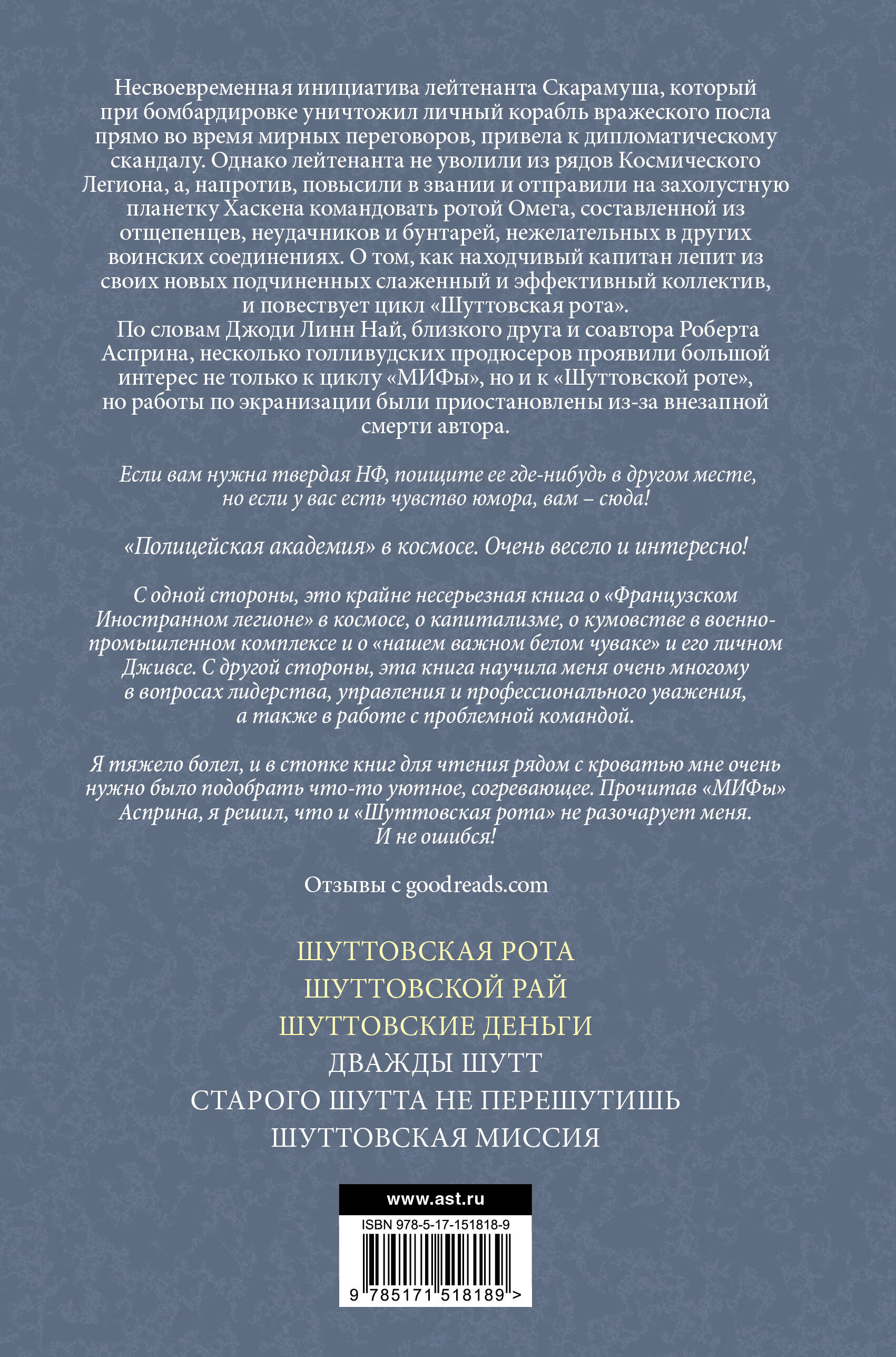 Несвоевременная инициатива лейтенанта Скарамуша, который при бомбардировке уничтожил личный корабль вражеского посла прямо во время мирных переговоров, привела к дипломатическому скандалу. Однако лейтенанта не уволили из рядов Космического Легиона, а, напротив, повысили в звании и отправили на захолустную планетку Хаскена командовать ротой Омега, составленной из отщепенцев, неудачников и бунтарей, нежелательных в других воинских соединениях. О том, как находчивый капитан лепит из своих новых подчиненных слаженный и эффективный коллектив, и повествует цикл "Шуттовская рота".| Издательство | ИЗДАТЕЛЬСТВО "АСТ" |