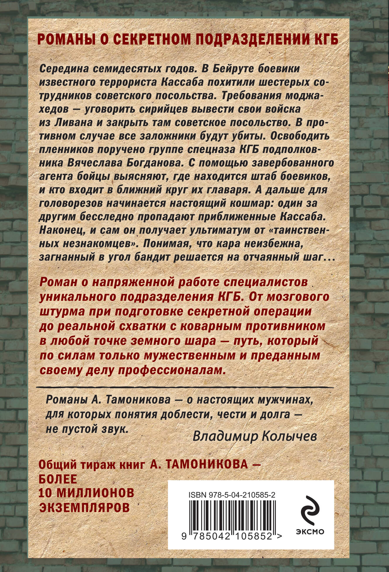Роман о напряженной работе специалистов уникального подразделения КГБ. От мозгового штурма при подготовке секретной операции до реальной схватки с коварным противником в любой точке земного шара - путь, который по силам только мужественным и преданным своему делу профессионалам. Середина семидесятых годов. В Бейруте боевики известного террориста Кассаба похитили шестерых сотрудников советского посольства. Требования моджахедов - уговорить сирийцев вывести свои войска из Ливана и закрыть там советское посольство. В противном случае все заложники будут убиты. Освободить пленников поручено группе спецназа КГБ подполковника Вячеслава Богданова. С помощью завербованного агента бойцы выясняют, где находится штаб боевиков и кто входит в ближний круг их главаря. А дальше для головорезов начинается настоящий кошмар: один за другим бесследно пропадают приближенные Кассаба. Наконец, и сам он получает ультиматум от «таинственных незнакомцев». Понимая, что кара неизбежна, загнанный в угол бандит решается на отчаянный шаг… «Романы А. Тамоникова - о настоящих мужчинах, для которых понятия доблести, чести и долга - не пустой звук». - В. Колычев Общий тираж книг А. Тамоникова - более 10 миллионов экземпляров.| Издательство | ООО "Издательство "Эксмо" |
