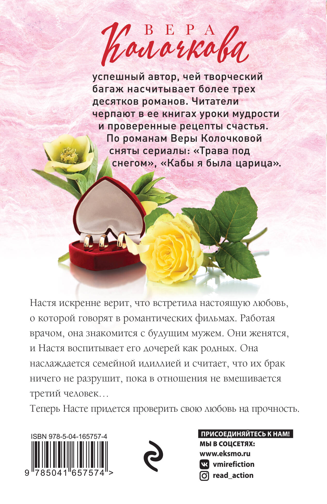Библиография Веры Колочковой насчитывает более 40 романов, многие из которых уже воплощены на экране. Любовь к автору вполне объяснима, ведь она пишет об обычных людях, которые стремятся к лучшей жизни и борются за собственное счастье. Простые и чувственные, увлекательные и романтичные, романы Колочковой задевают за живое, заставляя сопереживать и радоваться героям как своим знакомым. Настя искренне верит, что встретила настоящую любовь, о которой говорят в романтических фильмах. Работая врачом, она знакомится с будущим мужем. Они женятся, и Настя воспитывает его дочерей как родных. Она наслаждается семейной идиллией и считает, что их брак ничего не разрушит, пока в отношения не вмешивается третий человек… Теперь Насте придется проверить свою любовь на прочность.| Издательство | Эксмо |