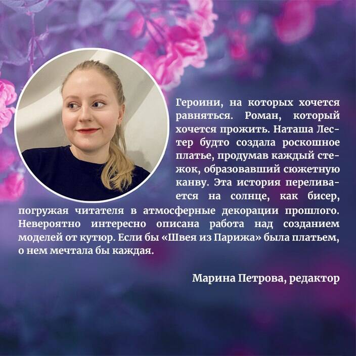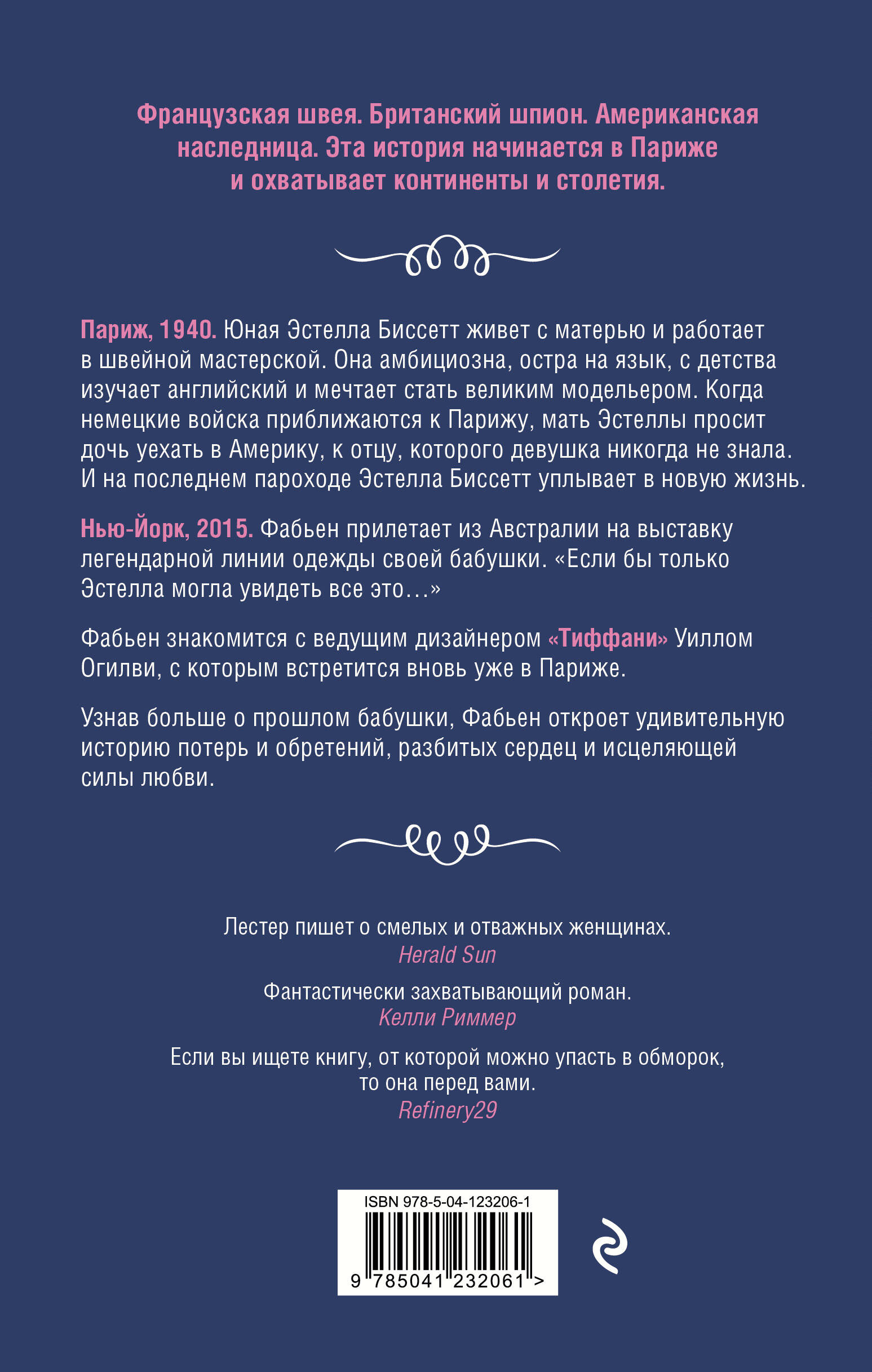В детстве Наташа Лестер обожала читать сказки. Ей нравилось погружаться в волшебный мир, который разворачивался на разноцветных страницах. «Каково это - заставить читателя испытать те же эмоции, что и я испытывала в те далекие дни?» Этот вопрос не давал писательнице покоя. Но мечта сбылась не сразу - десять лет она работала в отделах маркетинга L'Oreal и Maybelline. Наташа признается, что у нее никогда в жизни не было такой большой коллекции губных помад. Это был отличный опыт, однако Лестер хотела серьезно заниматься литературой. Ее первую рукопись много раз отвергали, но она продолжала писать и верить в чудо, и чудо произошло. Теперь Наташа могла назвать себя настоящим писателем. В романах Наташи Лестер, как в зеркале, отражается ее интерес к истории, исследованиям, путешествиям, моде. А еще - ее пристрастие к сильным женским образам. Книги Наташи Лестер давно и прочно занимают место в списке бестселлеров и стоят на полках читателей по всему миру. Чем ты готова пожертвовать, чтобы о тебе узнал весь мир? Французская швея. Британский шпион. Американская наследница. Эта история начинается в Париже и охватывает континенты и столетия. Париж, 1940. Юная Эстелла Биссетт живет с матерью и работает в швейной мастерской. Она амбициозна, остра на язык, с детства изучает английский и мечтает стать великим модельером. Когда немецкие войска приближаются к Парижу, мать Эстеллы просит дочь уехать в Америку, к отцу, которого девушка никогда не знала. И на последнем пароходе Эстелла Биссетт уплывает в новую жизнь... Нью-Йорк, 2015. Фабьен прилетает из Австралии на выставку легендарной линии одежды своей бабушки. «Если бы только Эстелла могла увидеть все это…» Фабьен знакомится с ведущим дизайнером «Тиффани» Уиллом Огилви, с которым встретится вновь уже в Париже. Узнав больше о прошлом бабушки, Фабьен откроет удивительная история потерь и обретений, разбитых сердец и исцеляющей силы любви. «Лестер пишет о смелых и отважных женщинах». - Herald Sun «Фантастически захватывающий роман». - Келли Риммер «Если вы ищете книгу, от которой можно упасть в обморок, то она перед вами. Две любовные истории, охватывающие континенты и столетия, обязательно понравятся любителям исторических романов». - Refinery29| Издательство | Эксмо |