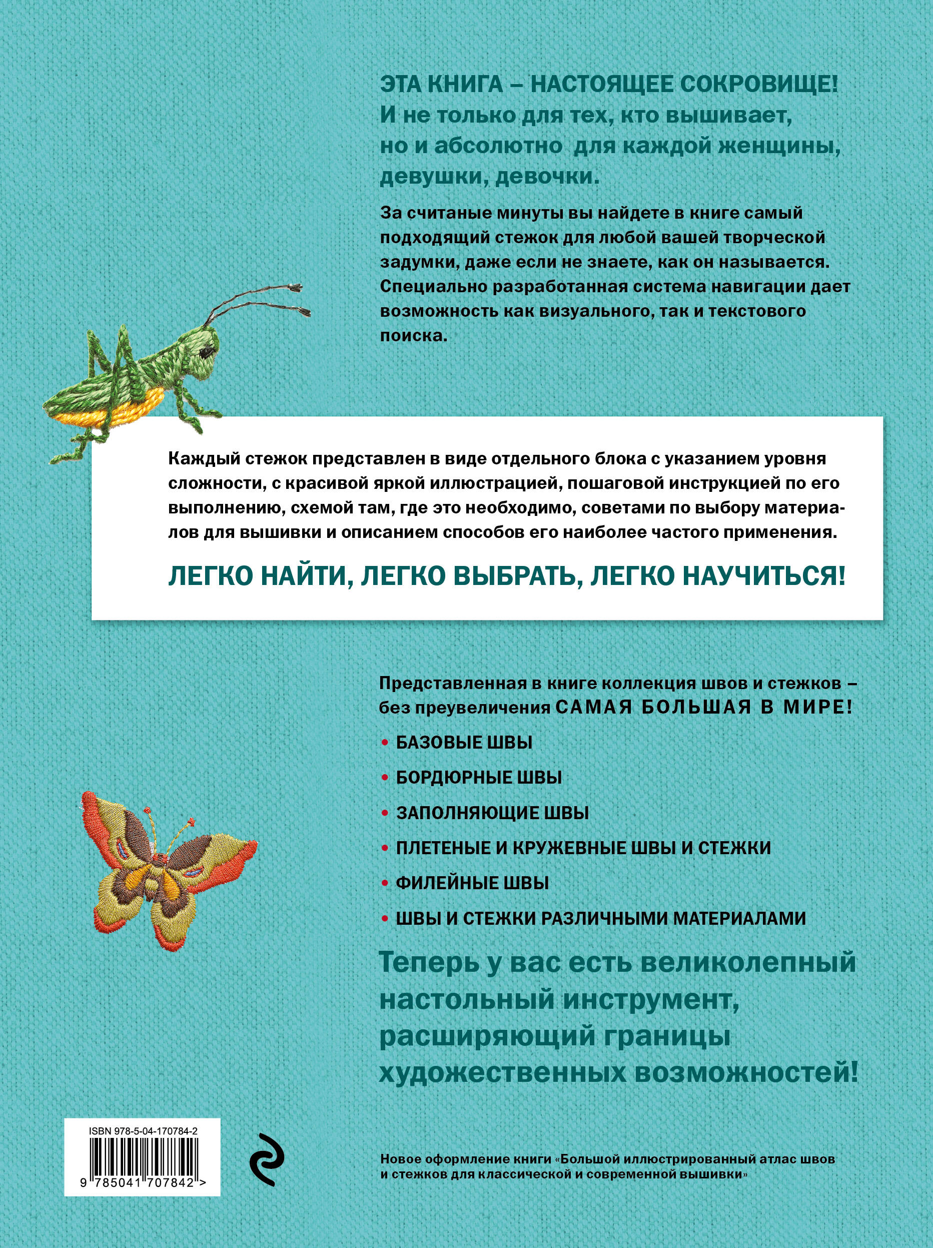 Теперь не придется выбрасывать любимые вещи даже тем, кто не умеет вышивать и вообще рукодельничать! На любой уровень сложности найдется прием, который позволит вышить на месте дыры красивую снежинку или снеговика, а на канве профессиональной вышивальщицы - великолепную картину. Эта книга расширяет возможности каждого, кто умеет держать в руках иголку. 450 всевозможных швов и стежков, от базовых до декоративных, от самых простых до самых фантазийных! Ваш арсенал творческих приемов пополнится настолько, что не останется препятствий для воплощения любых фантазий! Даже если вы не знаете, как называется нужный вам шов, а представляете его только визуально, вы легко найдете его с помощью иллюстрированной галереи. А если просто придумали идею и не знаете, какими средствами ее воплотить, то подберете нужный стежок по иллюстрации. И сможете сразу перейти на страницу с инструкцией. Каждый шов снабжен указанием уровня сложности, советами по использованию и подбору канвы и ниток, схемой и пошаговым алгоритмом выполнения. Четко, понятно даже начинающим, без лишних слов и рассуждений! Уникальный справочник-гид по прекрасному и безграничному миру вышивки! В книгу вошли коллекции швов и стежков из книг «Швы и стежки» и «Новые швы и стежки», изданных ранее.| Издательство | Эксмо |