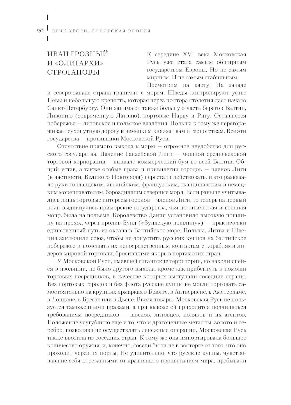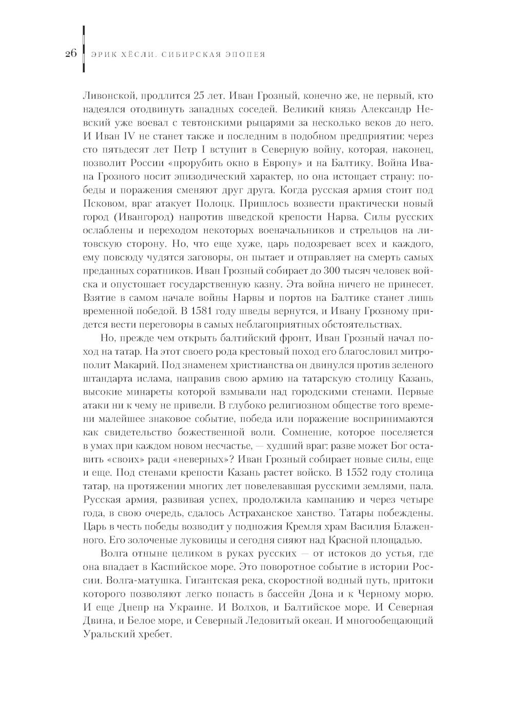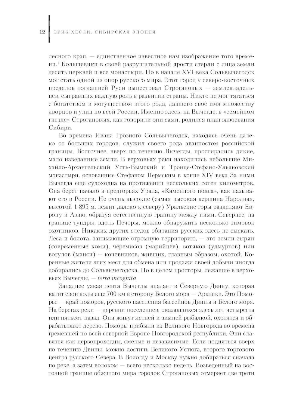 В представленной читателю книге журналиста, писателя и профессора EPFL (Федеральной политехнической школы Лозанны) Эрика Хёсли соединилось профессиональное, живое перо автора и его страсть к научной работе. Подробно и глубоко он анализирует историю, которая, по его мнению, превосходит любой вестерн - великий поход в Сибирь и завоевание русского Севера. Перед нами не только архивные страницы этой эпопеи, - хотя фактическая сторона дела написана очень скрупулезно и сопровождается картами и ссылками на архивы и документы, - но интерес автора к людям: их поступкам, мотивам, чувствам, идеям и делам. Можно смело назвать эту книгу особенной - она представляет нам сибирскую эпопею историей с человеческим лицом.| Издательство | Paulsen/Паулсен |