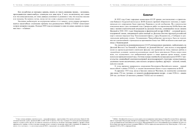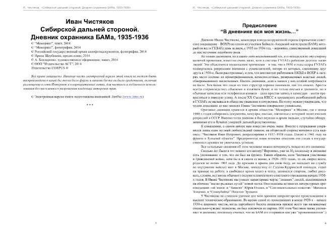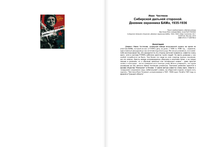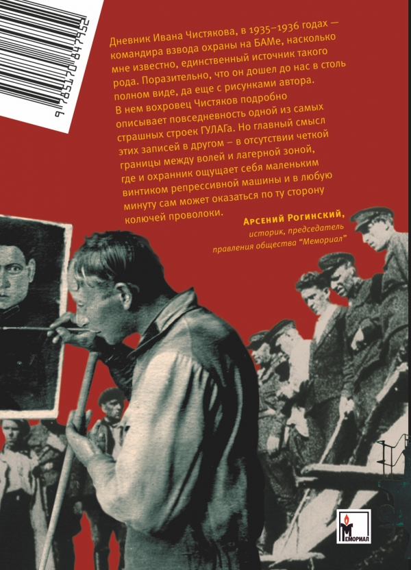 Дневник Ивана Чистякова, командира взвода вооруженной охраны на одном из участков БАМа, который он вел в ГУЛАГе день за днем, с 1935 по 1936 год, - вероятно, единственный дошедший до нас источник подобного рода. Не только дневников, но и каких-либо воспоминаний тех, кто находился по эту сторону колючей проволоки, известно очень мало, хотя в системе ГУЛАГа работали десятки тысяч людей. Но вести дневники у них особой потребности не было.