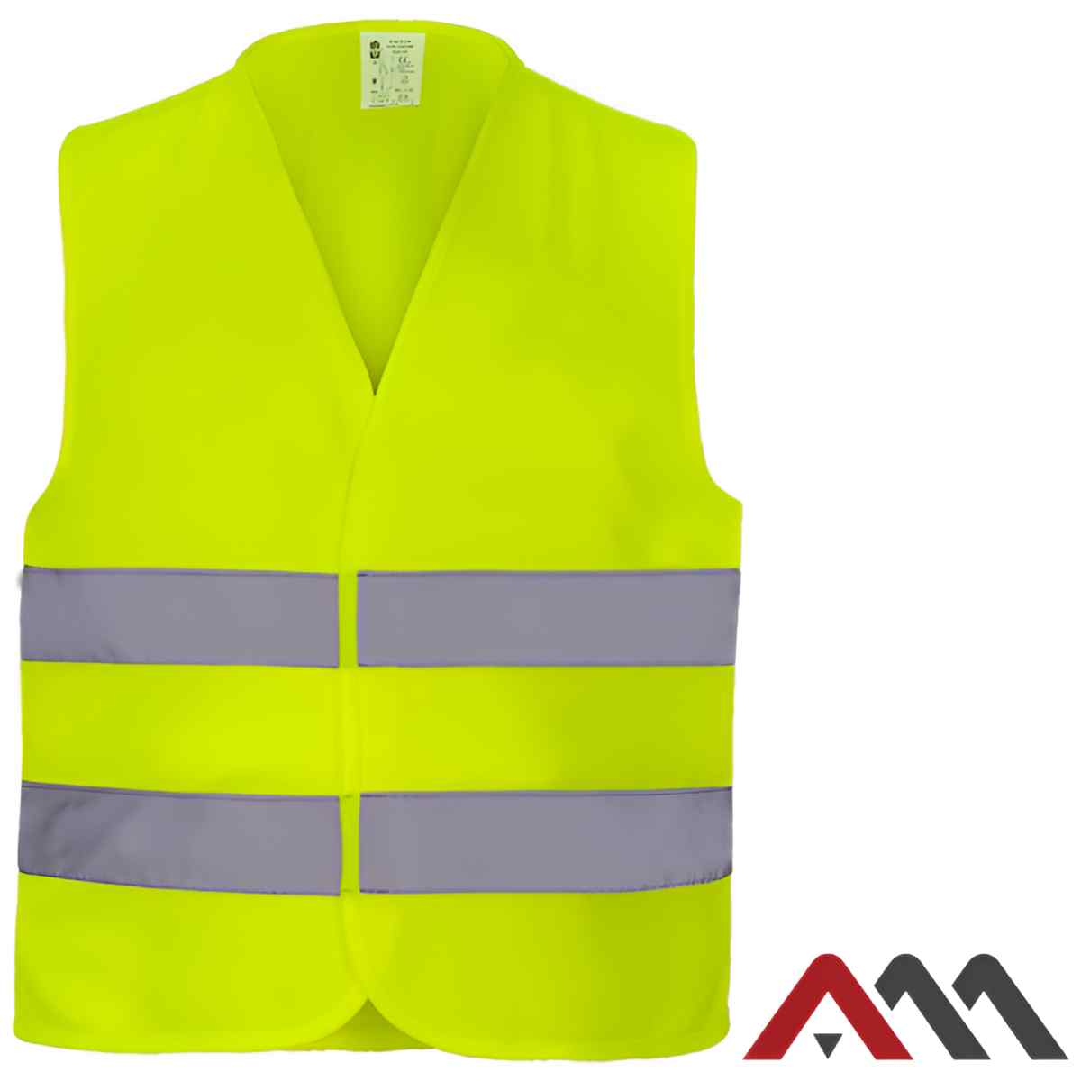 Сигнальный жилет из высококачественной флуоресцентной полиэфирной ткани желтого цвета с двумя светоотражающими полосами, застежка на липучке спереди. Соответствует стандарту EN ISO 20471: 2013 класс 2.