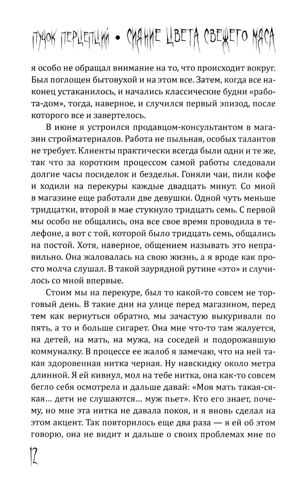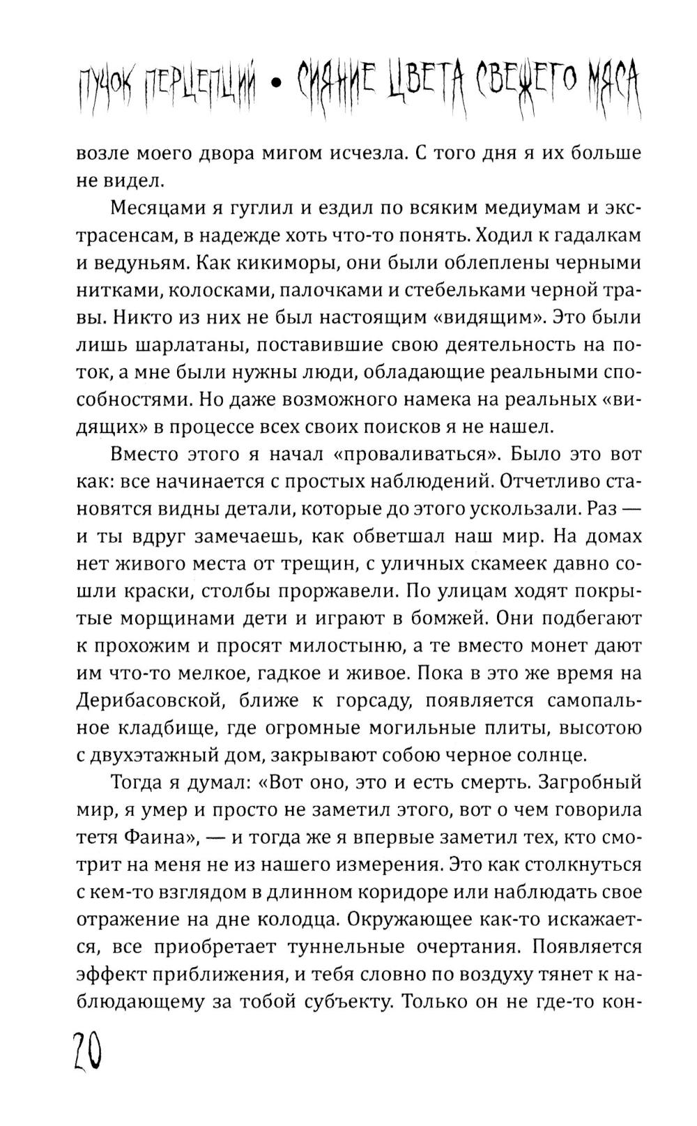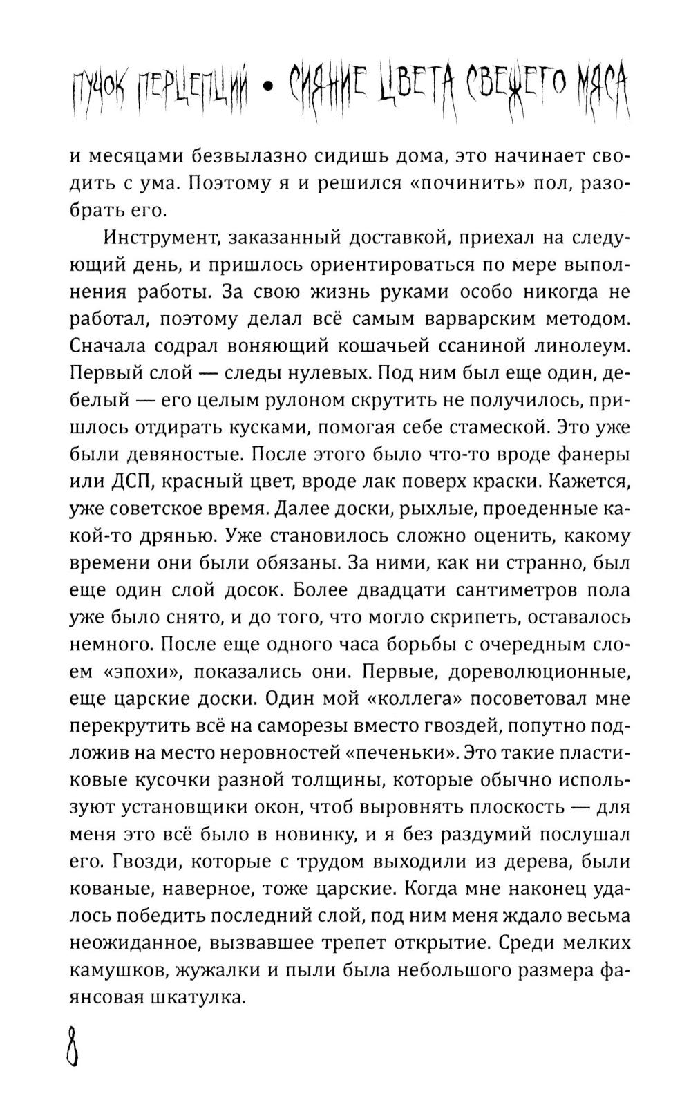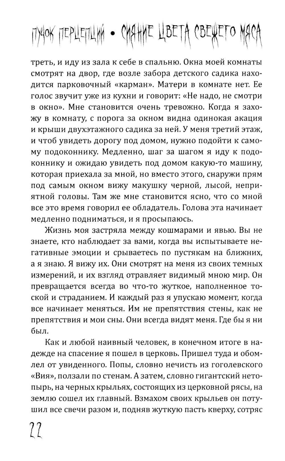 Пучок Перцепций - новый, молодой голос постсоветского хоррора. Один из самых ярких авторов ужасов на всём постсоветском пространстве. Именно он довел лавкрафтовский ужас на фоне панелек и заброшек до невероятного мастерства и филологического совершенства. Подростки рисуют на стене гаража Рыло, - и оно становится порталом в космический ужас. Несколько мажоров оказываются в сельской местности и видят хрущёвки, закопанные по крышу в землю. Загадочный подросток в компьютерном клубе начала нулевых может ввести вас в квартиру, которой нет на карте. Это истории, происходящие в знакомых каждому из нас декорациях разбитых дворов, заброшенных промзон и аварийных домов. Спешите познакомиться с современным русским хоррором!| Издательство | Родина |