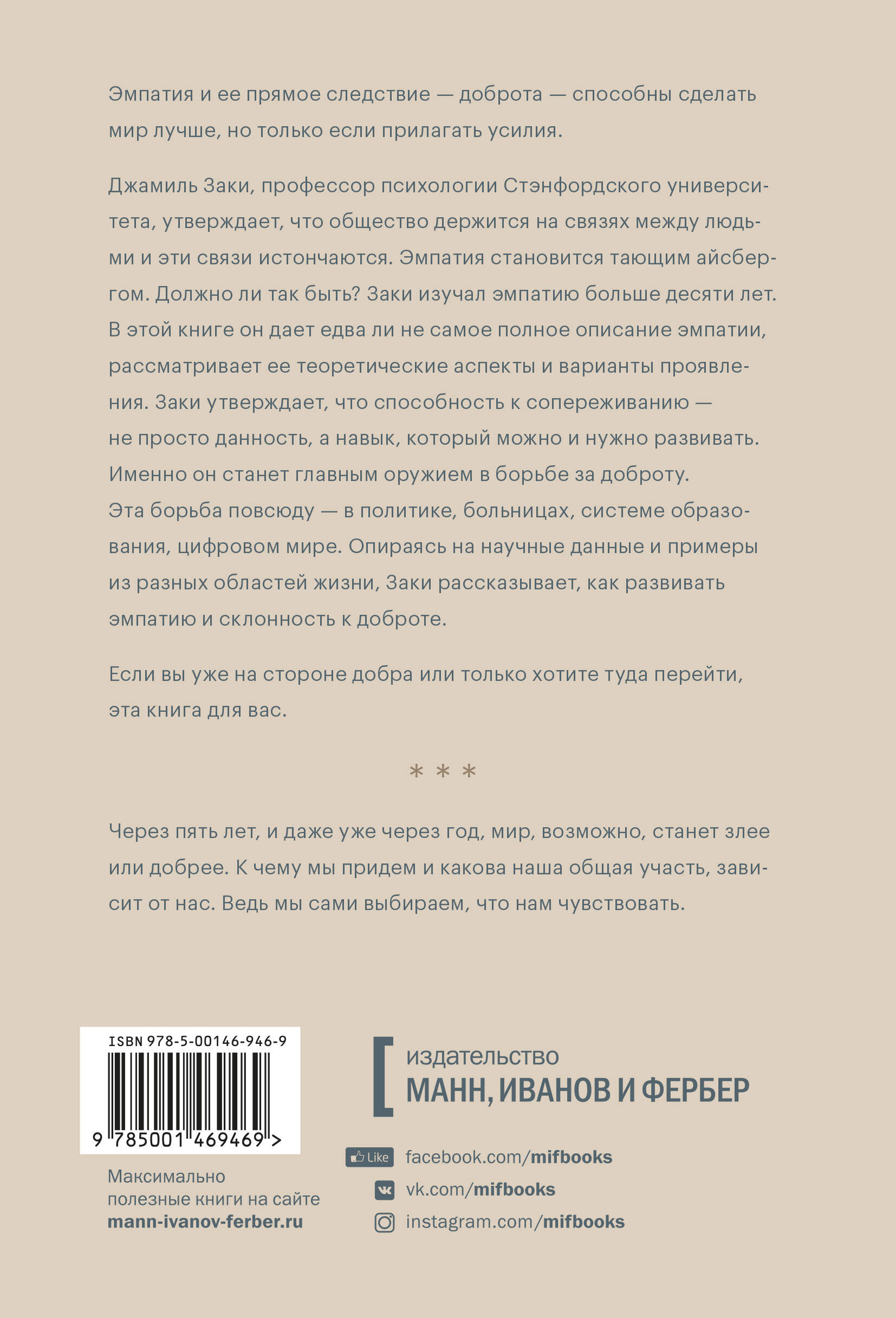 Автор много изучал эмпатию и утверждает, что ее уровень можно сознательно повысить и стать добрее. Эмпатия как проявление доброты необходима, чтобы принимать вызовы нового времени.| Издательство | МАНН, ИВАНОВ И ФЕРБЕР ООО |