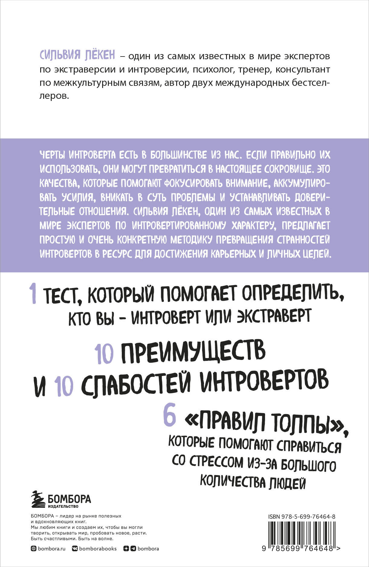 Как интроверту стать успешным в мире экстравертов? Когда планерки кажутся сущим адом, когда дискуссии с коллегами вгоняют в ступор, а корпоративы лишают сил? Сильвия Леккен, один из самых известных в мире экспертов по экраверсии и инроверсии, предлагает набор простых техник, которые позволяют не только сделать пребывание среди людей комфортным, но и помогают превратить странности интровертированного характера в инструменты для достижения успеха. В этой книге вы найдете: • 10 преимуществ и 10 слабостей интровертов; • 6 правил толпы, которые помогают справиться со стрессом из-за большого количества людей; • 5 рекомендаций по воспитанию ребенка-интроверта; • 1 тест для определения, кто вы - интроверт или экстраверт.| Издательство | ООО "Издательство "Эксмо" |