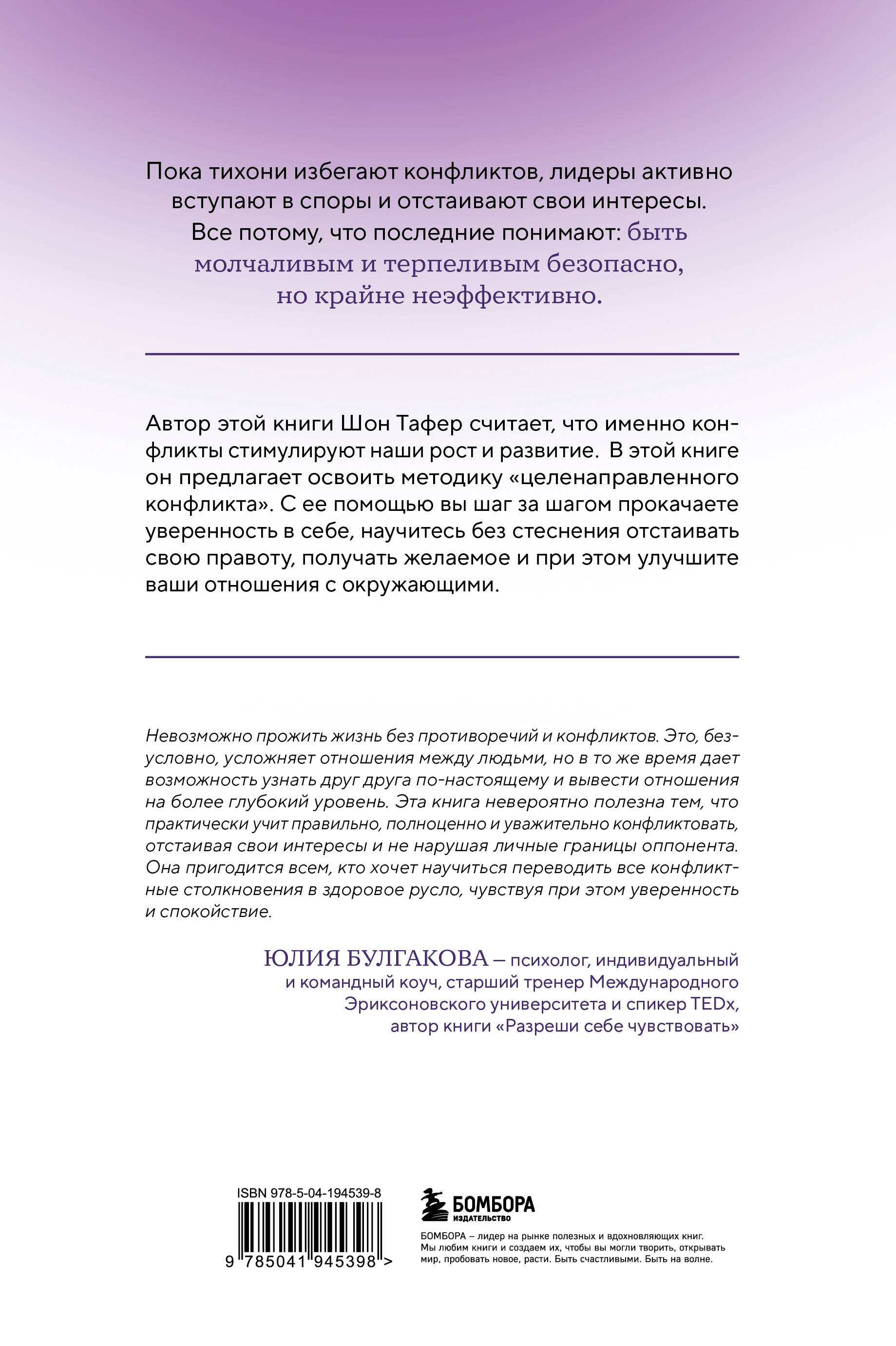 Почему мы перестали высказывать свое мнение? Отчего перестали защищать и обсуждать наши идеалы? И когда мы стали настолько страшиться конфликтов, что утратили способность говорить о жизненно важных вещах даже с самыми близкими? Иногда мы остаемся чертовски тихими - слишком тихими. Наша склонность сдерживаться создала пустоту, которая заполняется другими - теми, кто затем заглушает все, что определяет нас самих. Если мы не заговорим и не позволим нашим голосам быть услышанными, ничего не изменится. И все, что для нас важно, будет захвачено шумным меньшинством, потому что молчание больше не в выигрыше. Цель этой книги - шаг за шагом выстроить вашу уверенность в себе, чтобы вы всегда могли отстоять свою правоту, если возникнет такая необходимость. И неважно, кто окажется вашим соперником - один человек или целая толпа. ОБ АВТОРЕ: Большинство людей знают Джона Таффера как выдающегося телеведущего, который известен своим бескомпромиссным подходом, когда он помогает отелям, ресторанам, барам и предприятиям полностью раскрыть свой потенциал. Это международная знаменитость, автор бестселлеров New York Times, пользующийся большим спросом консультант в сфере гостеприимства и общего бизнеса, а также создатель, исполнительный продюсер и звезда одного из лучших шоу Paramount Network - «Спасти бар». В течение почти четырех десятилетий Джон был в авангарде индустрии управления бизнесом, предлагая свой опыт сотням тысяч предприятий и компаний из списка Fortune 500, создавая то, что эксперты отрасли назвали «величайшим ночным клубом в мире», и навсегда изменив игру в футбол для ее поклонников, придумав Sunday Ticket. ЦИТАТЫ: «Никто не совершенен, и все мы неосознанно делаем вещи, которые могут кого-то обидеть, даже если мы совсем не хотим этого». «Подавление конфликтов ради ложной гармонии на рабочем месте губит дух новаторства и предпринимательства». «Нужно не избегать конфликта, а принимать его, использовать и направлять на благое дело». «Некоторые из величайших идей появляются в результате горячих дебатов, когда каждый участник страстно отстаивает свою точку зрения». «Вы человек, а не робот, и понимание своих эмоций, использование их для страстного общения - ключ к позитивному конфликту».| Издательство | ООО "Издательство "Эксмо" |