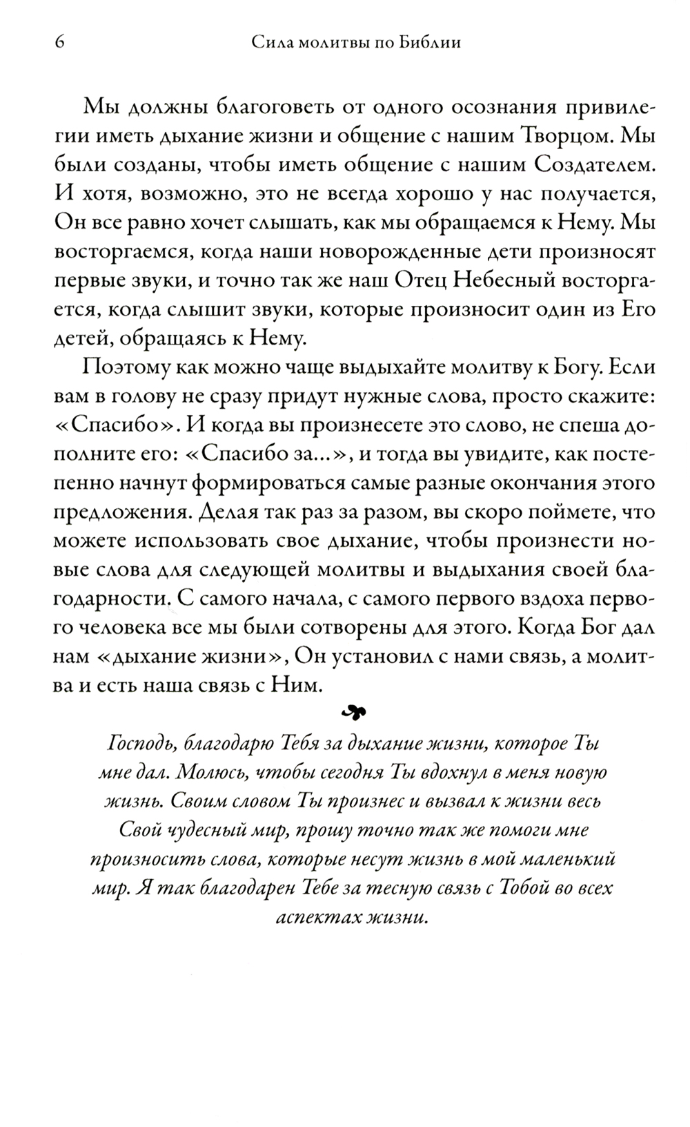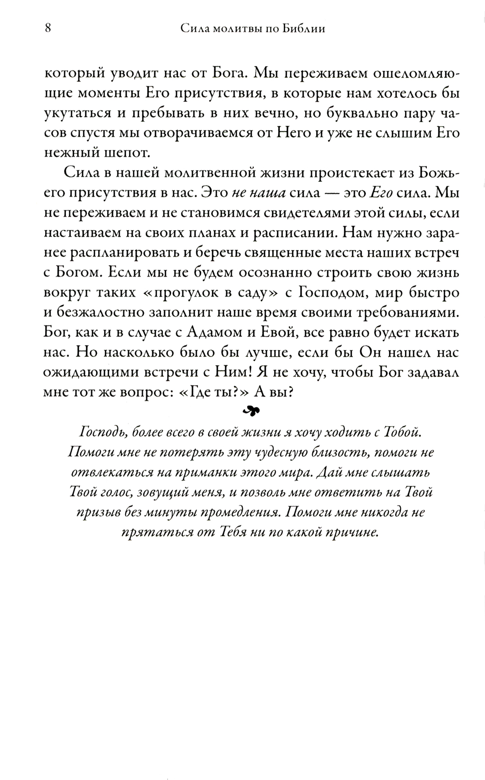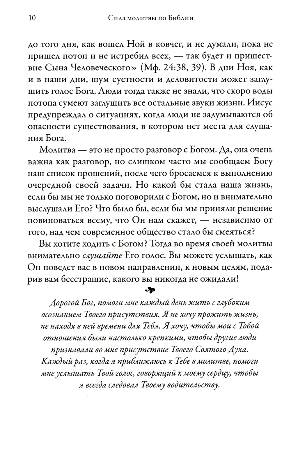 Божье Слово - удивительное свидетельство стремления Господа к общению с теми, кто верит в Него и ищет взаимоотношений с Ним в любви. Среди многих тем, представленных в Библии, молитва является одной из самых важных, ибо общение с Богом и возможность слышать Его обладают силой, способной изменить вашу жизнь. Сторми Омартиан высоко ценит силу молитвы, и миллионы людей достигли более глубокого уровня молитвенной жизни благодаря ее книгам для мужчин, женщин и всей семьи. Теперь она хочет вместе с вами отправиться в путешествие по книгам Библии от Бытия до Откровения, чтобы выяснить, как по Божьему предназначению молитва может позволить • более тесно общаться с Ним; • еще глубже открыть обетования Писания; • еще легче отдавать в Божьи руки свои заботы; • ежедневно ходить с Иисусом в близком общении; • внимательнее прислушиваться к водительству Духа. Этот сборник молитв из серии книг «Сила молитвы» откроет для вас новые молитвы, которые помогут вам начать разговор с Небесным Отцом. А также вы еще ближе познакомитесь с Моисеем, Давидом, Иисусом Навином, пророками, Марией, Марфой и Петром и увидите, как в каждой ситуации молитва предоставляет Богу возможность прикоснуться к вашей жизни. Сторми Омартиан - автор бестселлеров из серии «Сила молитвы» (продано более одиннадцати миллионов экземпляров книг). В эту серию входят такие, в частности, книги, как «Сила молящейся жены» и «Сила молящегося мужа». Не менее популярны также и другие ее книги, такие как «Достаточно света для моего следующего шага» и «Молитва, которая изменяет все вокруг». Сторми и ее муж Майкл женаты более тридцати пяти лет, у них трое взрослых детей.| Издательство | МРО ХВЕП Христианская Миссия |