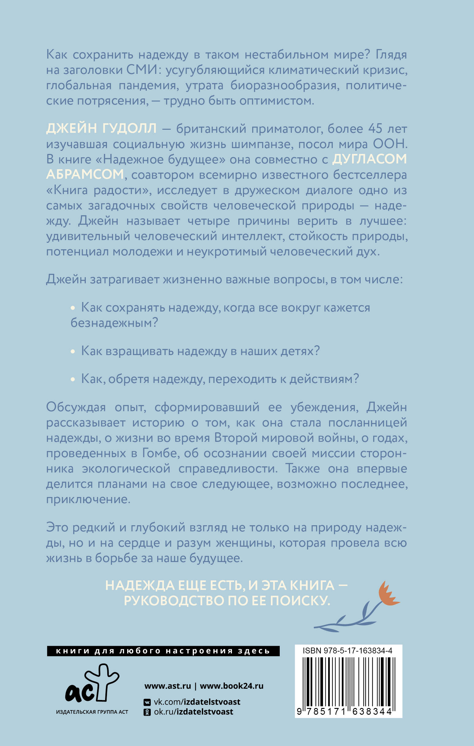 Как сохранить надежду в таком нестабильном мире? Глядя на заголовки СМИ - усугубляющийся климатический кризис, глобальная пандемия, утрата биоразнообразия, политические потрясения, - трудно быть оптимистом. Джейн Гудолл - британский приматолог, более 45 лет изучавшая социальную жизнь шимпанзе, посол мира ООН. В книге "Надежное будущее" она совместно с Дугласом Абрамсом, соавтором всемирно известного бестселлера "Книга радости", исследует в дружеском диалоге одно из самых загадочных свойств человеческой природы - надежду. Джейн называет четыре причины верить в лучшее: удивительный человеческий интеллект, стойкость природы, потенциал молодежи и неукротимый человеческий дух. Джейн затрагивает жизненно важные вопросы, в том числе: - Как сохранять надежду, когда все вокруг кажется безнадежным? - Как взращивать надежду в наших детях? - Как, обретя надежду, переходить к действиям? Обсуждая опыт, сформировавший ее убеждения, Джейн рассказывает историю о том, как она стала посланницей надежды, о жизни во время Второй мировой войны, о годах, проведенных в Гомбе, об осознании своей миссии сторонника экологической справедливости. Также она впервые делится планами на свое следующее, возможно последнее, приключение. Это редкий и глубокий взгляд не только на природу надежды, но и на сердце и разум женщины, которая провела всю жизнь в борьбе за наше будущее. Надежда еще есть, и эта книга - руководство по ее поиску.| Издательство | Издательство "АСТ" |