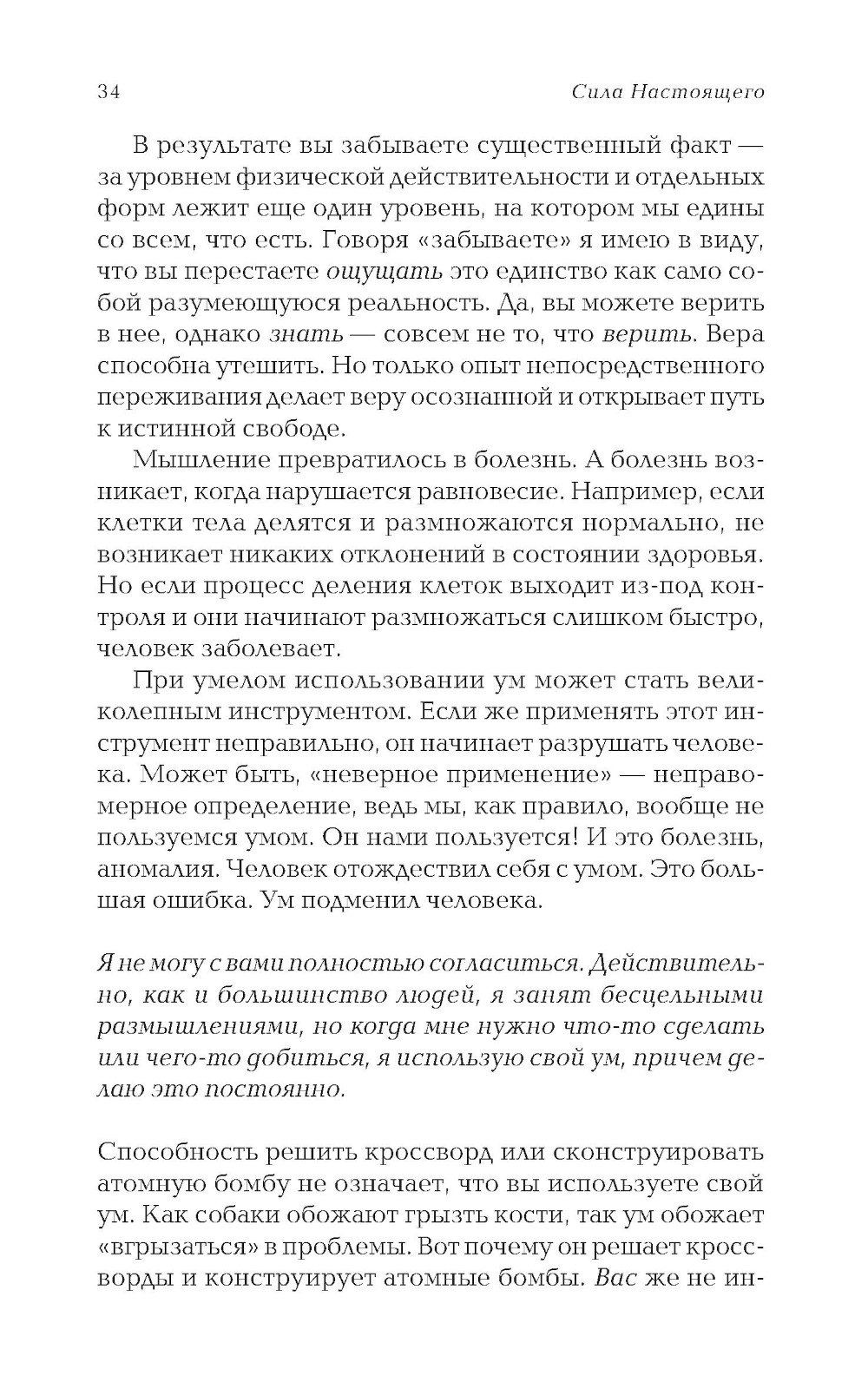 Все проблемы, страдания и боль порождаются нашим эгоистичным умом, цепляющимся за свое ложное "я". Вырваться из его плена можно только через абсолютное присутствие в Настоящем - единственно реальном моменте жизни. Именно в Настоящем мы обретаем свою истинную суть, а также радость и понимание того, что целостность и совершенство есть не цель, а реальность, доступная нам уже сейчас.| Издательство | София |