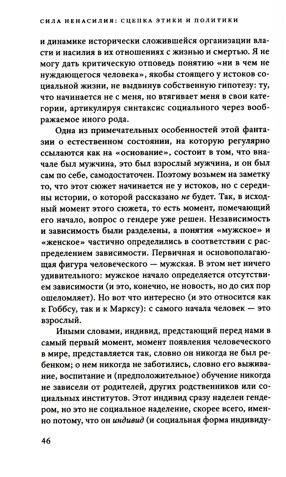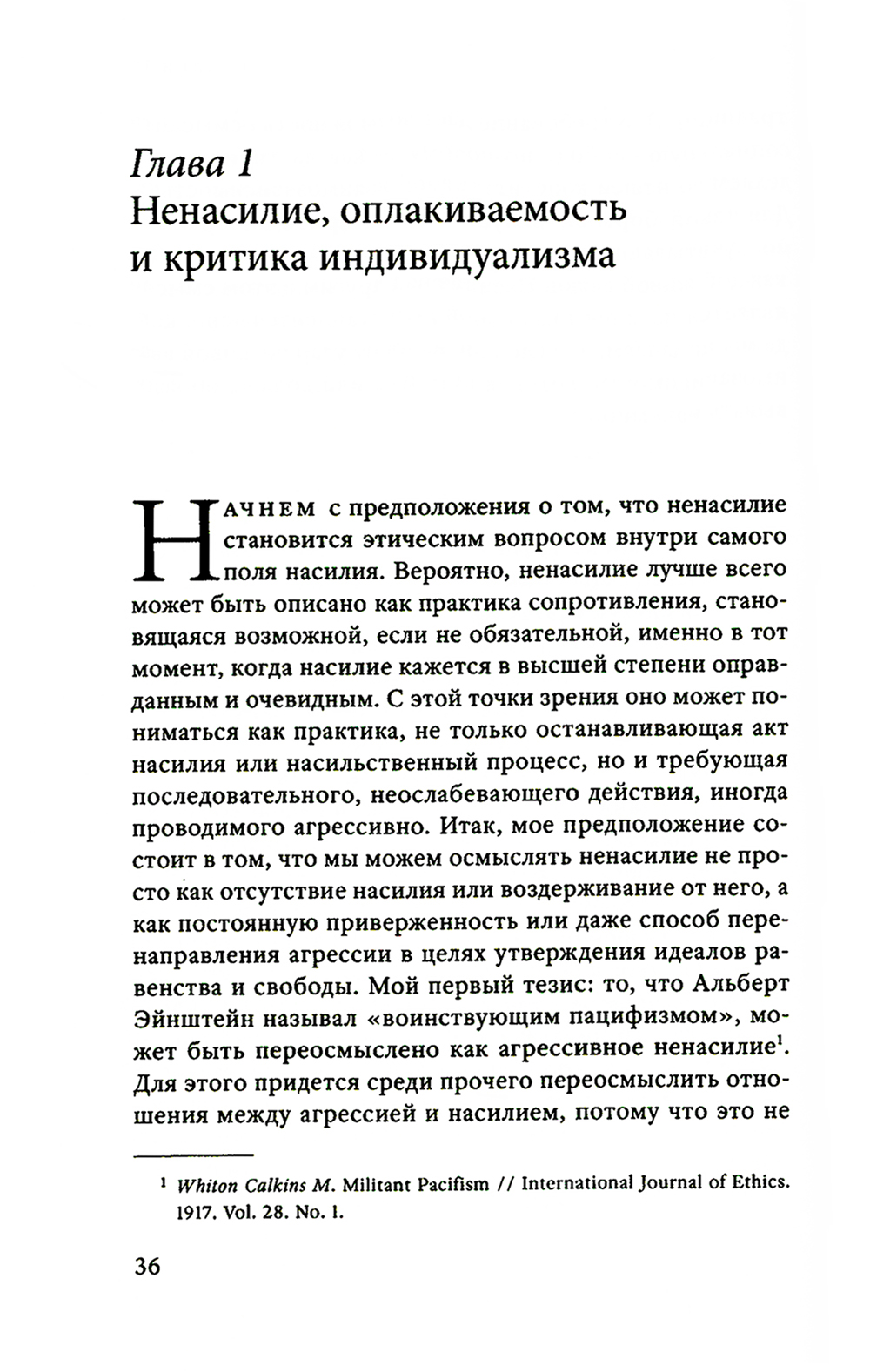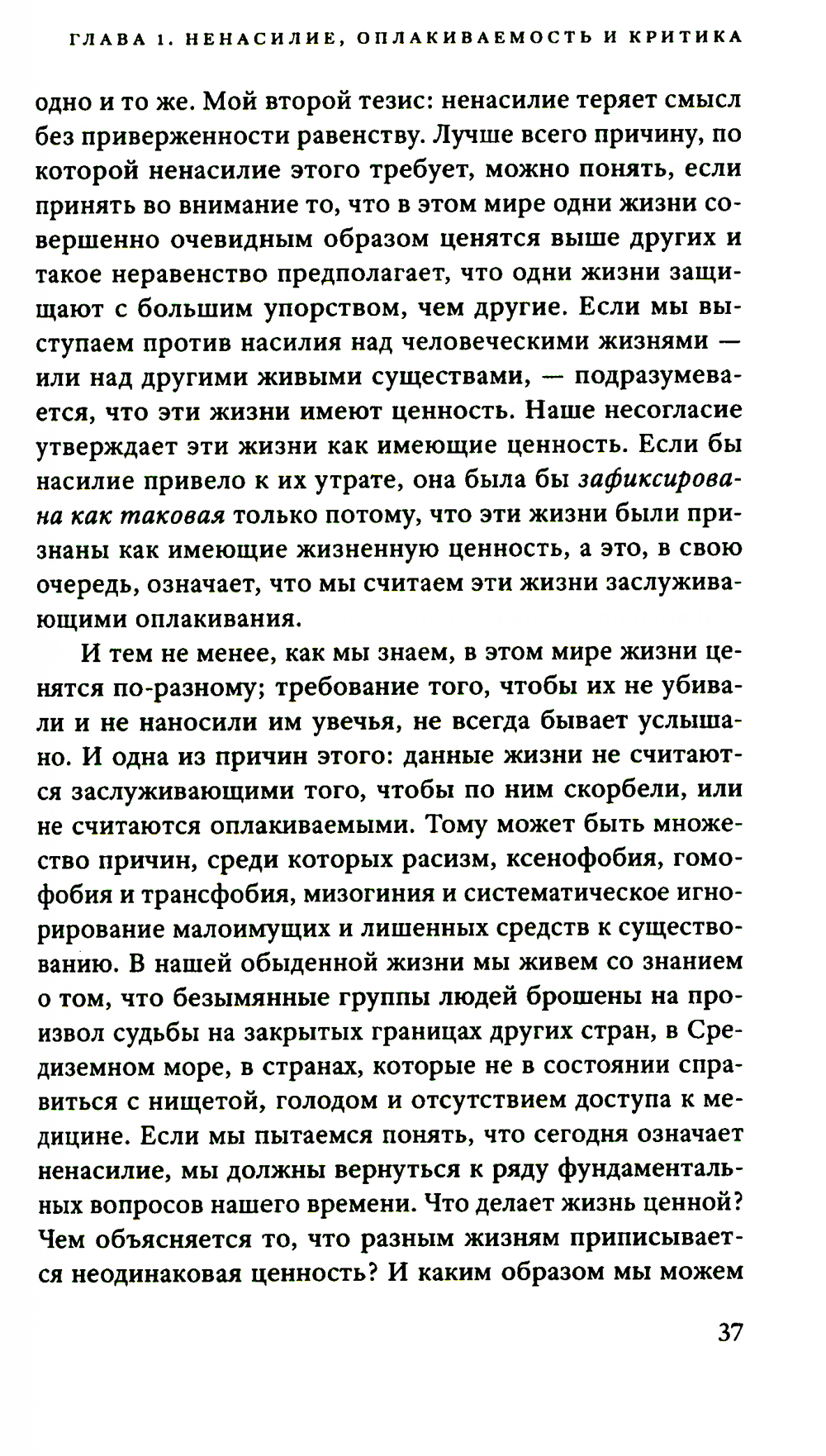 В своей новой книге Джудит Батлер доказывает, что этика ненасилия должна связываться с широкой политической борьбой за социальное равенство. Один из современных вызовов, с которыми сталкивается политика ненасилия, сводится к существованию расхождения во мнениях о том, что считать насилием и ненасилием. Батлер утверждает, что ненасилие часто ошибочно принимают за пассивную практику или за сосуществование с властью, но на самом деле ненасилие - этическая позиция, находящаяся в самой гуще политического поля. Если рассматривать ненасилие как этическую проблему в рамках социальной и политической философии, то потребуется осуществить критику индивидуализма, а также понять психосоциальный аспект насилия. Агрессивная форма ненасилия принимает то, что враждебность - составная часть нашего психического устройства, но она также ценит амбивалентность как способ предотвращения перерастания агрессии в насилие. Книга адресована философам, социологам, политологам, культурологам и тому кругу читателей, кому интересно знать, что сегодня происходит в современной социальной и политической философии.