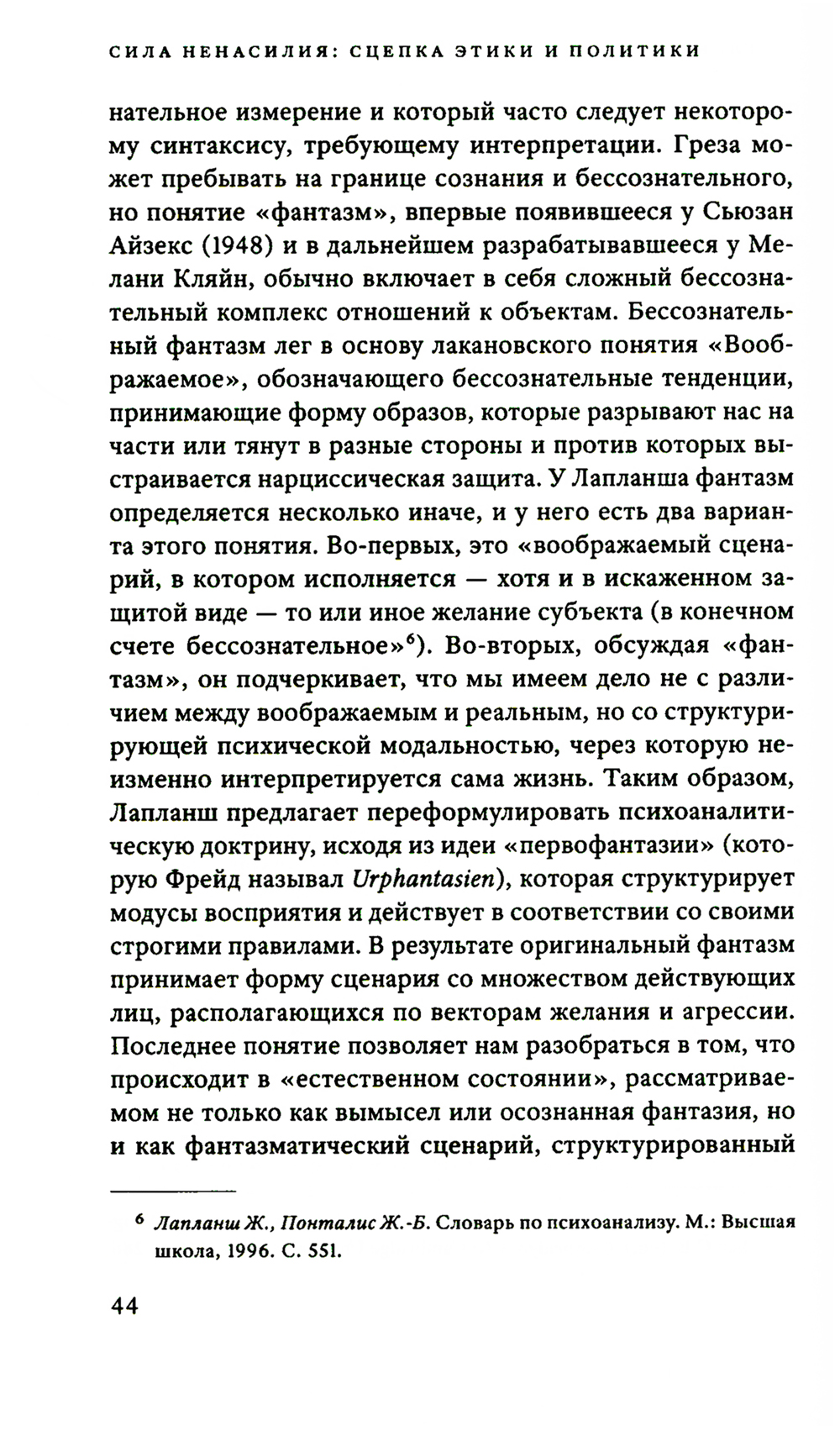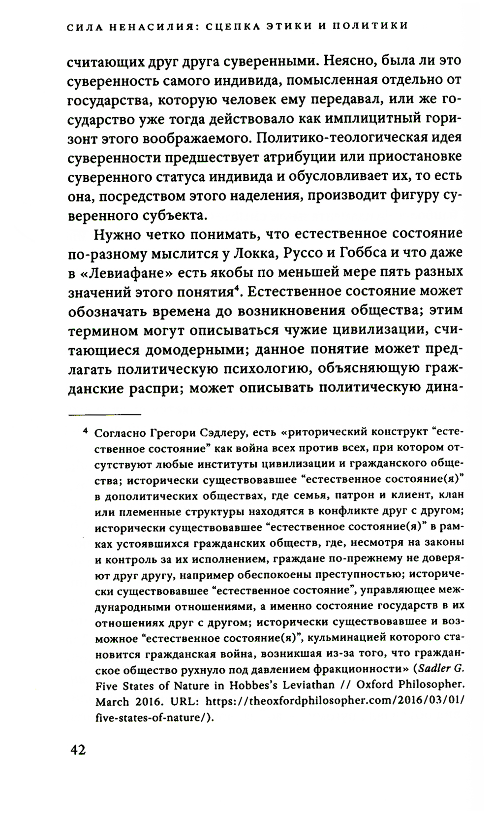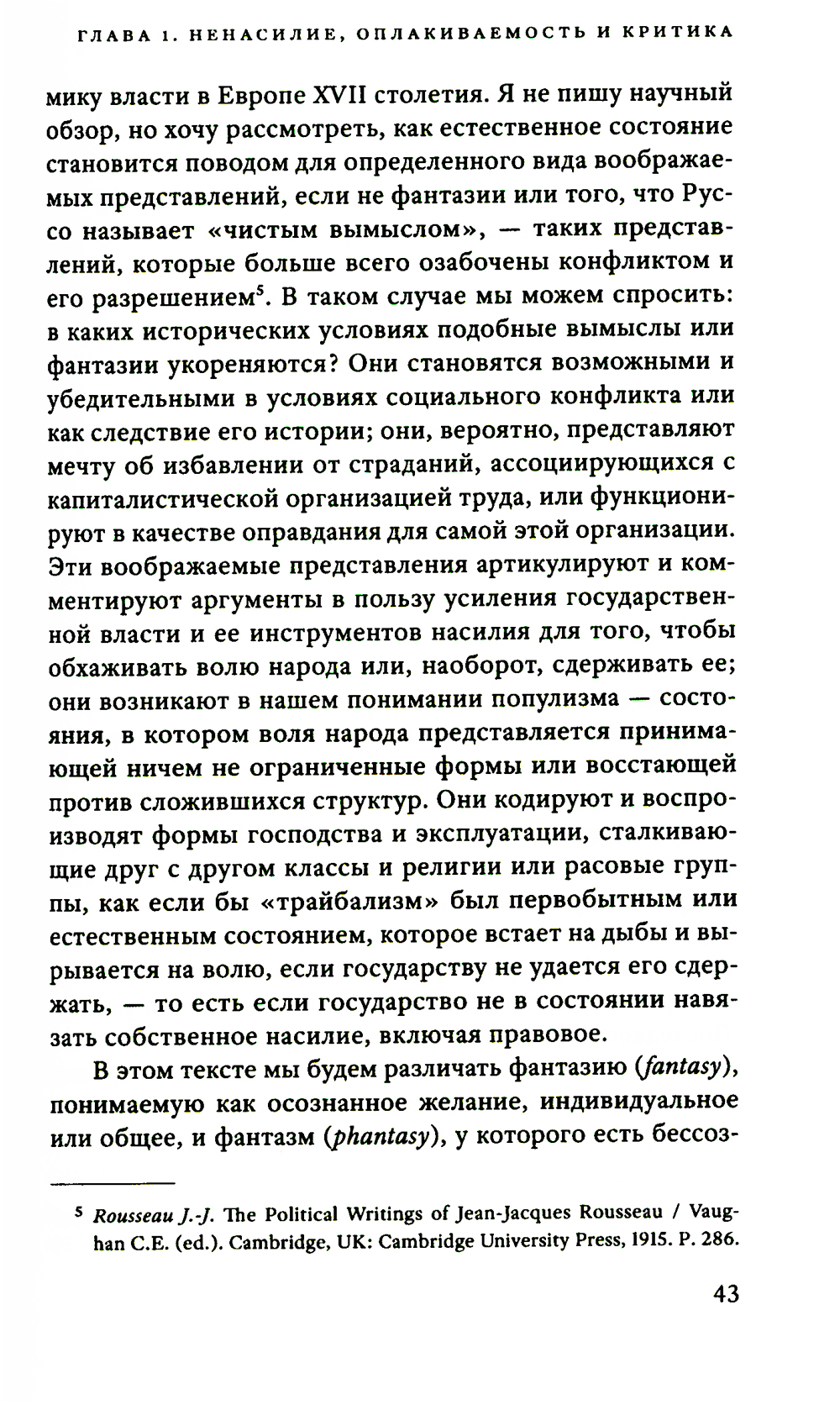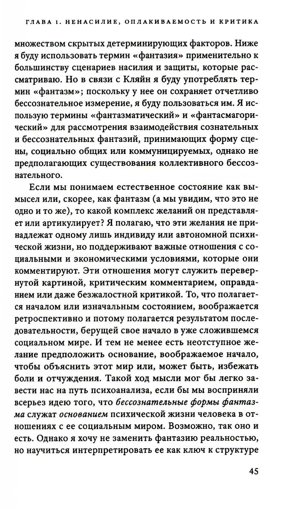 В своей новой книге Джудит Батлер доказывает, что этика ненасилия должна связываться с широкой политической борьбой за социальное равенство. Один из современных вызовов, с которыми сталкивается политика ненасилия, сводится к существованию расхождения во мнениях о том, что считать насилием и ненасилием. Батлер утверждает, что ненасилие часто ошибочно принимают за пассивную практику или за сосуществование с властью, но на самом деле ненасилие - этическая позиция, находящаяся в самой гуще политического поля. Если рассматривать ненасилие как этическую проблему в рамках социальной и политической философии, то потребуется осуществить критику индивидуализма, а также понять психосоциальный аспект насилия. Агрессивная форма ненасилия принимает то, что враждебность - составная часть нашего психического устройства, но она также ценит амбивалентность как способ предотвращения перерастания агрессии в насилие. Книга адресована философам, социологам, политологам, культурологам и тому кругу читателей, кому интересно знать, что сегодня происходит в современной социальной и политической философии.