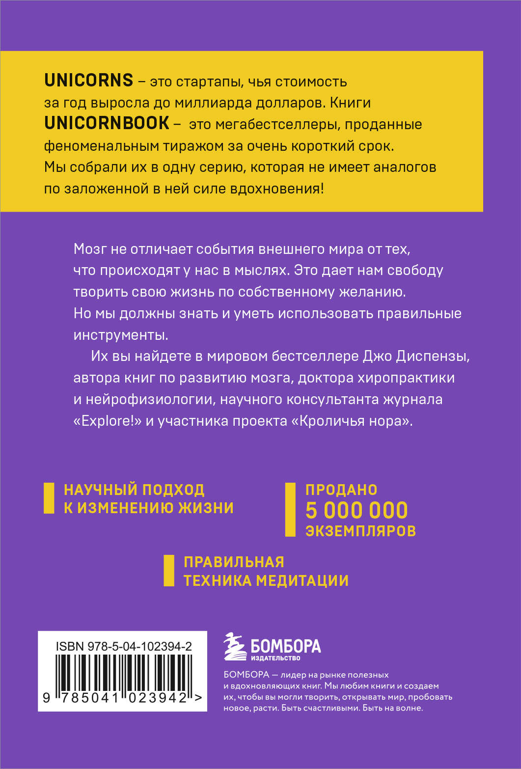 Научный подход к изменению и перепрограммированию жизни. Эксперименты и опыты с невероятными результатами. Фундаментальная перестройка мыслей и эмоций. Правильная техника медитации. Мировой бестселлер - продано 5 000 000 экземпляров. ОБ АВТОРЕ Доктор Диспенза - профессор нейрохимии и нейробиологии, руководитель клиники интегрированной медицины. Автор мировых бестселлеров по развитию мозга. Джо Диспенза выступает с мастер-классами в 26 странах на 5 континентах. Он обучил тысячи людей, как перенастроить свой мозг и тело, чтобы улучшить здоровье и жизнь. Диспенза - первый автор, которому удалось понятно, доступно и на научном языке объяснить работу подсознания. О КНИГЕ Атомы на 99,9% состоят из энергии и на 0,1% - из материи. Это значит, что человек и весь мир в целом - не твердая материя, а энергетические поля и информационные частоты. Каждый из нас сознательно или неосознанно излучает в мир энергию - положительную или отрицательную. Нам не нужно смиряться с реальностью, ведь в любой момент мы можем создать новую. Перестроив свои мысли и эмоции, можно изменить свой мозг. А значит, и свою жизнь.| Издательство | ООО "Издательство "Эксмо" |
