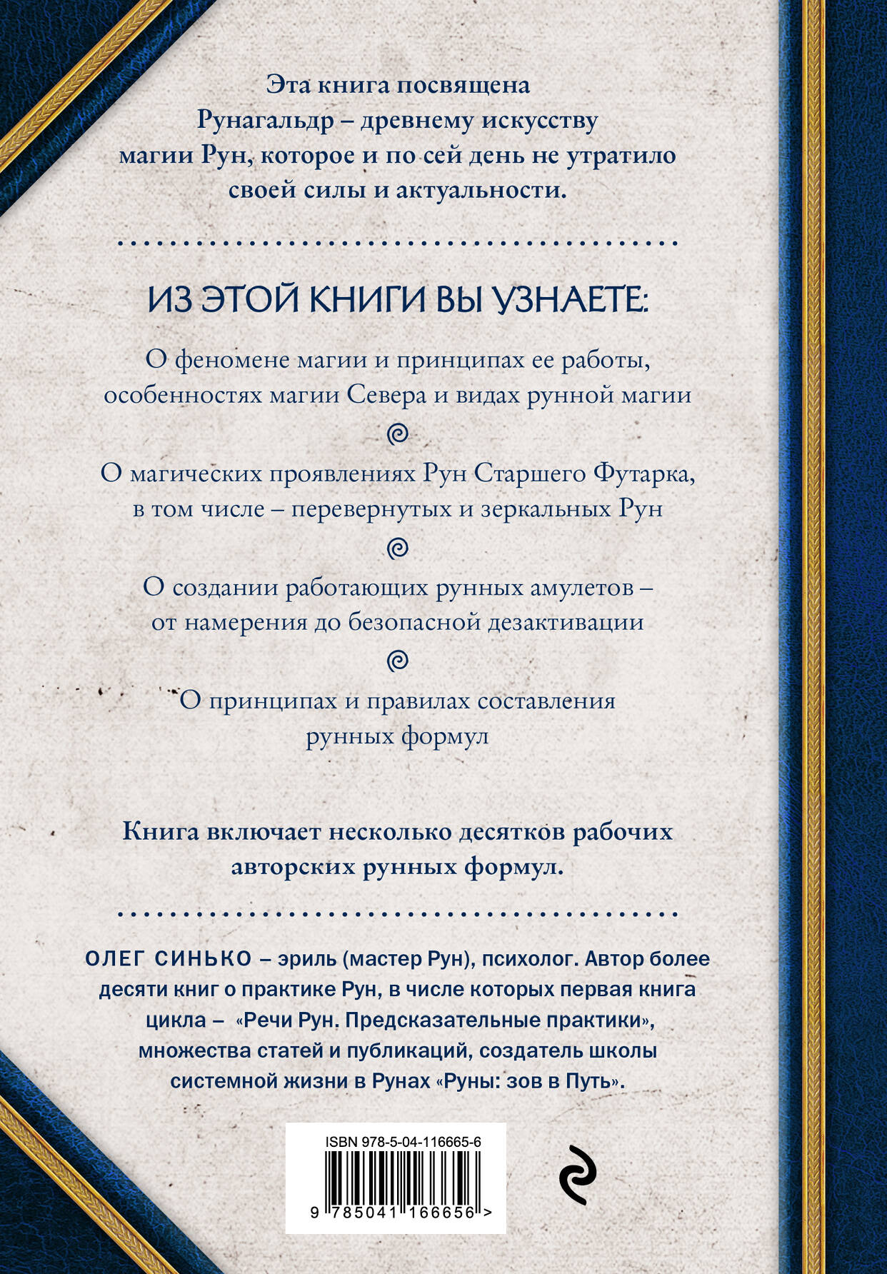 Новая книга Олега Синько, эриля, мастера Рун и создателя школы «Руны: зов в Путь» посвящена Рунагальдр - древнему искусству «магии рун». В ней подробно рассматривается магия в целом, этические аспекты магической работы, взаимоотношения мага с эгрегорами, силами и богами, а также магия Севера и особенности рунной магии. Эта книга необходима всем, кто хочет досконально разобраться в том, как действует магия рун, и ищет максимально полную информацию, чтобы сделать свою практику эффективной и безопасной. Из этой книги вы узнаете: • О феномене магии и принципах ее работы, особенностях магии Севера и видах рунной магии. • О магических проявлениях рун Старшего Футарка, в том числе - перевернутых и зеркальных рун. • О создании работающих рунных амулетов - от намерения до безопасной дезактивации. • О принципах и правилах составления рунных формул. Книга включает несколько десятков рабочих авторских рунных формул. Олег Синько - эриль (мастер рун), психолог. Автор более десяти книг о практике рун, в числе которых первая книга цикла - «Речи рун. Предсказательные практики», множества статей и публикаций, создатель школы системной жизни в рунах «Руны: зов в Путь».| Издательство | ООО "Издательство "Эксмо" |