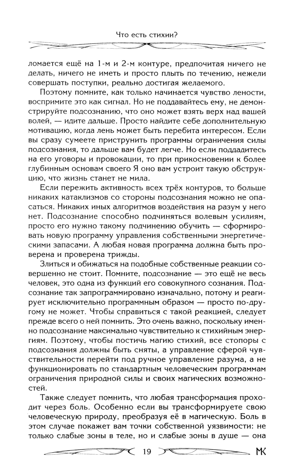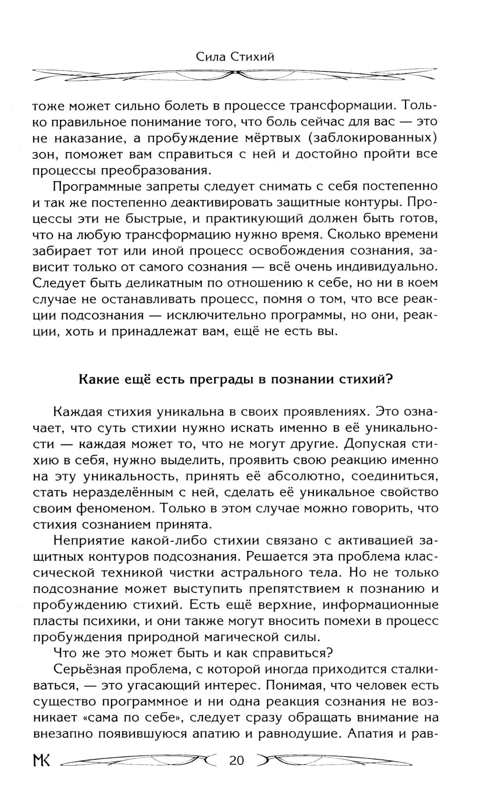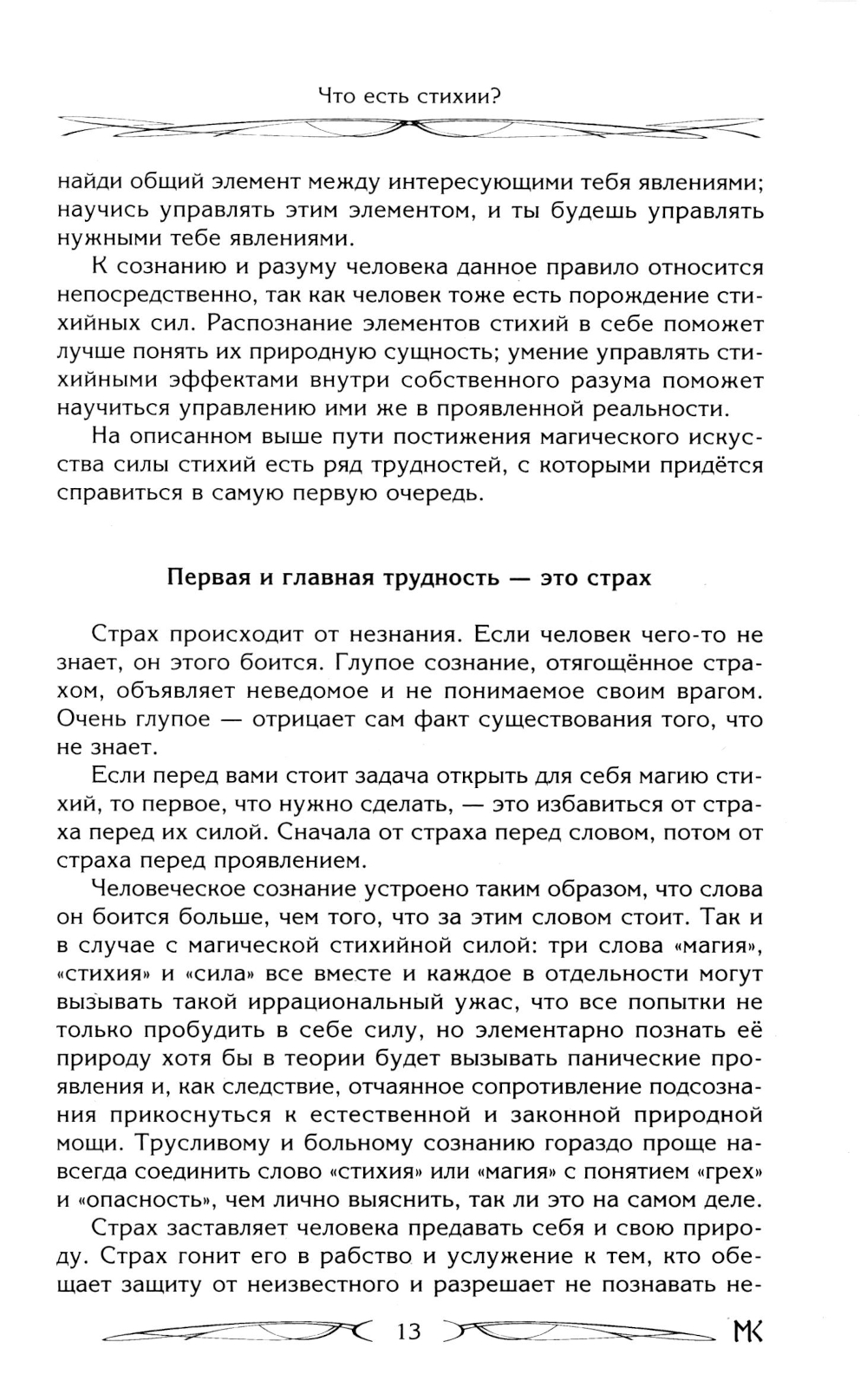 С понятием стихий мы знакомы с детства. Земля, по которой ходим, огонь, что согревает, вода, которую пьём, и воздух, которым дышим, так же естественны для восприятия, как и то, что всё перечисленное есть основание для жизни. К естественному быстро привыкаешь и перестаёшь замечать удивительные вещи, которые делают человека живым, а ощущение жизни реальным... Однако цель этой книги совсем не в том, чтобы убедить вас в очевидности состояния «жизнь» или необходимости беречь природу. Цель в том, чтобы рассказать вам о стихийных силах в оккультном, магическом смысле, раскрыть их истинную суть. Каждый может прийти в мир с набором прав, но может и бесправным. Единственное, что у каждого человека есть как базис, как основа формирования любых прав, это Сила Стихий. Даже совершенно бесправный человек может поднять себя до невероятных высот, если научится работать со стихийными силами. Познание стихийных сил это познание своей настоящей природы. Это познание природы мира, в котором живёт человек, природы истинной, изначальной. Познание ведёт к пониманию, а понимание даёт контроль. Контроль над своей природой это первый шаг к постижению великого искусства магии.| Издательство | Центрполиграф |