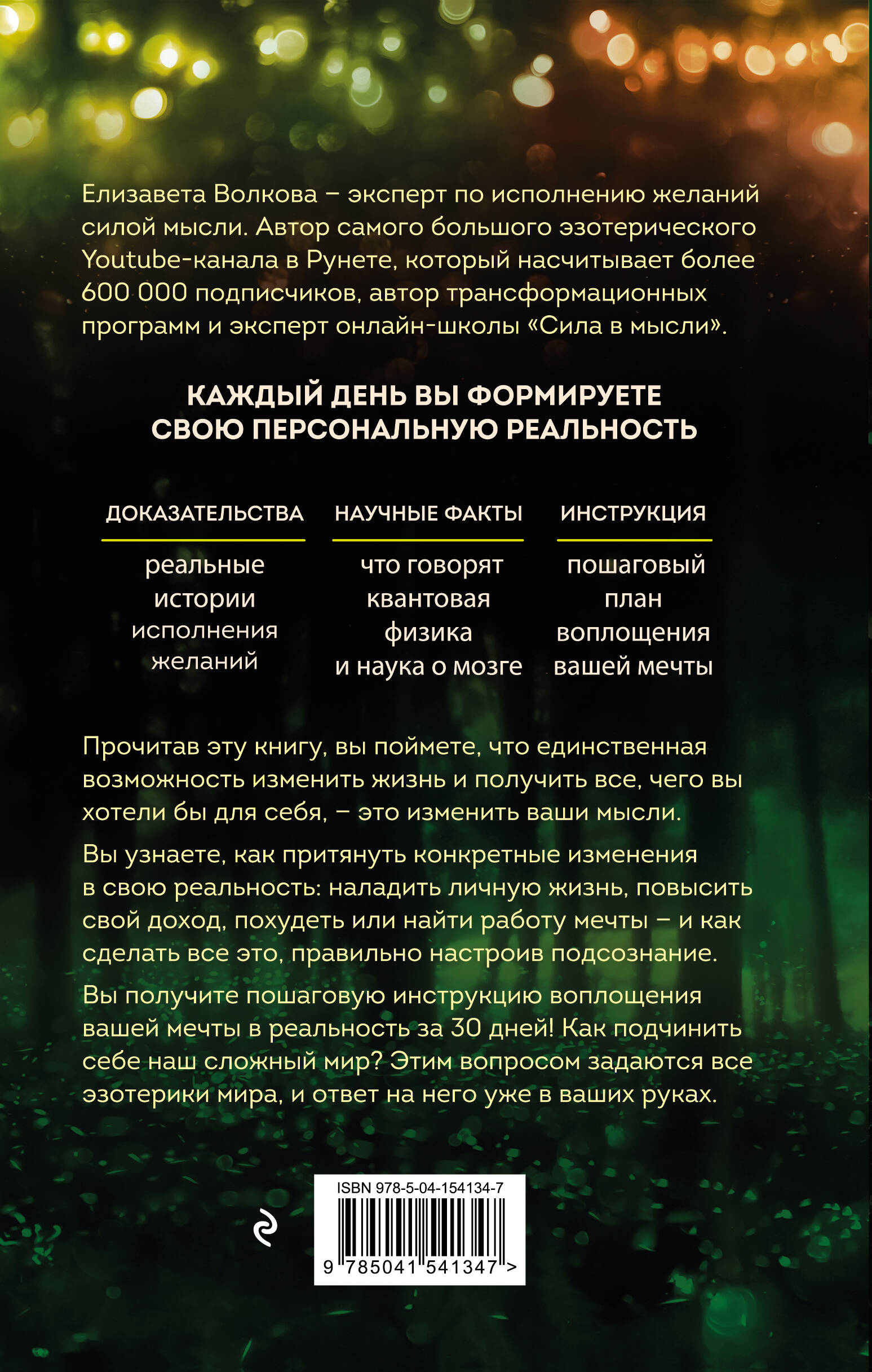 Разрешите себе наконец стать счастливым! Не в следующей жизни, а в этой. Елизавета Волкова, эксперт по исполнению желаний, разработала собственную программу «волшебства» на 30 дней. Психологические практики, задание на проработку блоков и страхов, упражнения для самоанализа. Из книги вы узнаете, как притянуть изменения в свою реальность: наладить личную жизнь, повысить доход, похудеть или найти работу мечты. Все, что нужно, это осознать себя в квантовом поле возможностей и выбрать нужный вариант развития событий. Если решите быть успешным, богатым, счастливым, то это решение будет той стартовой точкой, после которой вы создадите собственную судьбу. То, о чем вы думали вчера, материализуется сегодня, а то, о чем вы думаете сегодня, произойдет завтра. Елизавета Волкова - эксперт по исполнению желаний. Автор самого большого эзотерического YouTube канала в рунете, который насчитывает более 600 000 подписчиков. Ее блог silavmisli.ru ежедневно читают более 10000 человек со всего мира. Автор трансформационных программ и эксперт онлайн-школы «Сила в мысли». Каждый день вы формируете свою персональную реальность. • Доказательства: реальные истории исполнения желаний. • Научные факты: что говорит квантовая физика и наука о мозге. • Инструкция: пошаговый план воплощения вашей мечты. 45 000 учеников. 1 000 000 исполненных желаний. Единственная возможность изменить жизнь и получить все, чего вы хотите - это изменить свои мысли. Из книги вы узнаете, как притянуть конкретные изменения в свою реальность: наладить личную жизнь, повысить свой доход, похудеть или найти работу мечты. Вы получите точную пошаговую инструкцию воплощения вашей мечты в реальность за 30 дней! Как подчинить себе наш сложный мир? Этим вопросом задаются все эзотерики мира, и ответ на него уже в ваших руках.