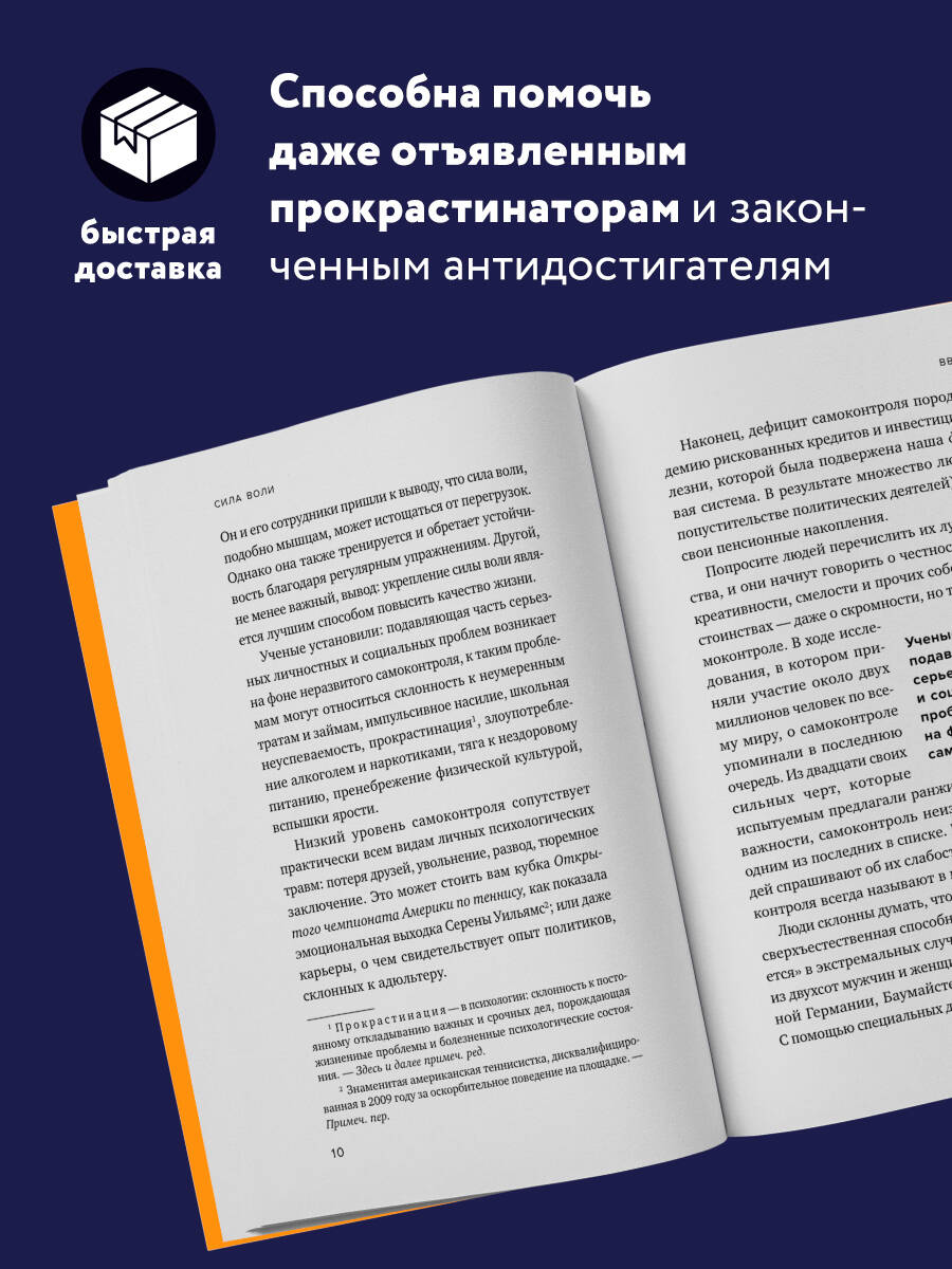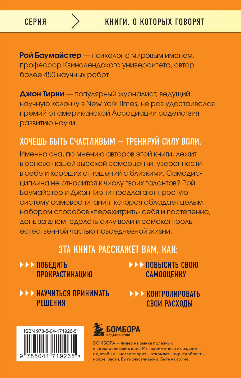 От издателя О чем эта книга Нехватка силы воли - главная социальная патология наших дней, считают авторы этой книги. Шопоголизм, прокрастинация, низкая самооценка, хроническая депрессия, конфликты с близкими - за большинством подобных проблем обнаруживается недостаток самоконтроля. И, напротив, именно способность держать себя в руках лежит в основе едва ли не всех историй успеха. Понимая это, два блистательных ума, Рой Ф. Баумайстер и Джон Тирни, предлагают читателям простую систему самовоспитания. Она бесконечно реалистична и базируется на физиологических особенностях человеческого организма. Так, например, авторы увязывают проявления силы воли с тем, какие решения приходилось принимать накануне, с содержанием уровня глюкозы в крови, с гормональными процессами в организме. Подход Баумайстера и Тирни - редкий случай, когда проблему предлагается решать не в лоб, а используя обходные, зачастую куда более короткие, чем основной, пути. Для кого эта книга Для всех, кто страдает от нехватки силы воли. Всю жизнь пытается ее компенсировать и каждый раз одерживает поражение. Это удивительная книга, которая способна помочь даже отъявленным прокрастинаторам и законченным антидостигателям. Об авторах Рой Баумайстер - психолог с мировым именем, профессор Квинслендского университета, автор более 450 научных работ. Джон Тирни - популярный журналист, ведущий научную колонку в New York Times, не раз удостаивался премий от американской Ассоциации содействия развитию науки. Чем привлекательная эта книга Во-первых, в своих выводах авторы опираются на масштабные исследования, проведенные с немецкой скрупулёзностью. Причем, большая часть этих исследований осуществлялось под руководством непосредственно Роя Баумайстера. Во-вторых, все рекомендации авторов подкреплены поистине фееричными примерами из жизни знаменитостей. Так, в «Силе воли» можно прочитать историю борьбы с лишним весом Опры Уинфри и зарисовки, посвященные Аманде Палмер, когда ей приходилось зарабатывать на жизнь, изображая живую статую. Читая книгу Баумайстера и Тирни, не единожды ловишь себя на желании воскликнуть: «Ничего себе! Неужели это правда?» ОТЗЫВЫ О КНИГЕ: «Сила воли затрагивает почти все стороны нашей жизни - повседневные дела, пенсионные накопления, спортивные занятия и многое другое. Тирни и Баумайстер создали замечательную книгу, где не только рассказывают об удивительных научных исследованиях, но и делятся с нами простыми способами, с помощью которых мы можем использовать это важное качество». - Дэн Ариэли, университет Дьюка. Автор книги «Предсказуемо иррационально» «Сила воли упоительно превосходна - начав читать, вы не сможете остановиться. Удивительное новое знание о самоконтроле, о котором увлекательно рассказывают исследовавший его ученый и журналист, сделавший из этих сведений сенсацию». - Дэниел Джилберт, Гарвардский университет, автор книги «Спотыкаясь о счастье», ведущий телепередачи PBS «Эта эмоциональная жизнь»| Издательство | ООО "Издательство "Эксмо" |
