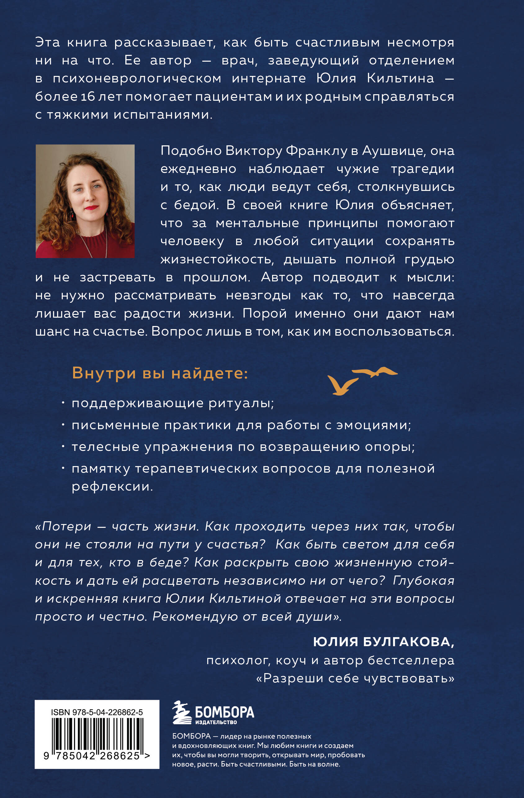 Эта книга о том, как оставаться счастливым несмотря ни на что. Здесь вы узнаете про человеческий опыт и внутренний выбор, который всегда сильнее обстоятельств. Юлия Кильтина - врач, заведующая отделением в хосписе и талантливый писатель. Более 16 лет она помогает пациентам и их родным справиться с тяжелыми испытаниями. В своей книге она делится историями реальных людей и рассказывает, как на руинах прошлого вырастить нового себя - сильного, открытого и по-настоящему счастливого. Книга - поддержка, маяк и заботливый друг. Внутри вы найдете: - Список поддерживающих ритуалов. - Письменные практики для работы с эмоциями. - Телесные упражнения по возвращению опоры. - Памятку терапевтических вопросов для полезной рефлексии. ОТЗЫВ: «В нашем воспитании отсутствует культура проживания боли, горя, потерь и разочарований. Мы либо застреваем в своих печалях на долгие годы, либо пытаемся подавить их и продолжать делать вид, что живем полной жизнью. Но потери - часть жизни. Как проходить через них так, чтоб они не стояли на пути у счастья? Как быть светом для себя и для тех, кто в беде? Как раскрыть свою жизненную стойкость и дать ей расцветать независимо ни от чего? Глубокая и искренняя книга Юлии Кильтиной отвечает на эти вопросы просто и честно. Рекомендую от всей души». - Юлия Булгакова, психолог, коуч и автор бестселлера «Разреши себе чувствовать» ЦИТАТЫ: - Если человек «застревает в безвременье» слишком надолго, его внутренняя электрическая сеть может «заржаветь», ресурсы нейромедиаторов истощаются, а центры регуляции эмоций «забывают», как быть счастливым. - Иногда слышать себя - это разрешить себе не делать. Иногда - попробовать и отказаться. А иногда - заметить: «Мне тяжело, я не хочу, но хочу снова хотеть». - Если в вас нет веры - это не значит, что у вас нет места для нее. Просто пока это место в состоянии ожидания, как горшок с землей под дождем. В нем еще ничего не растет. Но сама пустота - уже форма готовности. - Спросите себя: действительно ли это ваша ноша? Или, быть может, стоит сделать первый шаг к обычному, не всесильному себе? Не для того, чтобы сдаться. А чтобы остаться в живых и быть рядом с теми, кто дорог. Ради них - и ради себя самого. - Мы все время ищем прежних себя. Хватаемся за докризисные фотографии, за старые места и прежние привычки - как будто вернуться туда и значит «восстановиться». Но никто не говорит нам, что восстановление - это не возвращение. Это - собирание нового из тех обломков, которые остались, и новых материалов. Из света, движения и дыхания.| Издательство | ООО "Издательство "Эксмо" |