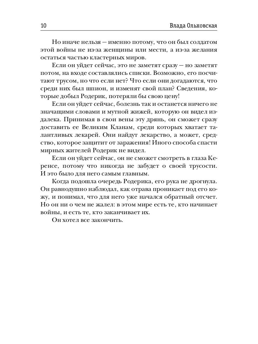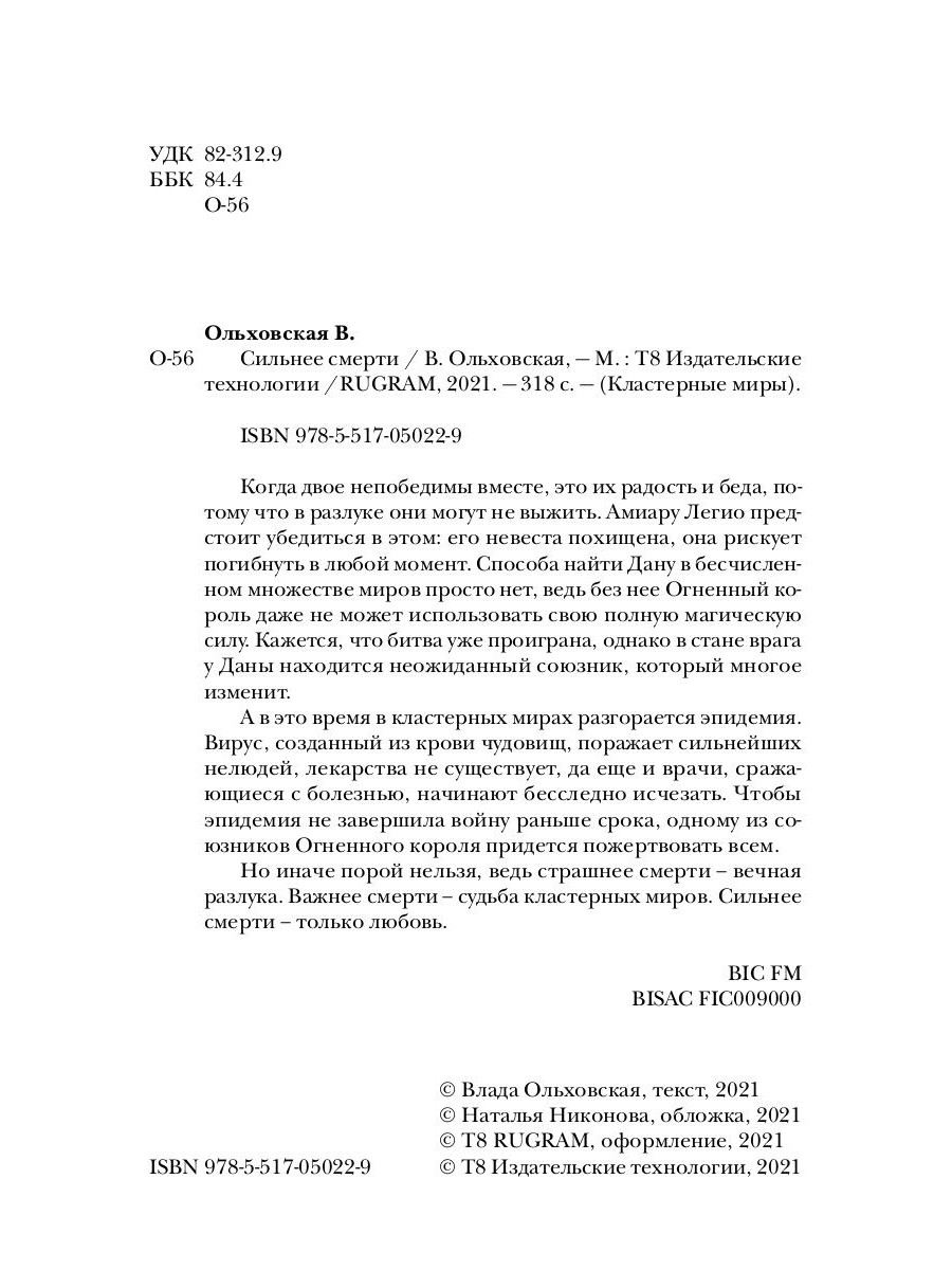 Когда двое непобедимы вместе, это их радость и беда, потому что в разлуке они могут не выжить. Амиару Легио предстоит убедиться в этом: его невеста похищена, она рискует погибнуть в любой момент. Способа найти Дану в бесчисленном множестве миров просто нет, ведь без нее Огненный король даже не может использовать свою полную магическую силу. Кажется, что битва уже проиграна, однако в стане врага у Даны находится неожиданный союзник, который многое изменит. А в это время в кластерных мирах разгорается эпидемия. Вирус, созданный из крови чудовищ, поражает сильнейших нелюдей, лекарства не существует, да еще и врачи, сражающиеся с болезнью, начинают бесследно исчезать. Чтобы эпидемия не завершила войну раньше срока, одному из союзников Огненного короля придется пожертвовать всем. Но иначе порой нельзя, ведь страшнее смерти - вечная разлука. Важнее смерти - судьба кластерных миров. Сильнее смерти - только любовь.| Издательство | Т8 RUGRAM |