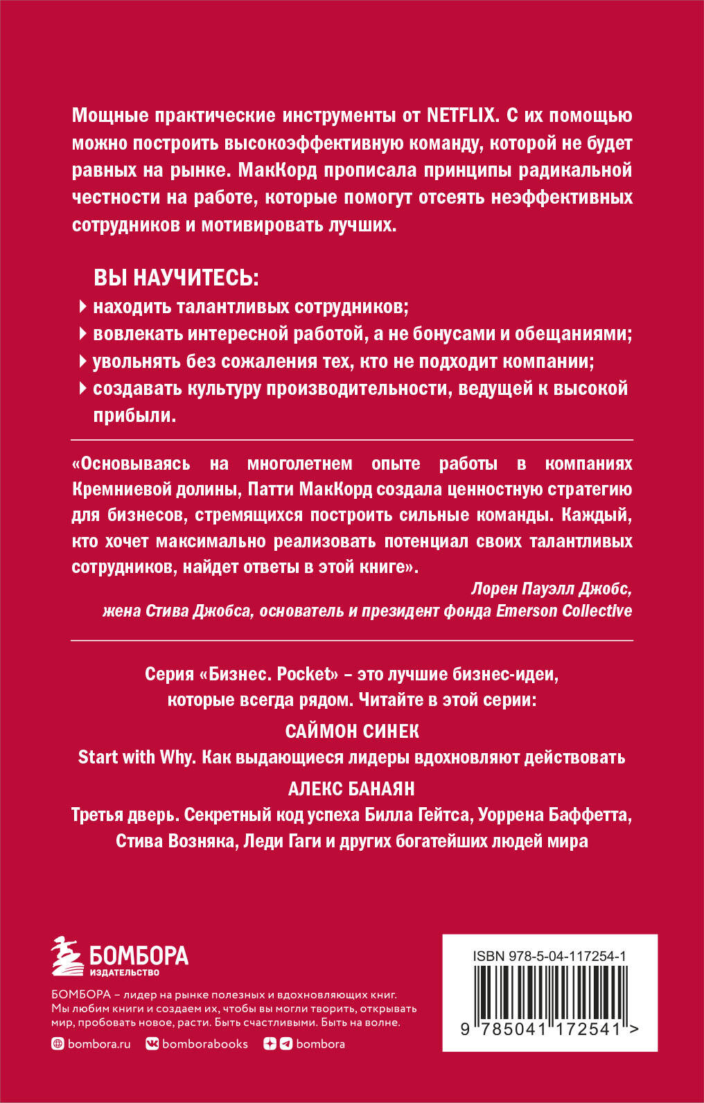 Мощные практические инструменты от Netflix. С их помощью можно построить высокоэффективную команду, которой не будет равных на рынке. МакКорд прописала принципы радикальной честности на работе, которые помогут отсеять неэффективных сотрудников и мотивировать лучших. Вы научитесь: - находить талантливых сотрудников; - вовлекать интересной работой, а не бонусами и обещаниями; - увольнять без сожаления тех, кто не подходит компании; - создадите культуру производительности, ведущей к высокой прибыли. Отзывы «Феерическая книга! Просветительское путешествие стартапа, опирающегося на традиционное управление». - Рид Хастингс, CEO Netflix «Основываясь на многолетнем опыте работы в компаниях Кремниевой долины, Патти МакКорд создала ценностную стратегию для бизнесов, стремящихся построить сильные команды. Каждый, кто хочет максимально реализовать потенциал своих талантливых сотрудников, найдет ответы в этой книге». - Лорен Пауэлл Джобс, жена Стива Джобса, основатель и президент фонда Emerson Collective| Издательство | ООО "Издательство "Эксмо" |