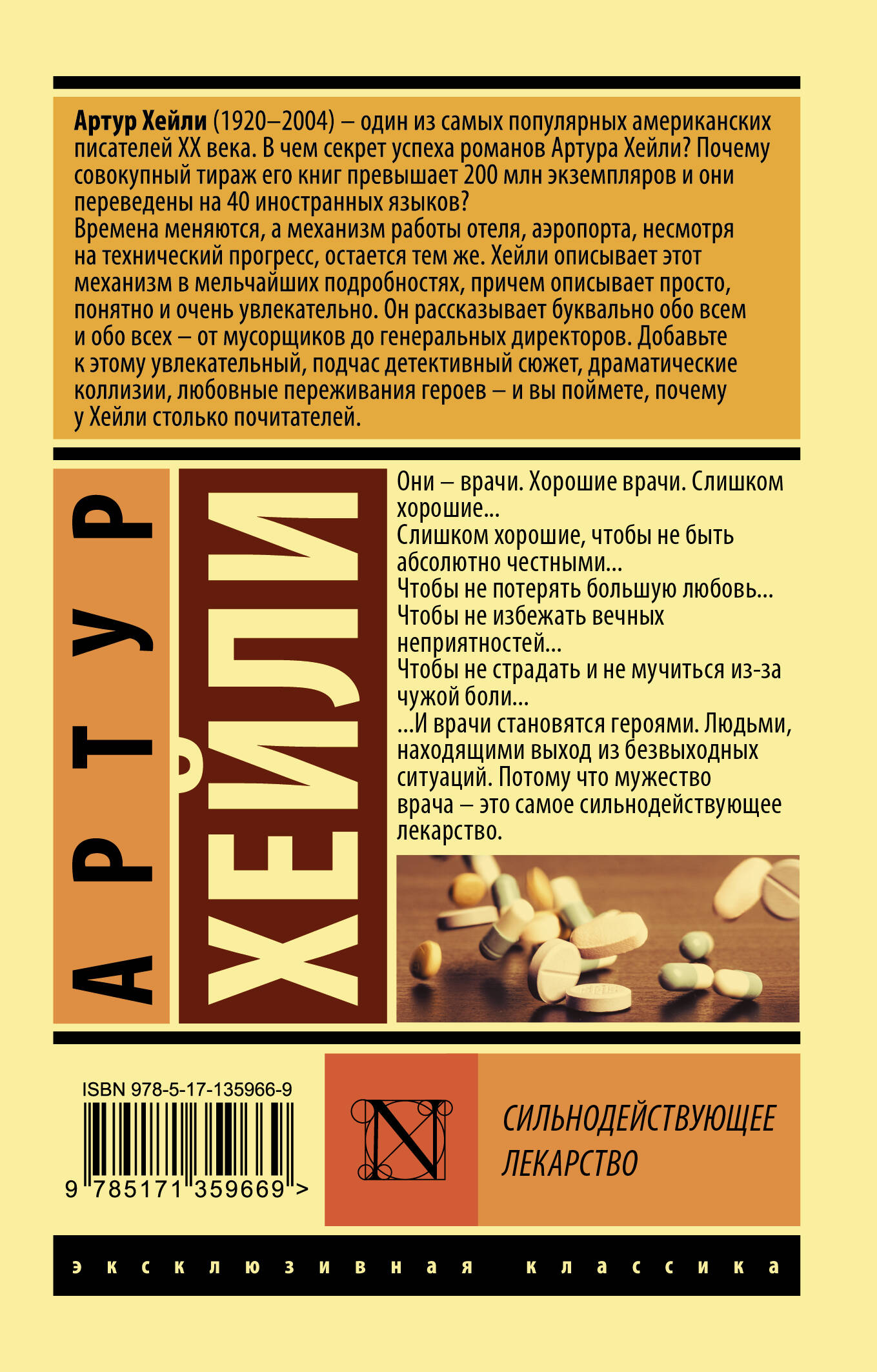 Что сделало Артура Хейли настолько популярным, что заставляет миллионы людей снова и снова возвращаться к его произведениям? Все просто: во всех своих книгах он, точно под микроскопом, изучал самые разные профессиональные сообщества людей. …Банк, отель, аэропорт, газетная редакция, больница, самолет, полицейский участок, - Хейли заставляет читателя стать одним из сотрудников, одним из винтиков машины, составляющей единое целое. Его романы можно читать ради увлекательного острого сюжета, - но главное в них всегда люди. Люди, на месте которых мог бы оказаться каждый из нас. Их реакции. Их страсти, интриги, их любовь и ненависть, их эгоизм, мужество - и воля к жизни. Они - врачи. Хорошие врачи. Слишком хорошие... Слишком хорошие, чтобы не быть абсолютно честными... Чтобы не потерять большую любовь... Чтобы не избежать вечных неприятностей... Чтобы не страдать и не мучиться из-за чужой боли... ...И врачи становятся героями. Людьми, находящими выход из безвыходных ситуаций. Потому что мужество врача - это самое сильнодействующее лекарство.