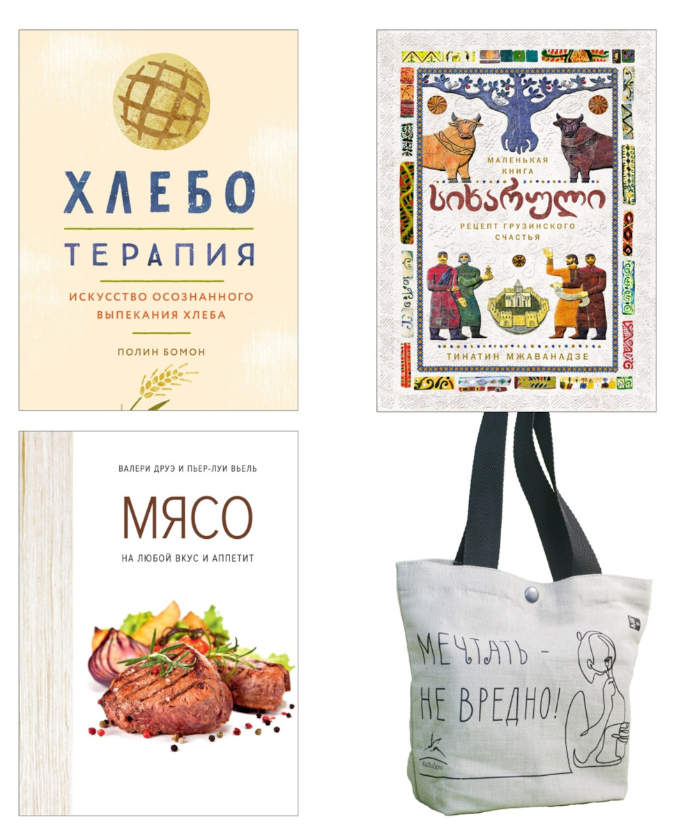 Включает 3 книги в удобном мини-формате, наполненных яркими фотографиями и простыми рецептами. Что входит в комплект? 1. «Мясо. На любой вкус и аппетит» В книге представлены практичные рецепты аппетитных блюд из различных видов мяса - говядины, телятины, свинины и баранины. Мясо жареное, тушеное, рубленое, запеченное - список представленных рецептов разнообразен. Авторы дополнили этот ассортимент блюдами из субпродуктов и отличными рецептами несложных, но очень интересных соусов. 2. «Хлеботерапия. Искусство осознанного выпекания хлеба». Полин Бомон, психолог и мать шестерых детей, обнаружила, что хлебопечение - это не только увлекательное хобби и проявление любви к близким, но и мощный инструмент самотерапии. Этот успокаивающий ритуал защищает нас от стресса и способствует обретению душевного равновесия и гармонии. 3. «СИХАРУЛИ: Рецепт грузинского счастья». Книга о гостеприимстве, вкусной еде, радости от застолья и многом другом. Но центральное место книги занимают национальные грузинские рецепты - их очень много, и они очень разнообразные, каждый из которых приправлен советом и зачастую юмором. По-грузински радость - сихарули. Дополнительный бонус - маленький шоппер «Мечтать не вредно!» с кнопкой. Стильный шоппер станет прекрасным дополнением к вашему подарочному набору. Компактный размер делает шоппер универсальным аксессуаром для различных целей, будь то ношение книг с собой, упаковка подарка или хранение личных вещей. Набор может стать оригинальным презентом на Новый год, день рождения, 14 февраля, 8 марта и другие праздники. Подойдет в качестве подарка мужчине и женщине, коллеге, парню и девушке, маме и папе, любимому человеку, брату и сестре, другу и подруге.