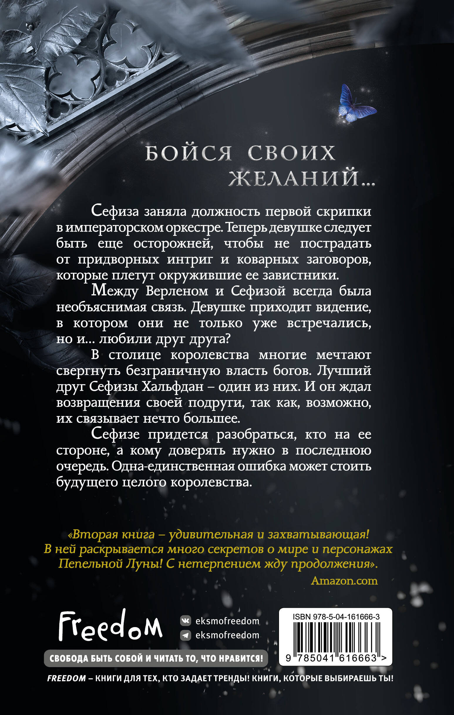 Ошеломляющая история в стиле стимпанк! Жестокие боги и люди с механическими телами на страницах этого мрачного фэнтези-романа. Стальной город, где нет ничего живого… и лишь пепел витает в воздухе! Интересное построение мира, неожиданный сюжет и неординарные характеры героев. Сефиза заняла должность первой скрипки в императорском оркестре. Теперь девушке следует быть еще осторожней, чтобы не пострадать от придворных интриг и коварных заговоров, которые плетут окружившие ее завистники. Между Верленом и Сефизой всегда была необъяснимая связь. Девушке приходит видение, в котором они не только уже встречались, но и… любили друг друга? В столице королевства многие мечтают свергнуть безграничную власть богов. Лучший друг Сефизы Хальфдан - один из них. И он ждал возвращения своей подруги, так как, возможно, их связывает нечто большее. Сефизе придется разобраться: кто на ее стороне, а кому доверять нужно в последнюю очередь. Одна-единственная ошибка может стоить будущего целого королевства. «Вторая книга - удивительная и захватывающая! В ней раскрывается много тайн о персонажах и мире Пепельной Луны!» - Amazon.com| Издательство | ООО "Издательство "Эксмо" |