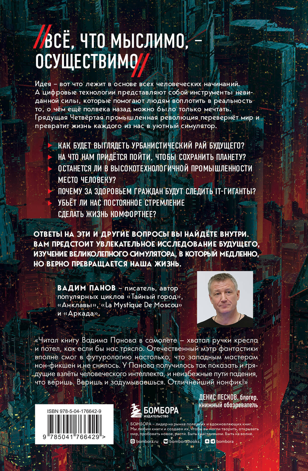 «Всё, что мыслимо - осуществимо». Идея - вот что лежит в основе всех человеческих начинаний. А цифровые технологии представляют собой инструменты невиданной силы, которые дают людям возможность воплотить в реальность то, о чём ещё полвека назад можно было только мечтать. Но как мы воспользуемся этими инструментами? Эпоху бурного технологического развития, в которую вступило человечество, автор называет Четвёртой революцией и считает, что наряду с Великой Французской, Великой Промышленной и Великой Русской революциями она перевернёт мир, индустрию и социальные отношения, превратит жизнь каждого из нас в уютный симулятор и обеспечит переход от Homo Sapiens к Homo Servus. Четвёртая революция изменит абсолютно всё. • Как будет выглядеть урбанистический рай будущего? • На что нам придётся пойти, чтобы сохранить планету? • Останется ли в высокотехнологичной промышленности место человеку? • Почему за здоровьем граждан будут следить IT-гиганты? • Как научиться выживать в эпоху непрерывной слежки? • Убьёт ли нас постоянное стремление сделать жизнь комфортнее? Ответы на эти и другие вопросы вы найдёте в новой книге Вадима Панова. Вам предстоит увлекательное исследование будущего, изучение великолепного симулятора, в который медленно, но верно превращается наша жизнь, и получить ответ на вопрос: может ли Утопия быть безумной?| Издательство | ООО "Издательство "Эксмо" |