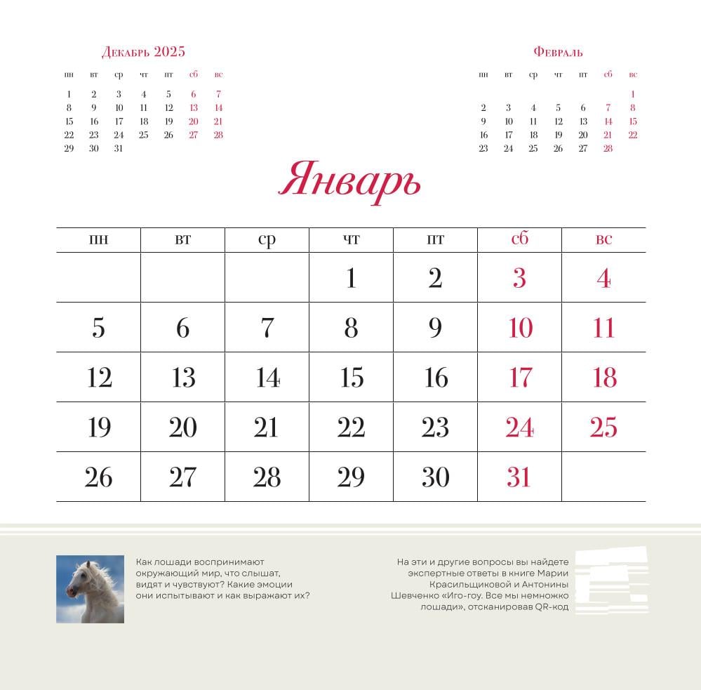 Символ 2026 года - огненная лошадь! Пусть этот календарь принесет вам удачу и процветание. Завораживающие фотографии лошадей наполнят ваш дом энергией и позитивом, а каждый месяц будет символизировать движение вперед и достижение целей! Отличный подарок для всех, кто любит этих грациозных животных - образ силы и неукротимого духа.| Издательство | АСТ |