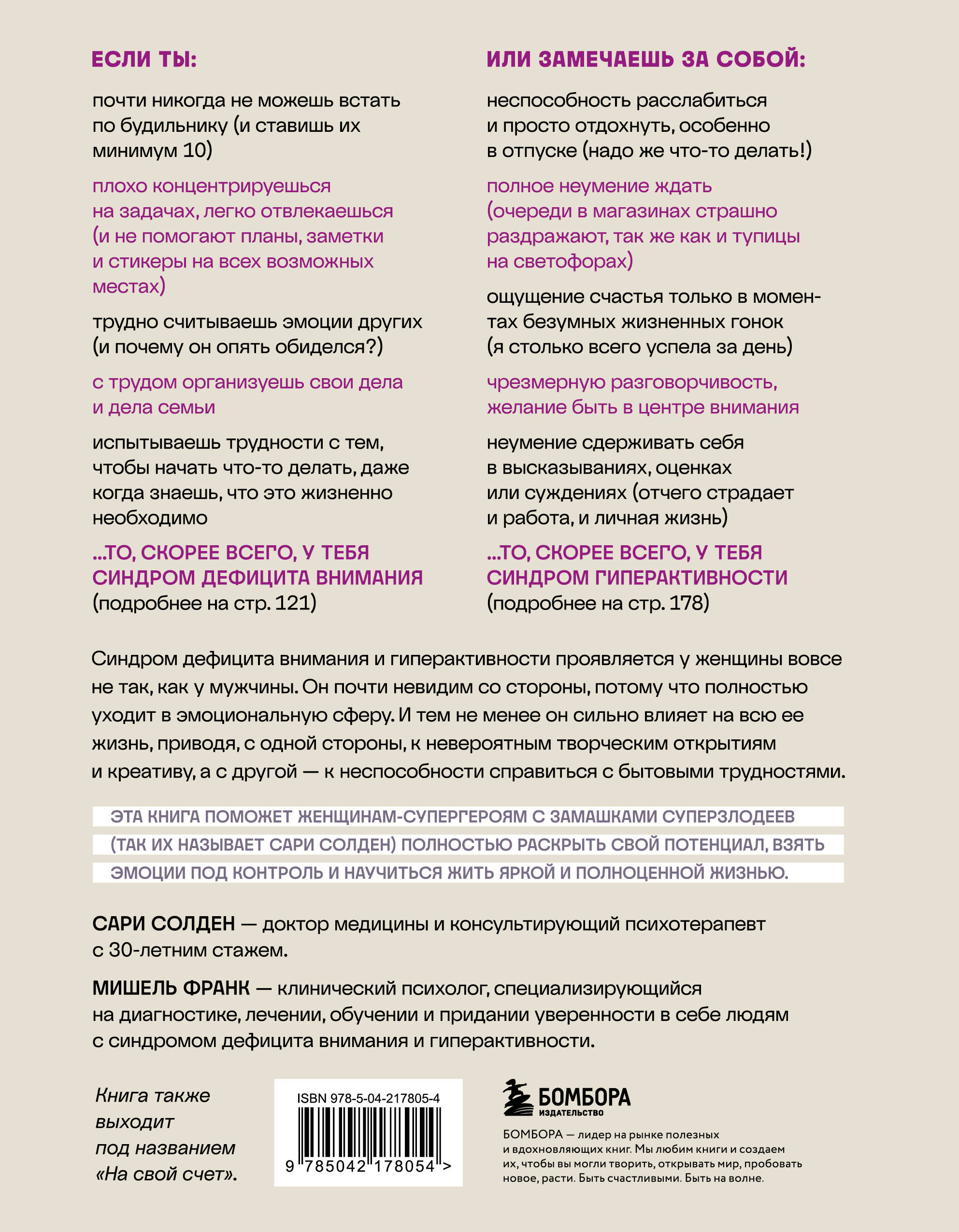 Новое оформление книги На свой счет! - Не можешь встать утром? Поставь себе несколько будильников! - Спасибо, кэп. Интересно, люди, у которых все нормально с концентрацией, правда думают, что вы не пробовали ставить себе сотни будильников или вести записи, а еще оставлять напоминалки на каждом углу? Но это не помогает. Дела неделями откладываются в долгий ящик, счета остаются неоплаченными, а утренний поход на работу завершается очередным опозданием. Такое состояние называется синдромом дефицита внимания. И полярная ситуация: вы не можете ждать - очереди или болтовня не по делу вас дико раздражают. На дороге вы беситесь, если человек перед вами держит слишком большую дистанцию. Вы не умеете терпеть, быстро ощущаете ярость. Но самое главное - вам все время куда-то надо. Если мир не несется с оглушительной скоростью, если не требуется переделать тысячу дел одновременно, вы испытываете пустоту, бессмысленность происходящего. Отдых вы осознаете как бесполезно потраченное время. Так ощущают себя люди с синдромом гиперактивности. Два этих состояния - полярные полюса одного и того же - особенностей развития мозга. Они не являются заболеванием в полной мере этого слова, но изрядно портят нам жизнь. Во всем мире их называют СДВГ, а в России - плохим характером. Эта книга поможет разобраться, почему вы такая, какая есть. И научит справляться с трудностями, которые неизбежно сопровождают вас. Методики, разработанные авторами, способны организовать людей с дефицитом внимания и притормозить гиперактивных персонажей. А еще вас ждут десятки тестов для определения своего состояния и самоконтроля после прохождения программ реабилитации.
