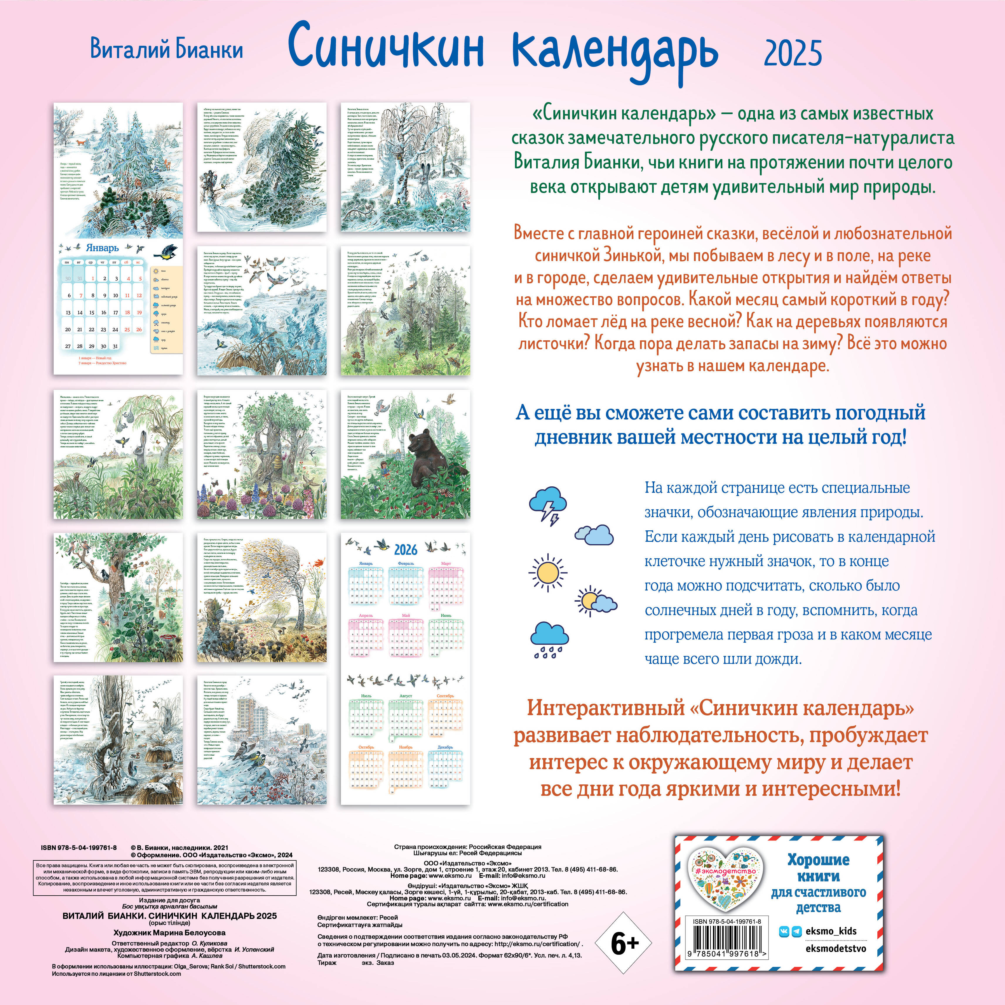 «Синичкин календарь» - самая известная сказка русского писателя-натуралиста Виталия Бианки. Вместе с любознательной синичкой Зинькой вы целый год будете наблюдать, что изменяется в природе в лесу, в поле, на реке и в городе, и сможете вести свой собственный погодный дневник. На каждой страничке есть значки с обозначением разных явлений природы. Если ежедневно проставлять их в крупных клеточках календарной сетки, то в конце года можно подсчитать количество солнечных и дождливых дней, вспомнить, когда выпал первый снег или прогремела первая гроза. Это разовьёт наблюдательность и мелкую моторику ребёнка, пробудит в нём интерес к природе. Нежные, атмосферные иллюстрации Марины Белоусовой помогут услышать пение птиц, журчание ручьёв и шелест дождя. Все государственные праздники выделены красным цветом. Упаковка - плотный целлофановый пакет с европодвесом.| Издательство | ООО "Издательство "Эксмо" |