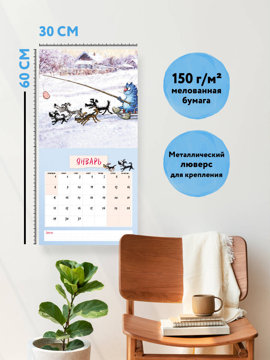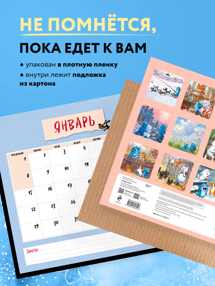 О серии: Наши настенные календари отличаются высоким качеством исполнения! Тщательно подобранные иллюстрации, напечатанные на глянцевой бумаге высочайшего качества, станут настоящим украшением дома, а в календарной сетке найдется место для ваших планов: большие клетки позволят делать записи и организовать свой год! В календаре также отмечены все государственные праздники. О календаре: Практичный и эстетичный, этот календарь каждый месяц будет радовать вас. Рина Зенюк - минская художница, автор знаменитых Синих Котов, завоевавших любовь тысяч поклонников в различных интернет-сообществах. Герои рисунков Рины Зенюк - веселые и серьезные, решительные, мечтательные, очень упитанные коты синего цвета - понравятся не только заядлым любителям котиков, но и тем, кто до этого был к ним равнодушен. Свой жанр художница определяет как «котизм». Синие котята гарантированно дарят хорошее настроение и не оставят равнодушным никого! Для кого: Для всех поклонников творчества Рины Зенюк и ее прекрасных синих котов! Технические параметры: - Тип календаря - настенный перекидной. - Год - 2024. - Календарная сетка - с разбивкой по месяцам. - Вид скрепления - скрепка. - Ширина - 30 см. - Высота - 30 см. - Внутренний блок - мелованная бумага 150 г/м2. - Подложка - плотный гофрокартон для поддержания формы. - Индивидуальная упаковка в плотный целлофановый пакет.